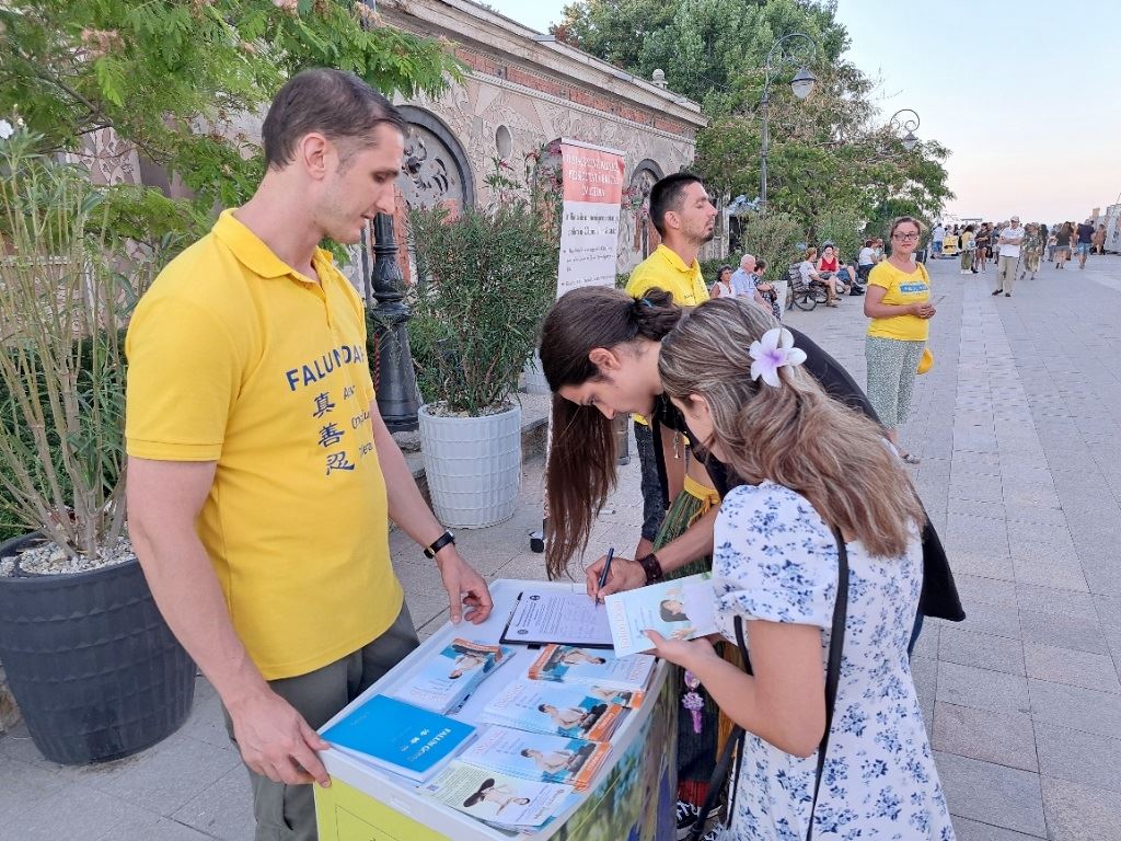 来自塞维林堡(Turnu Severin)的两名高中生卡罗尔(Carol)和路易莎(Luiza)看到传单后,立刻签了名。得知请愿书是要求停止强摘法轮功学员器官时,他们惊呼:“他们(中共)为了获取器官杀害(法轮功学员)!这太可怕了!”