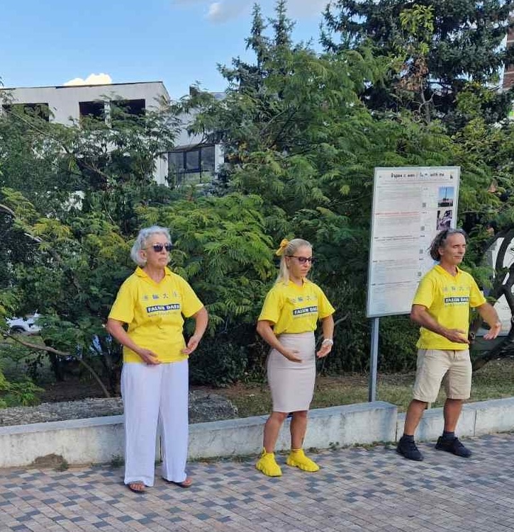 ![]() 图1~2:二零二四年八月十日,保加利亚部分法轮功学员在大特尔诺沃的中央邮局前组织了一场讲真相活动。图为法轮功学员在活动现场炼功。 |