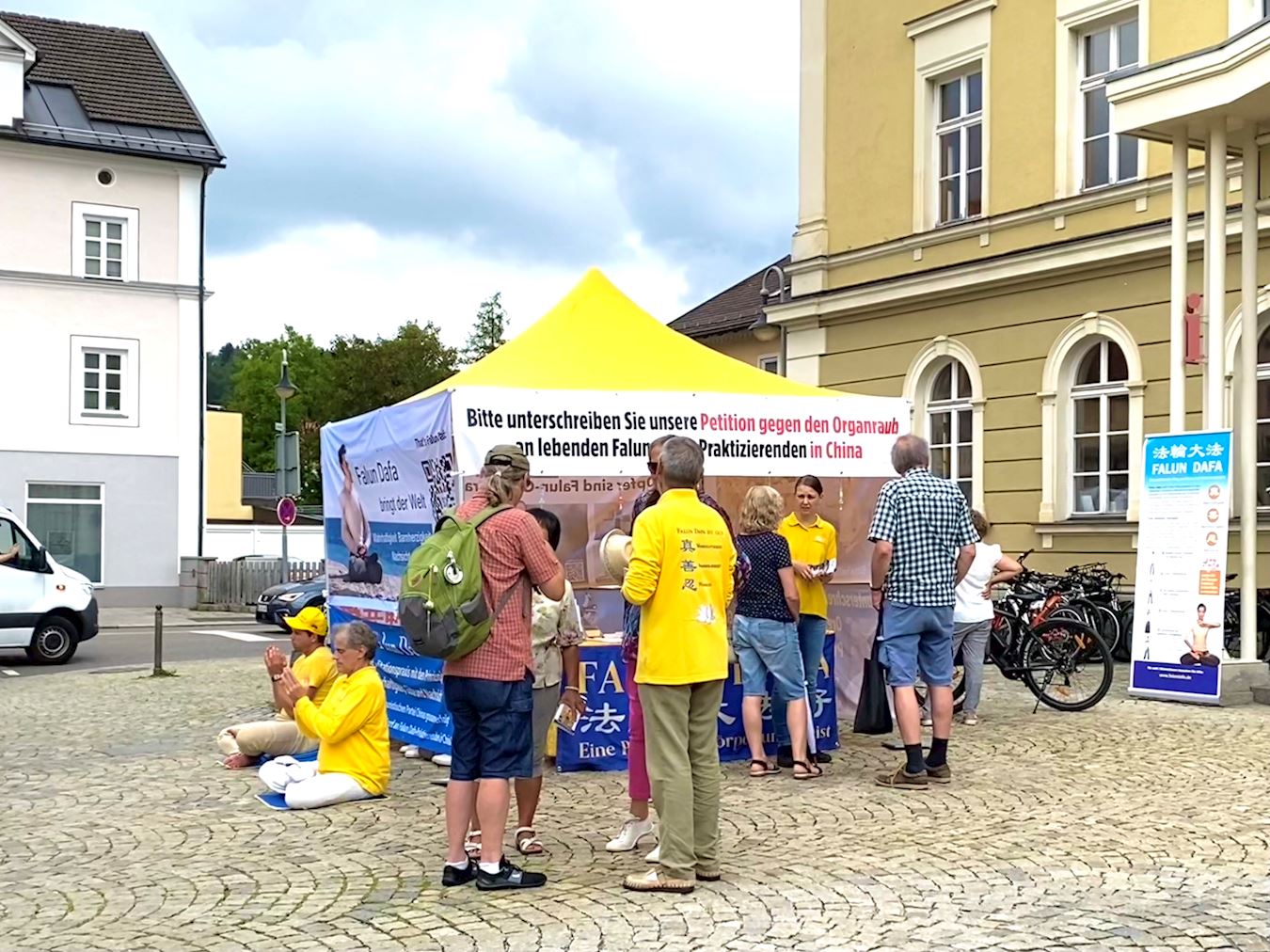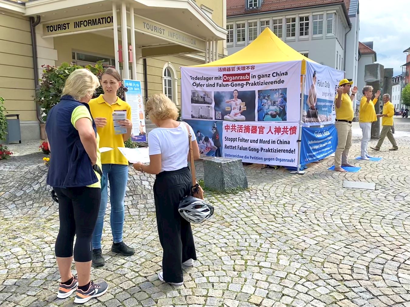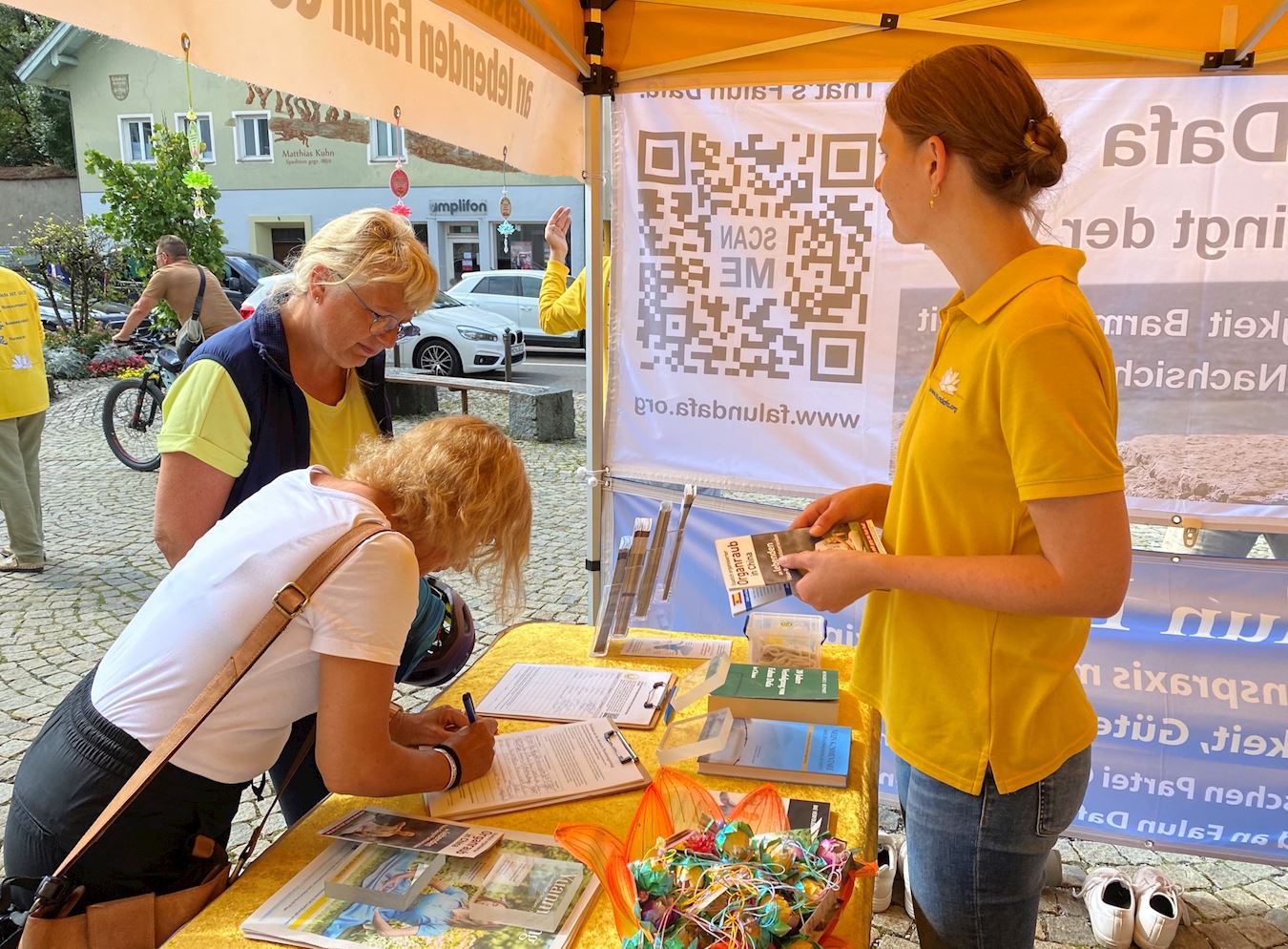 当地居民汉斯·辛德布兰特先生(Hans Hinterbrand)签名声援法轮功学员反迫害,他说自己就是想声援中国民众反迫害。他觉得法轮功学员的展位“非常美好,很平静,散发着平和的氛围”。