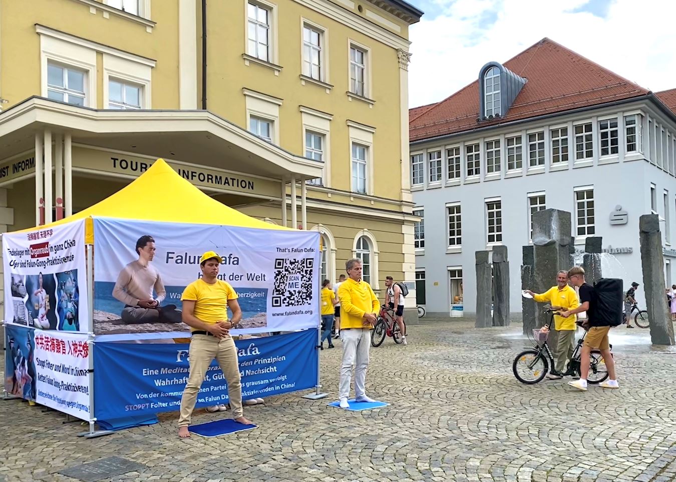 有一家从斯图加特来旅游的德国夫妇带着女儿,看到法轮功学员的展位后非常高兴,他们跟学员交谈了很久。先生表示,四年前他听说了法轮功,并听了法轮功创始人李洪志先生的九天班讲法,然后他开始学。