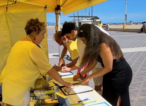 反迫害征签活动就在该城市的海滨大道附近的广场进行。由于是节假日,活动地点人来人往,当天讲真相活动时间是早十一点至晚十一点。来往市民及来自意大利、法国和英国等各国游客们,在了解法轮功真相后普遍对法轮功反迫害活动十分关注,纷纷表示支持法轮功并谴责中共的反人类罪行。