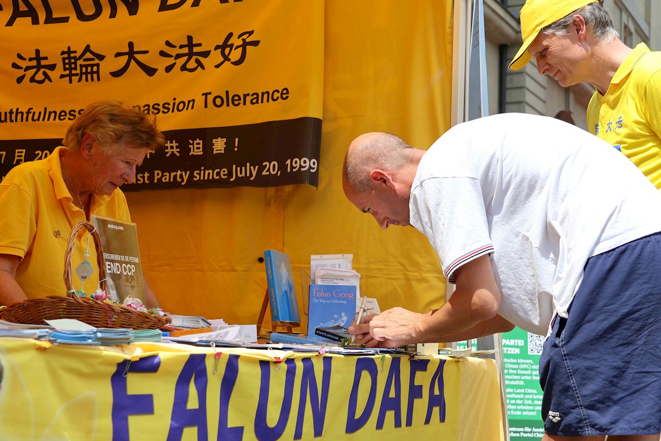 帕特里克·沃兹纳克-斯特拉瑟(Patrik Voznak-Strasser)在路过法轮功学员的活动现场时。他告诉学员:“我深受鼓舞,能感受到你们的坚定及齐心协力,共同为心中的目标努力。我从心里想支持你们,我想提供我的帮助。”