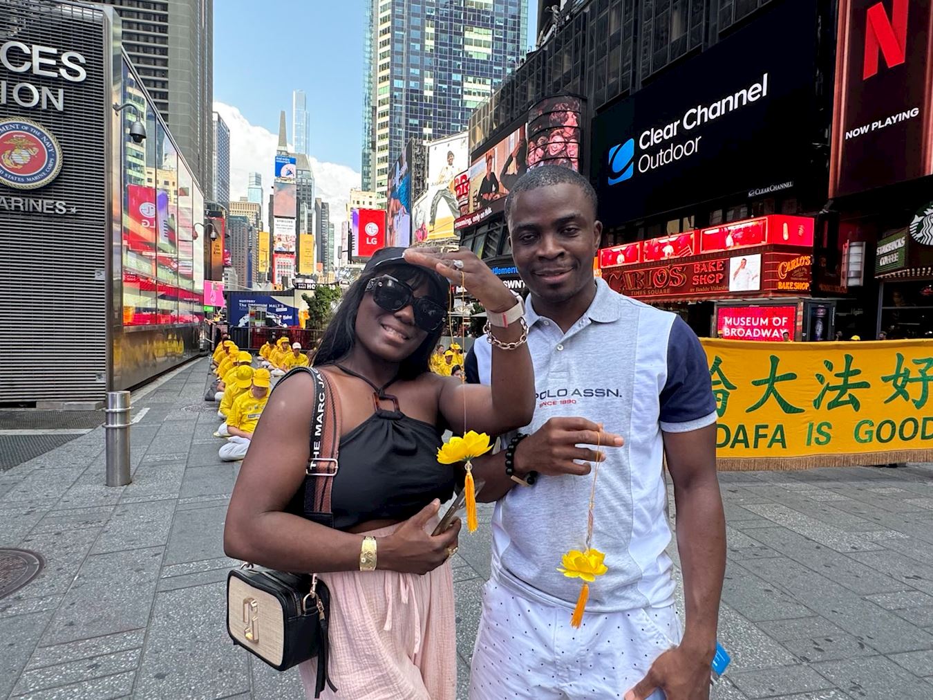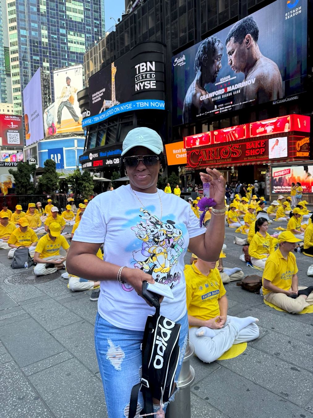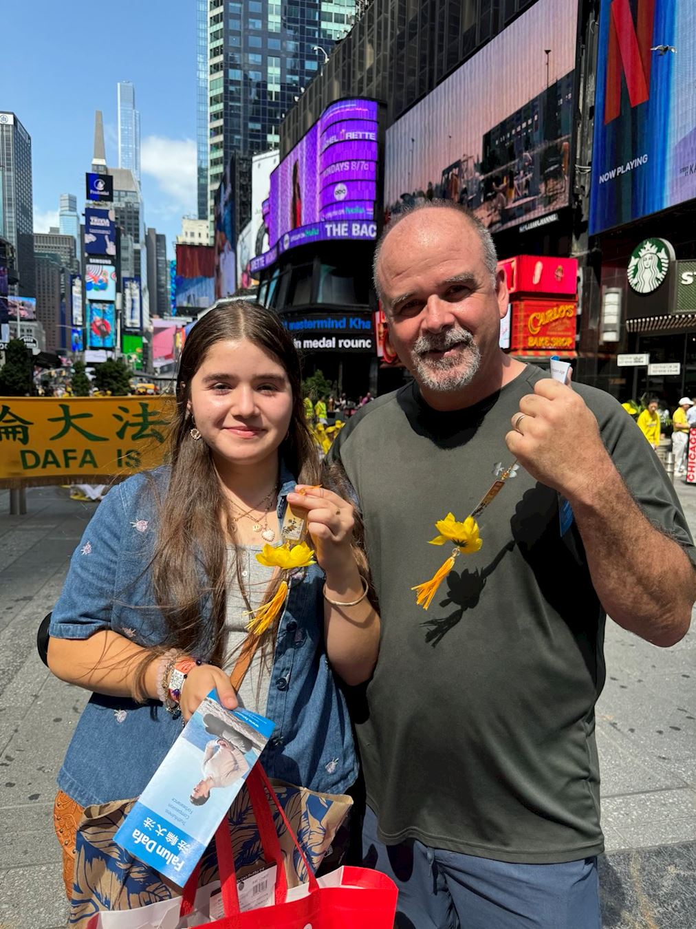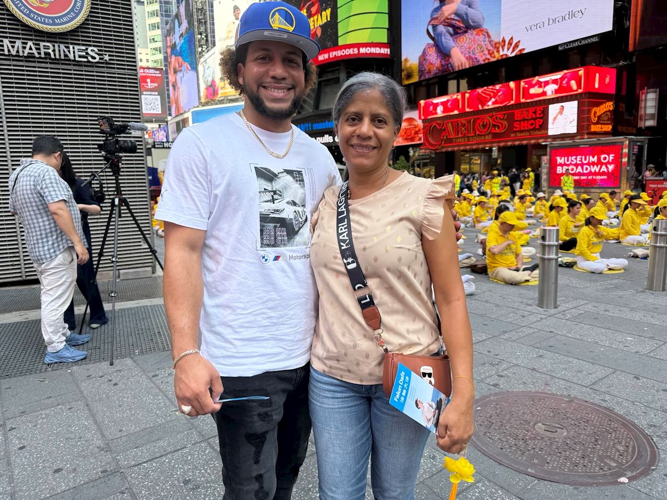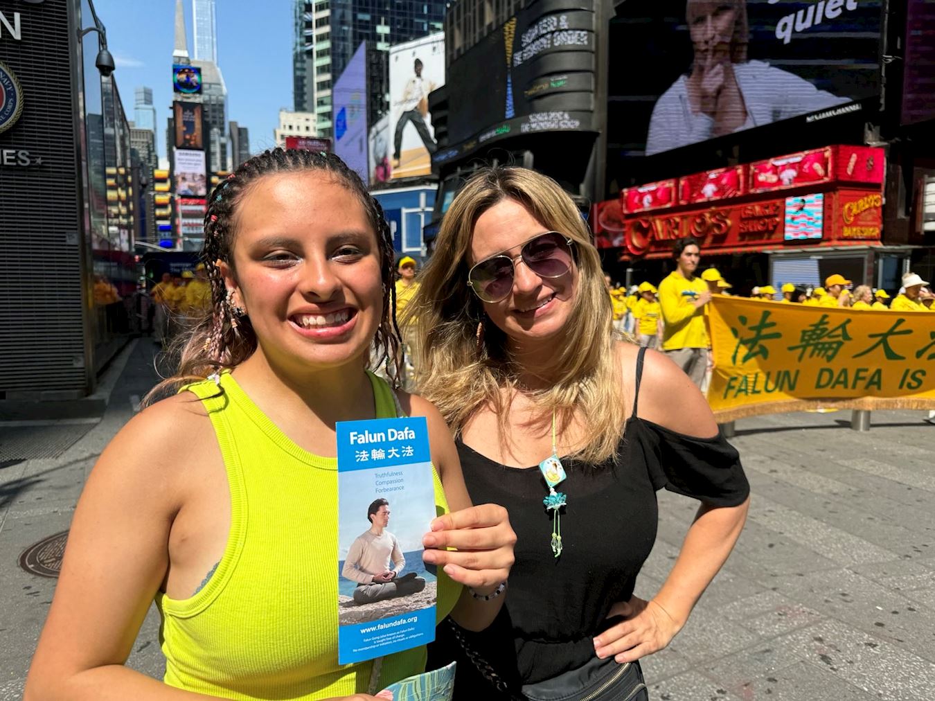 哥伦比亚游客莉莉安娜·赫拉南德克(Liliana Heranandec)和妈妈路过,看到这个盛况说:“这真是太神奇了,世界城市的中心,在纽约,看到这群人在炼功,对我们来说是很好的信息。”她母亲接着说:“法轮功的人非常平和善良,我觉得法轮大法是个非常好的功法,我对他们在中国受到的和不幸遭遇感到难过,希望更多的人能够站出来为他们发声。”