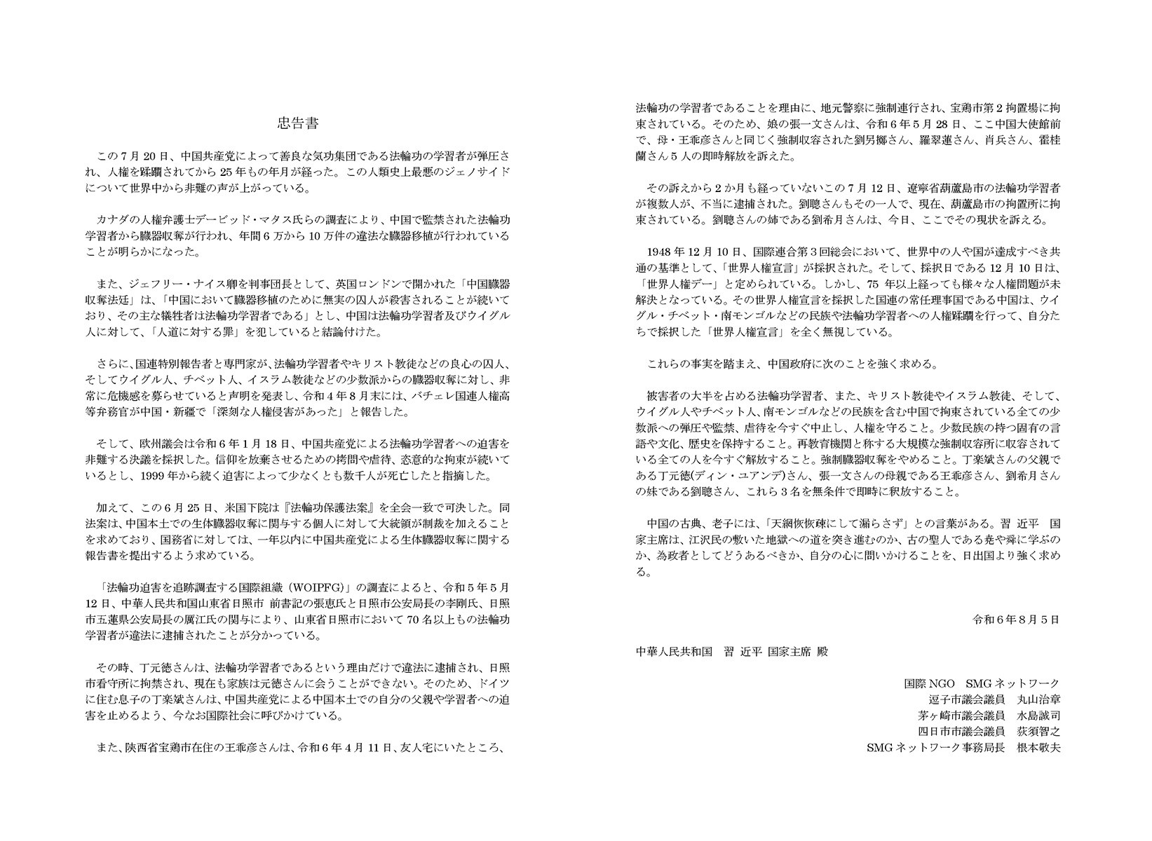 劝告信敦促中共立即停止对法轮功学员的迫害,并呼吁立即释放所有被非法关押的法轮功学员,立即停止活摘器官,无条件释放王乖彦和刘聪。