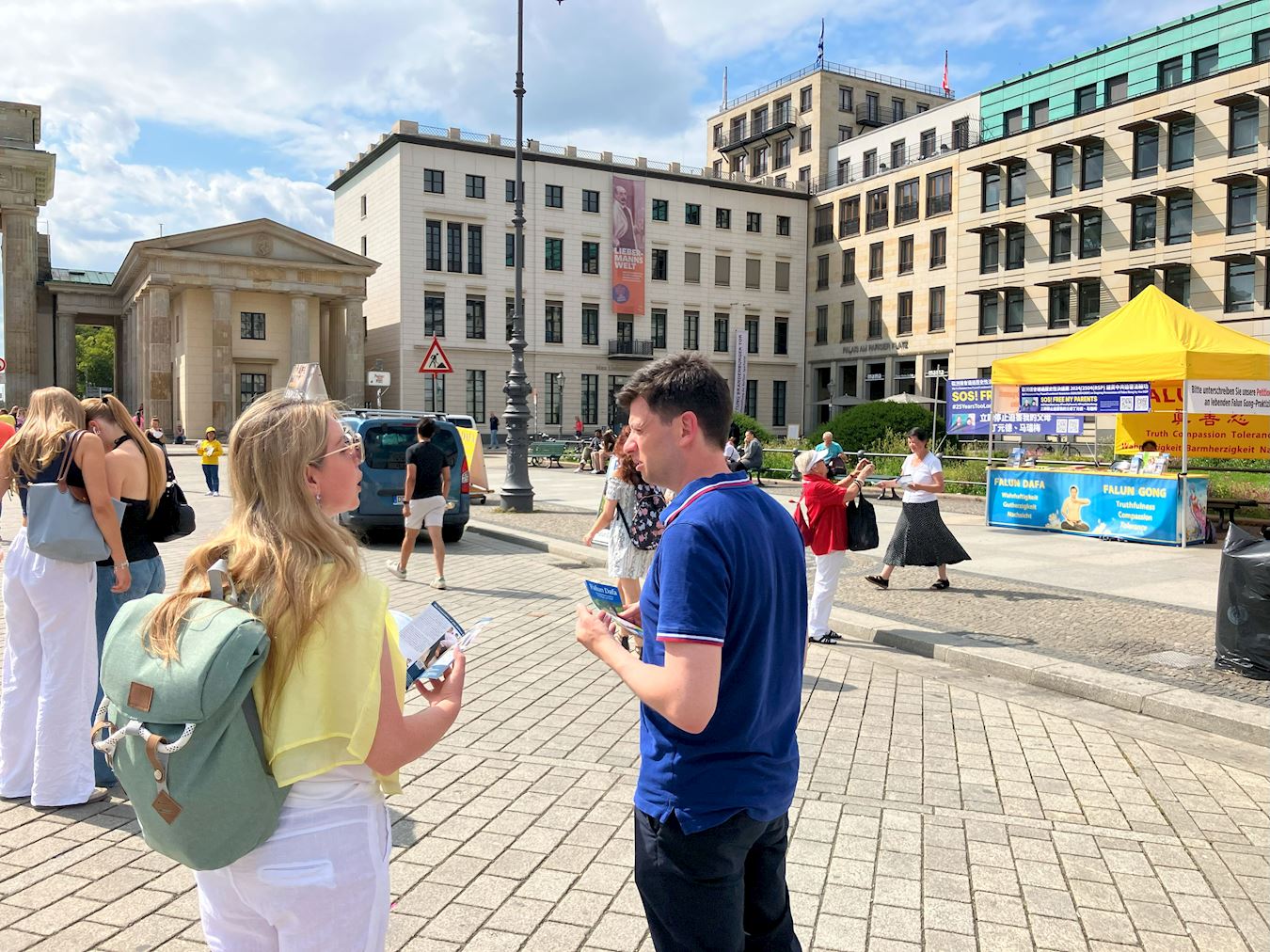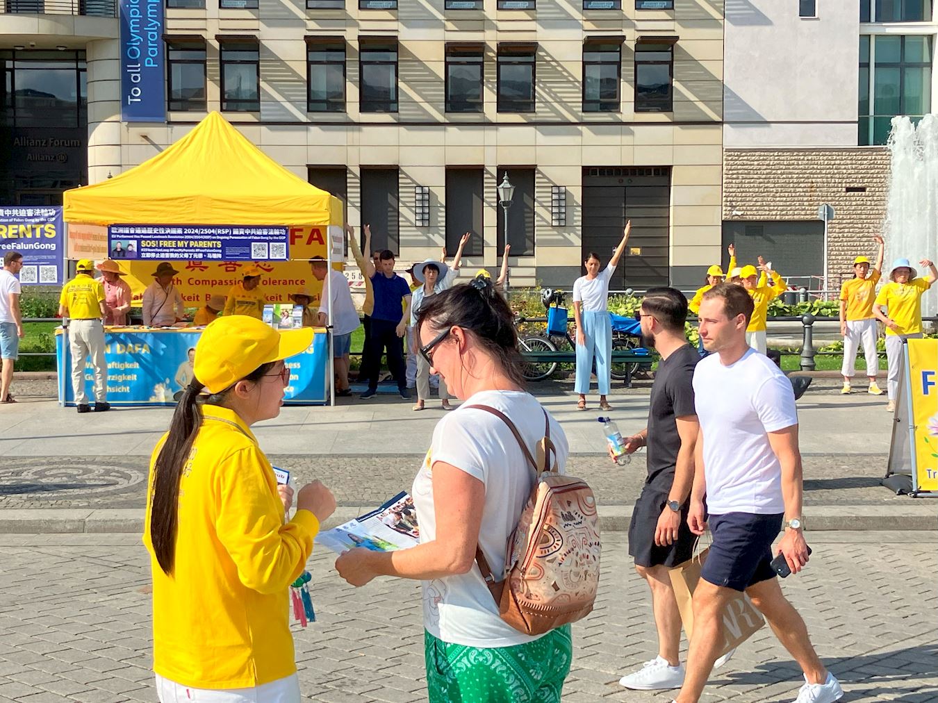 悠扬的法轮功炼功音乐和舒缓的炼功动作吸引了游客的注意力。他们有的人与分发真相传单的法轮功学员交谈,了解法轮功是什么,为什么会遭受长年的残酷迫害;有的人驻足观看学员展示的法轮功功法;有的人甚至拿出手机拍照和录影;还有的人站在正在炼功的法轮功学员旁边,跟随着他们一起尝试法轮功缓、慢、圆的炼功动作。