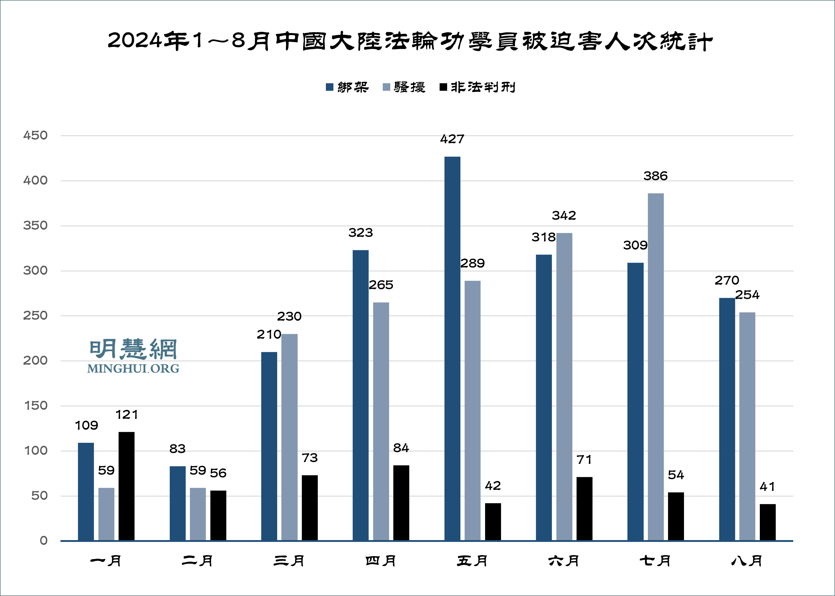 ![]() 图2:2024年1~8月中国大陆法轮功学员被迫害人次统计 |