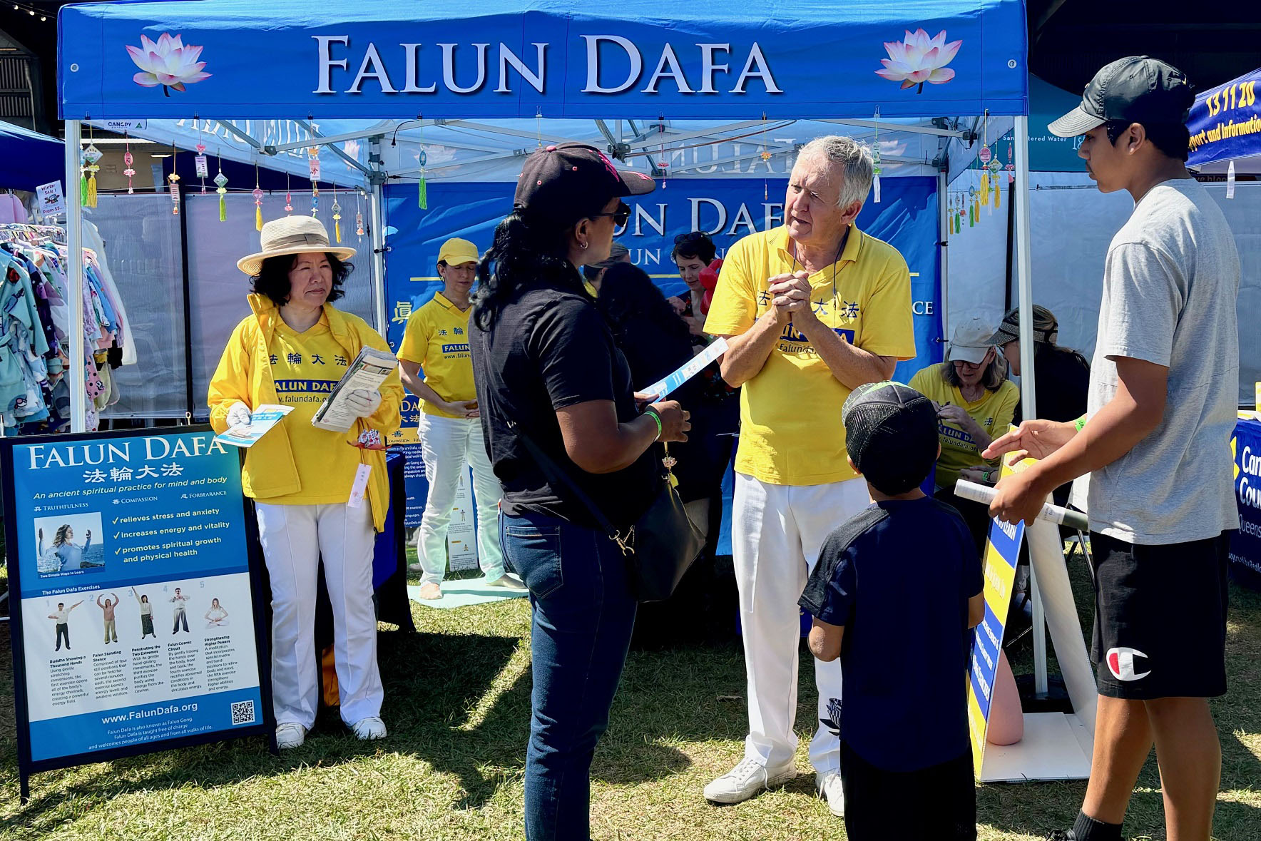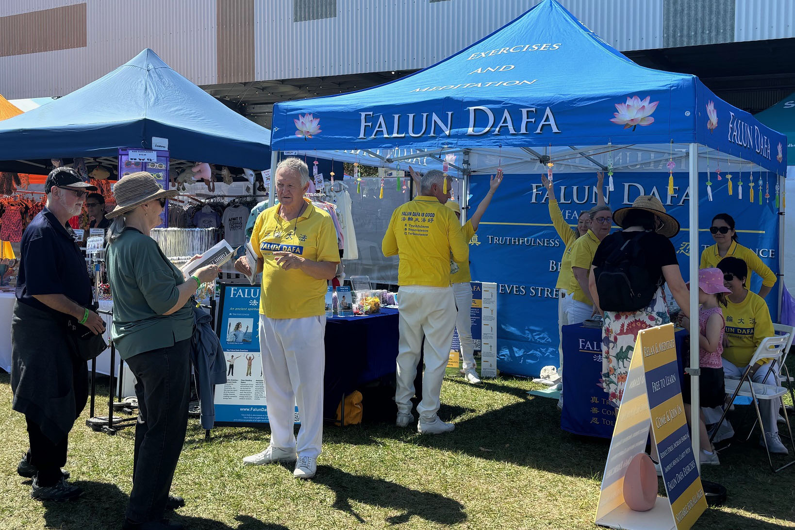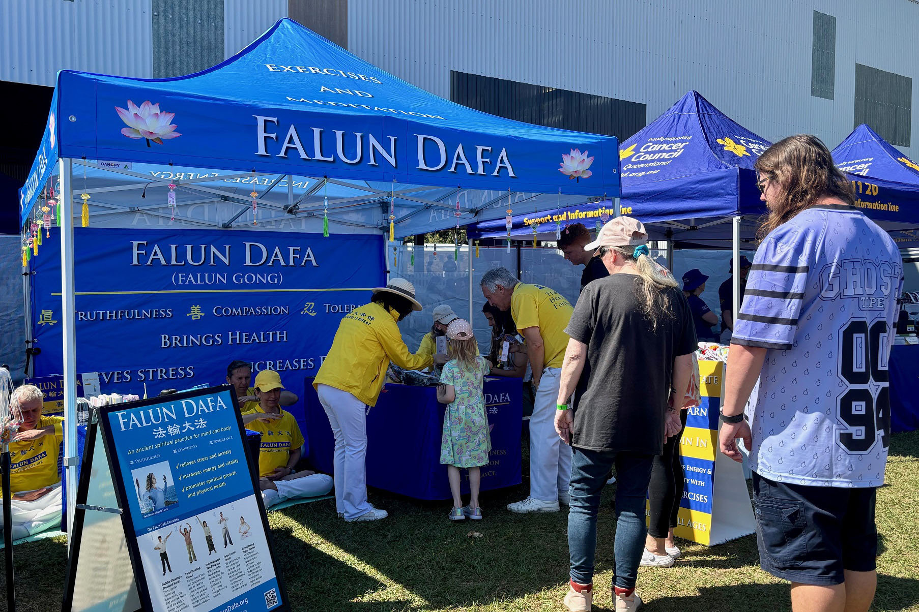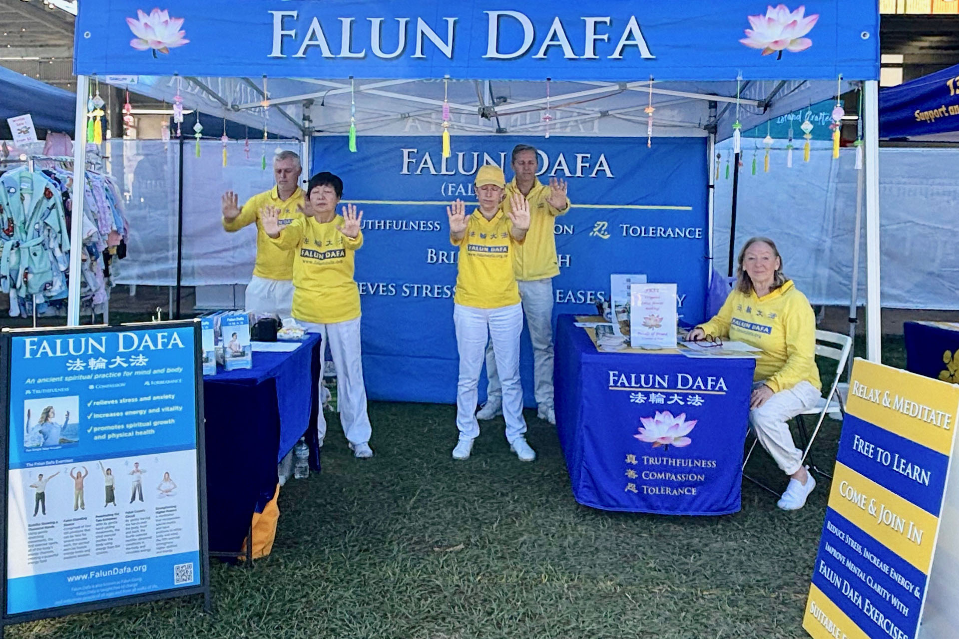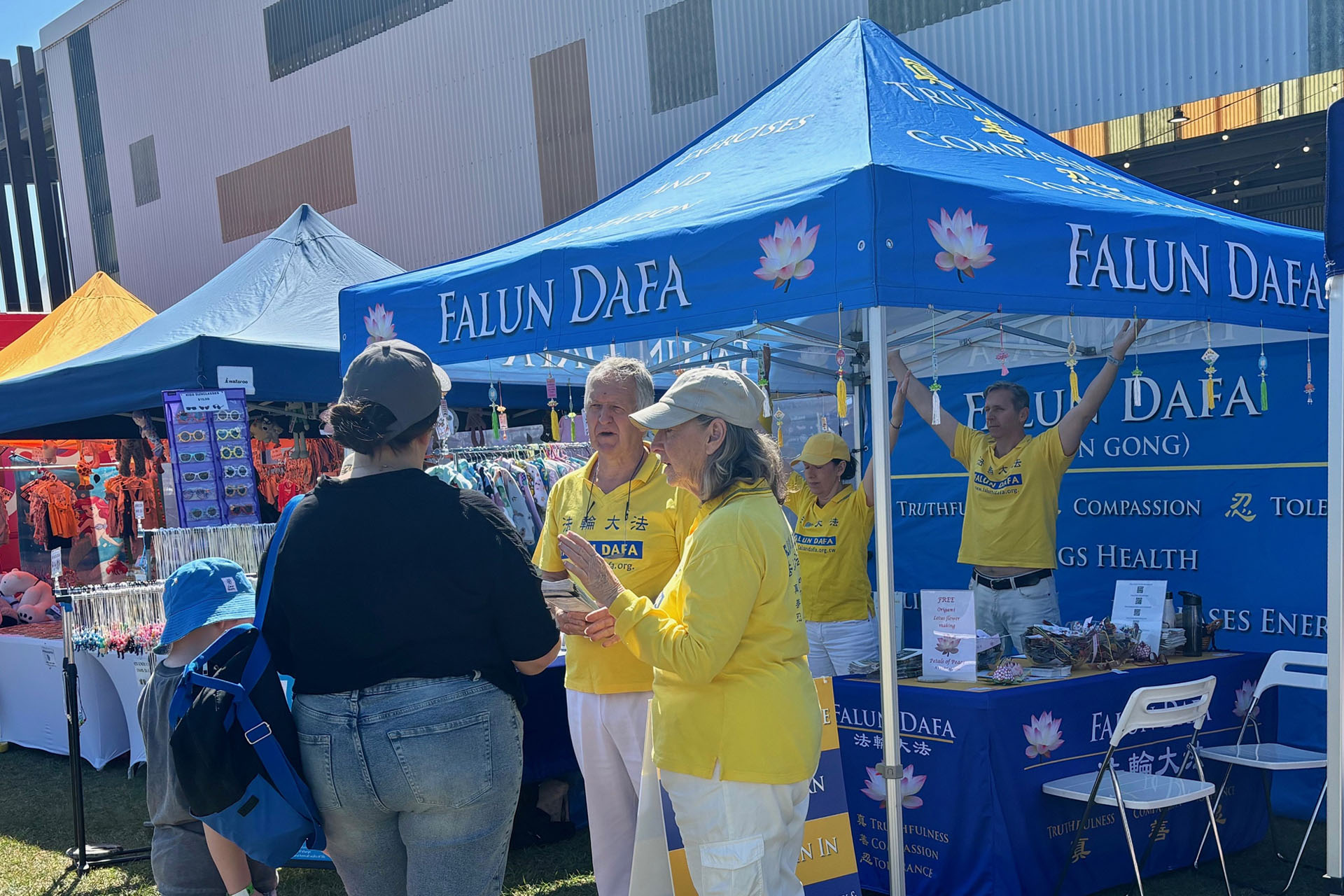 大量市民偕同亲朋好友来这里购物、娱乐和观赏琳琅满目的展位。明亮的法轮功展位吸引着民众前来了解真相并签名支持法轮功反迫害。