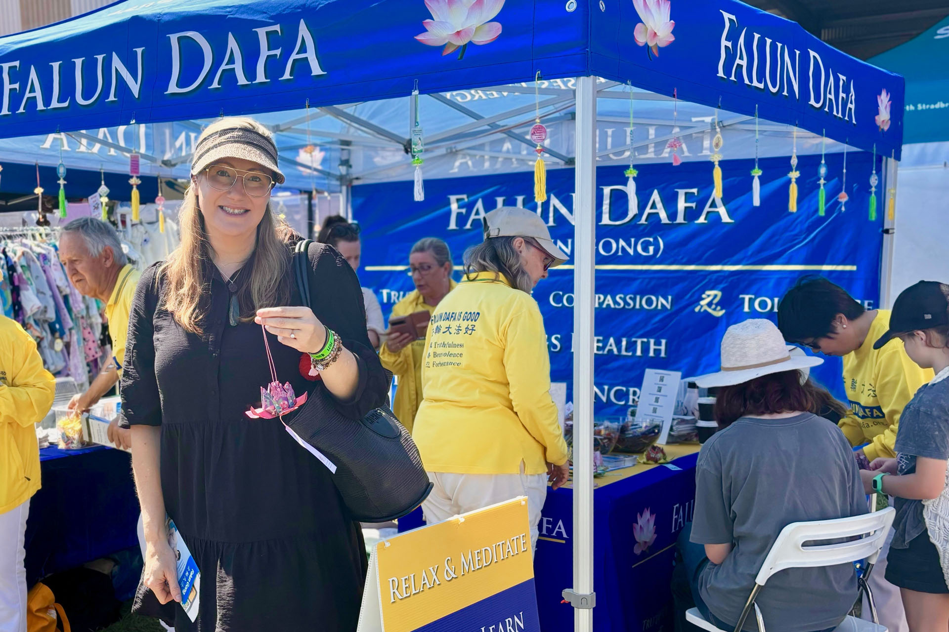 卡塔琳娜(Catarina)走过法轮功展位时,停下来前来了解法轮功的真相。她说:“是的,我觉得我之所以想停下来,是因为(法轮功的展位)看起来明亮而温馨。很开朗。”