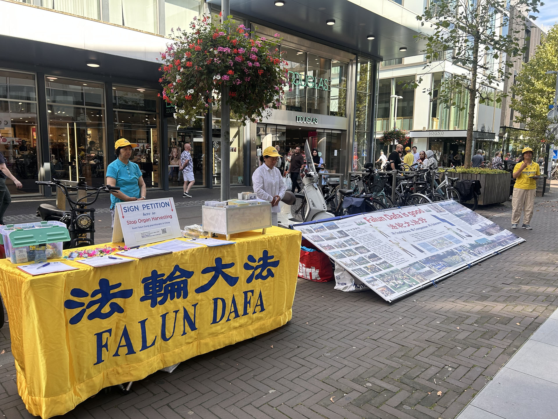 八月三十一日,学员们在哈勒姆市中心商业区布置介绍大法弘传世界和中共酷刑迫害法轮功的两块展板,向过往民众派发传单,征集反对活摘器官的签名。