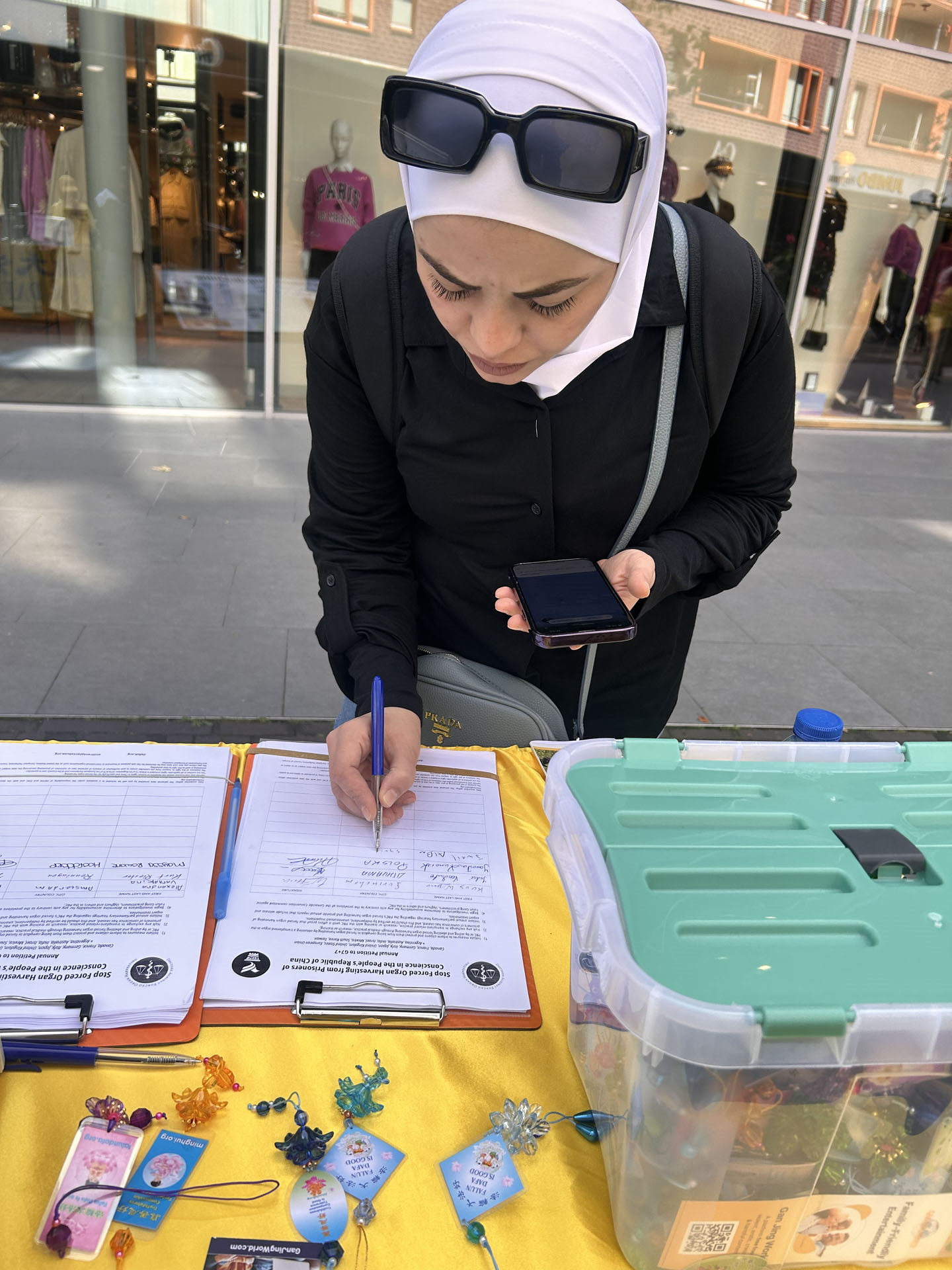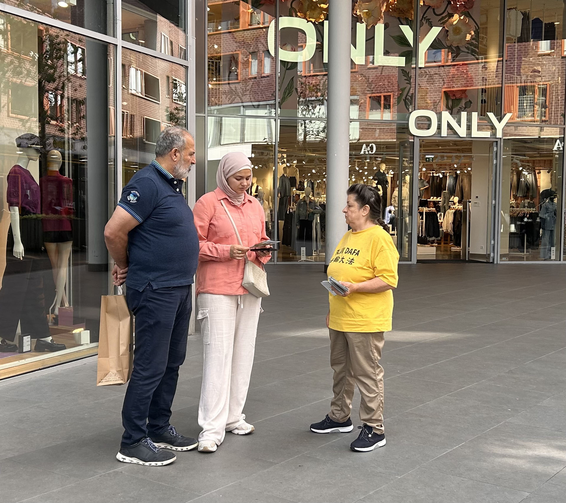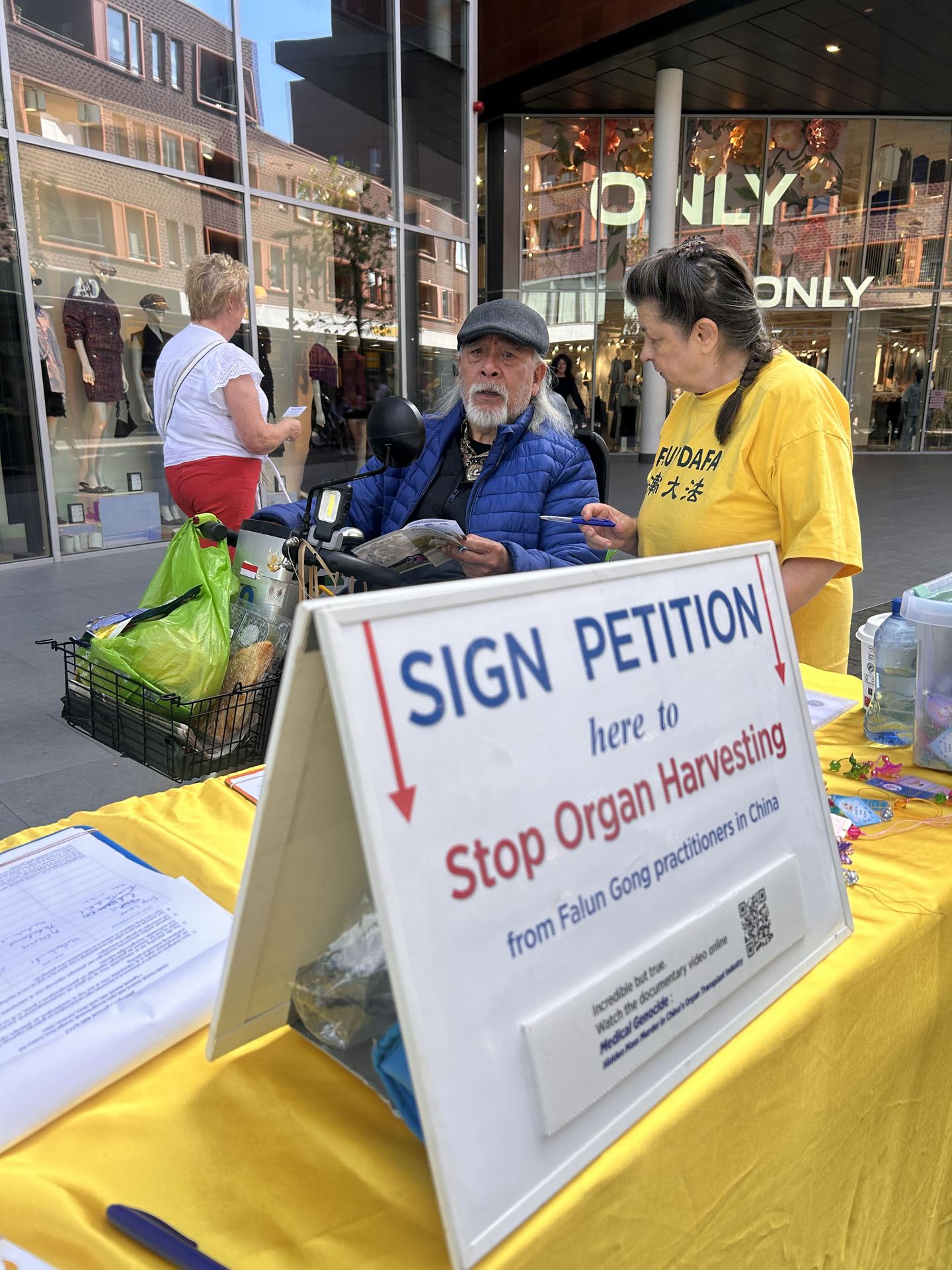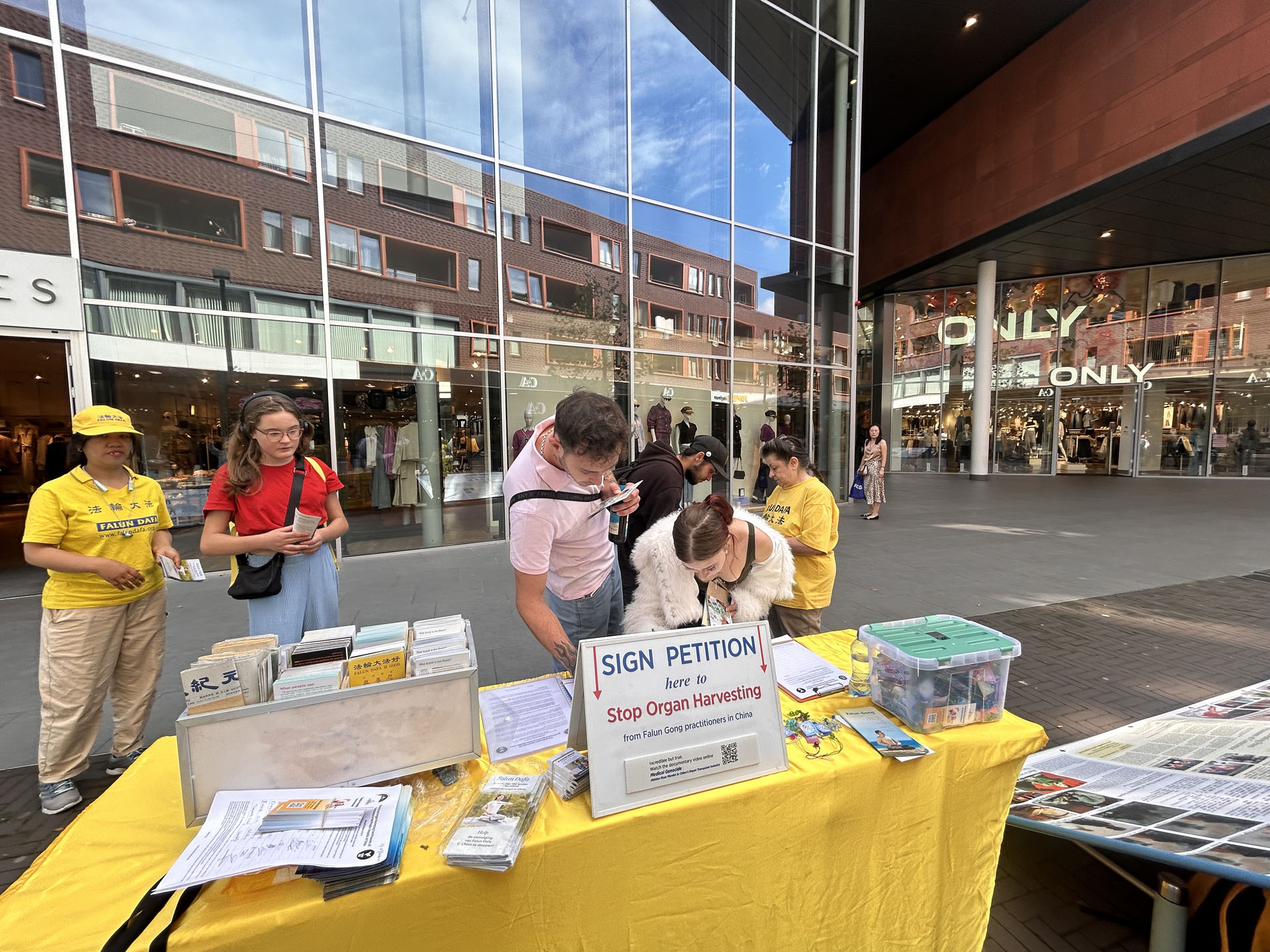 学员告诉她们,中共对法轮功修炼者的迫害已经长达二十五年,由于信息的封锁,展板上揭露出来的迫害案例只是冰山一角,两位荷兰女士毫不犹豫地在反对迫害的征签表上签名,并不断感谢学员:“这些信息非常重要,感谢你们做的这些事,感谢你们让我们知道这些!”