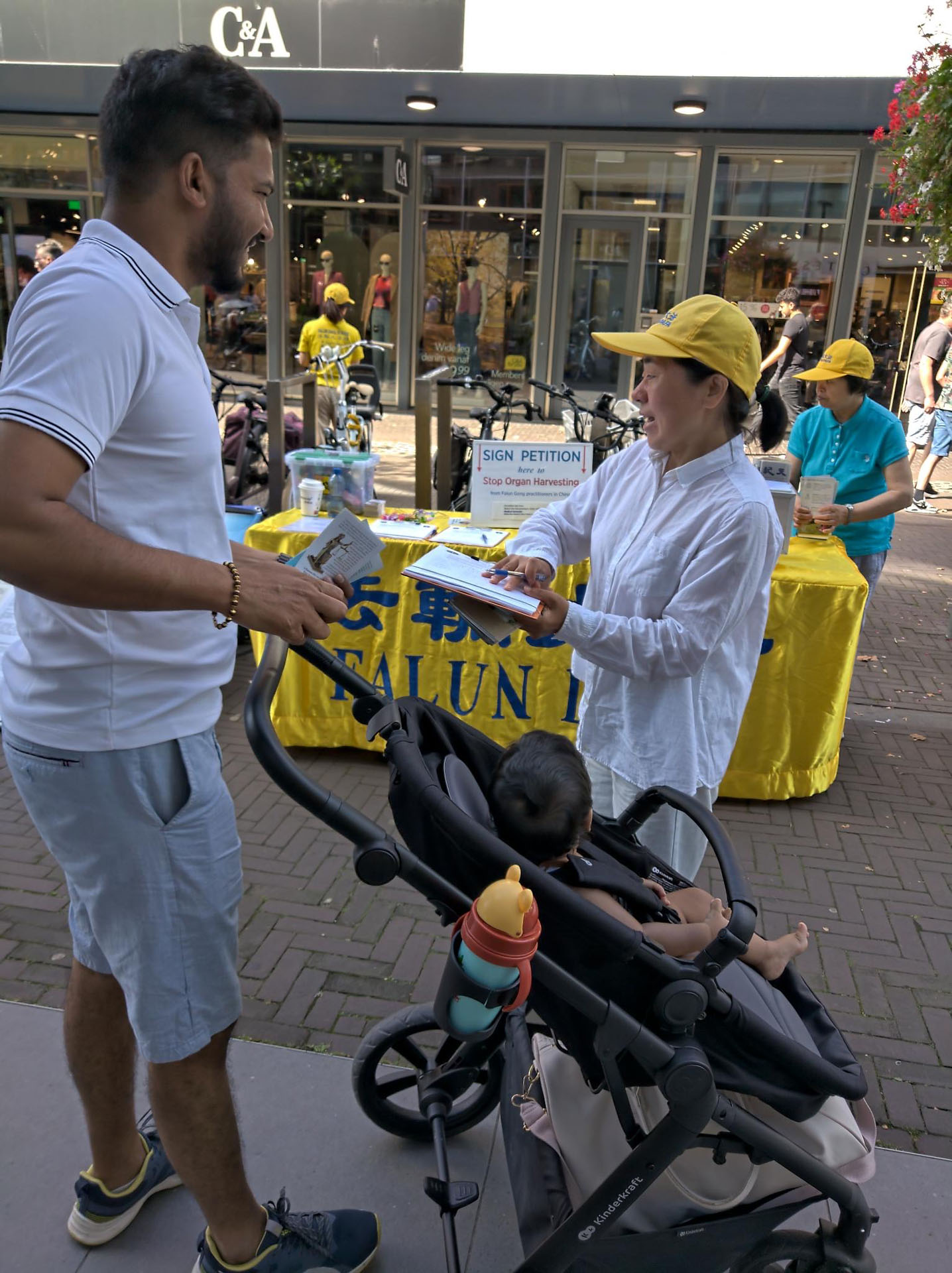 一对来自波兰的游客签名之后,向学员要了波兰语的大法网址,想了解更多真相信息;一个菲律宾女士询问自己的签名会有什么帮助,学员给她看了反对强摘器官医生组织(DAFOH)向七国集团(G7+7)发起的请愿书,她马上在征签表上签名表示反对迫害。