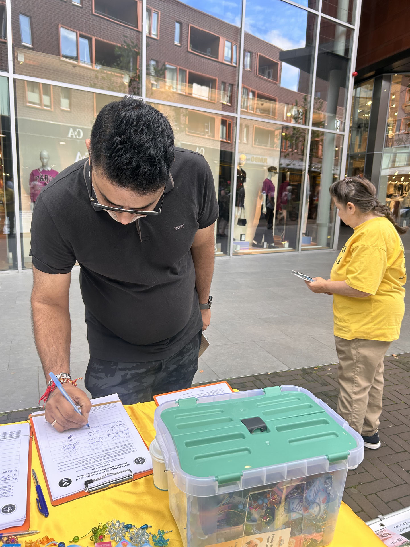 罗本(Ruben)和泰姆(Thijm)是十几岁的男孩,他们直接来到征签桌上要为制止中共的迫害签名,两人商量着征签表上的内容该如何填写,并表示很高兴能用这种方式帮助被迫害的中国人。