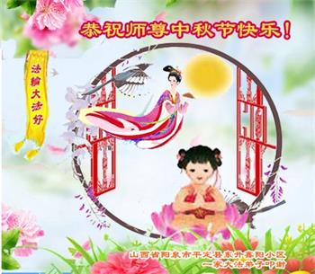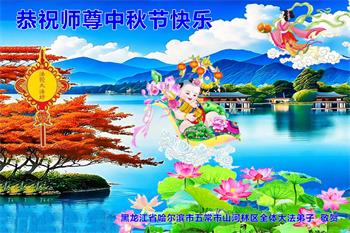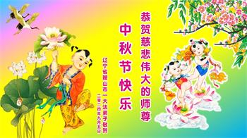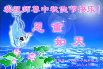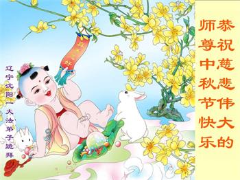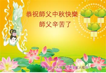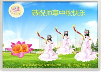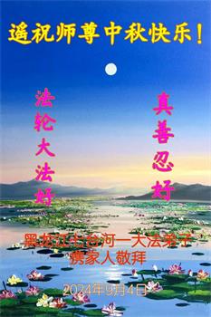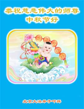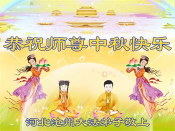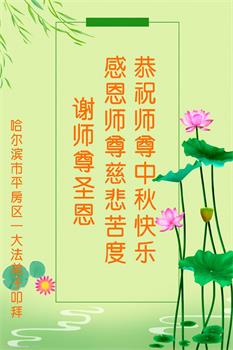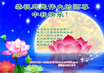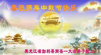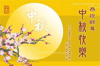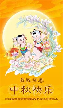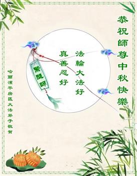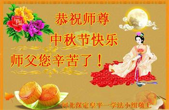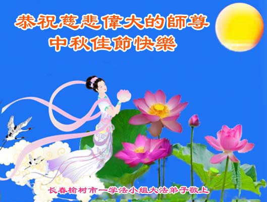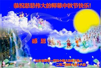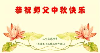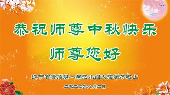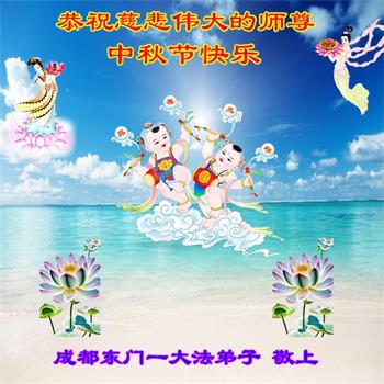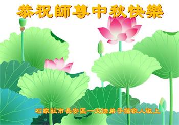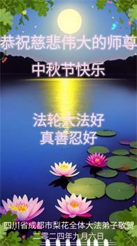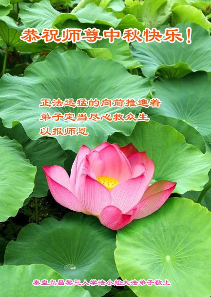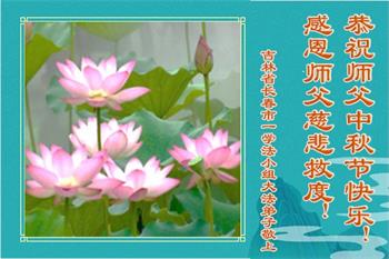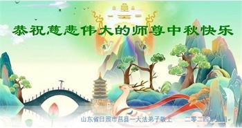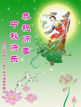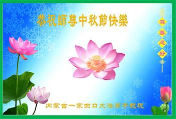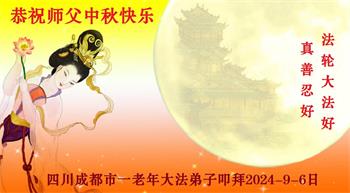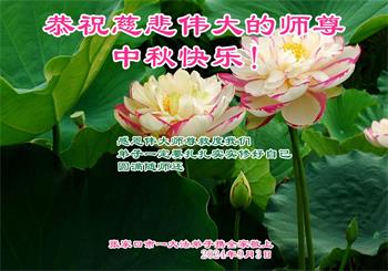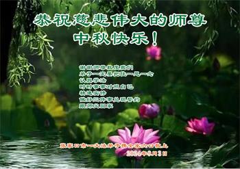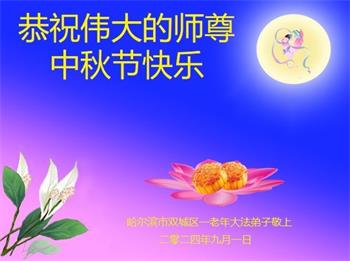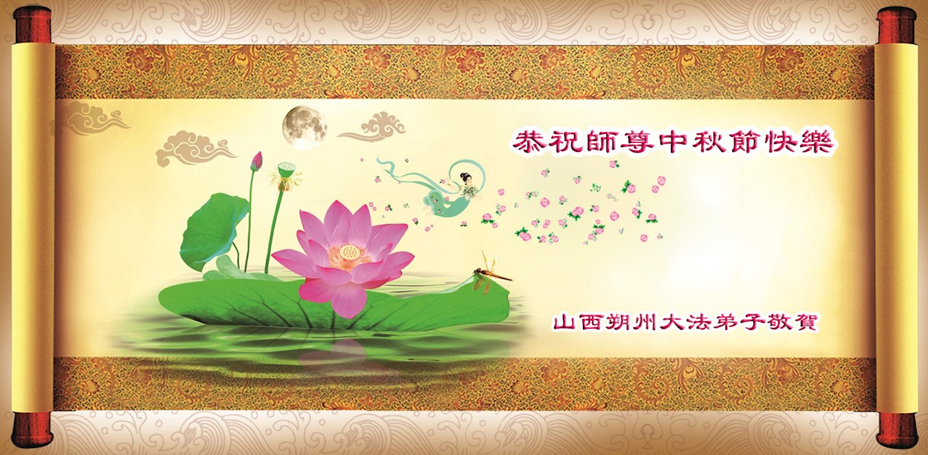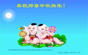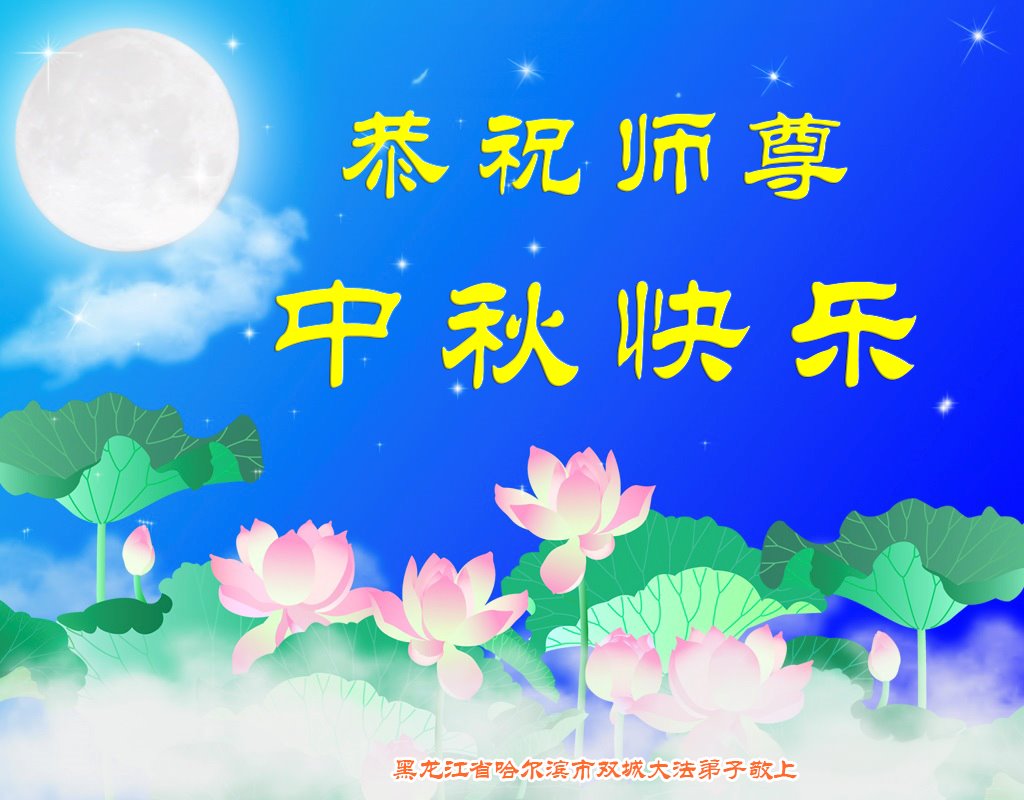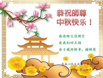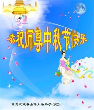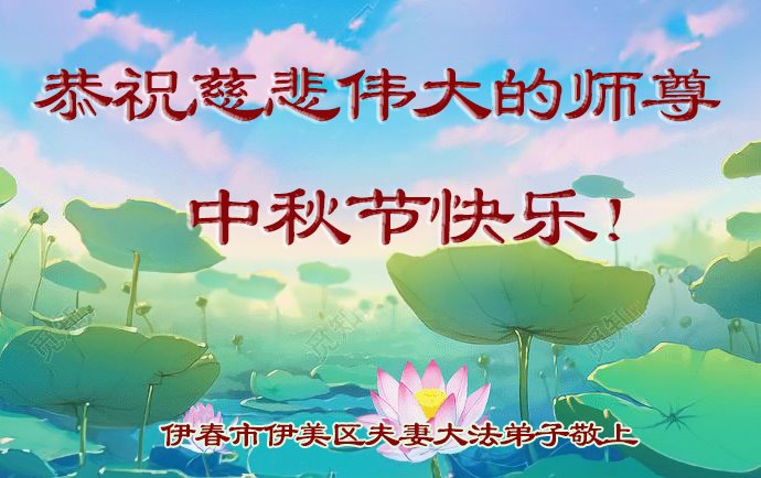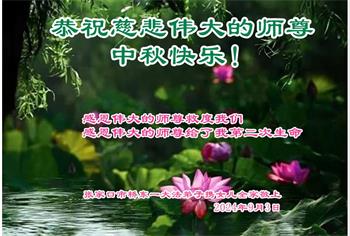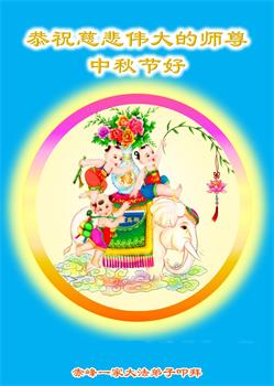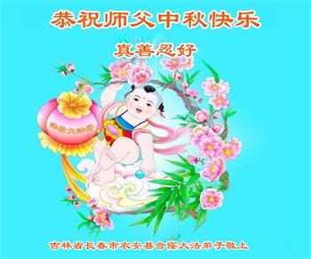 师父您好,我是新得法的学员。来到阿姨家有幸得遇大法,我的心情特别激动,我太幸运了。我跟阿姨一起学法、一起炼功、一起出去讲真相救人,大法太好了。中秋佳节到了,在此恭祝师父中秋节快乐!