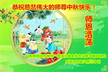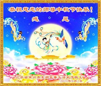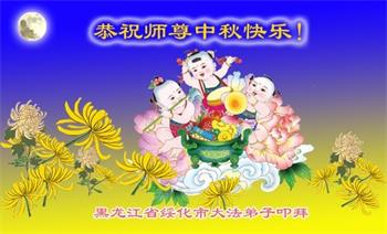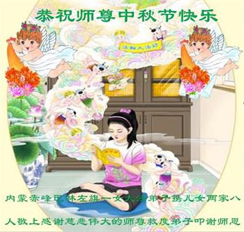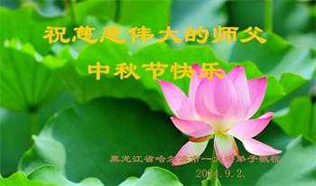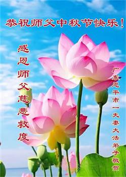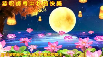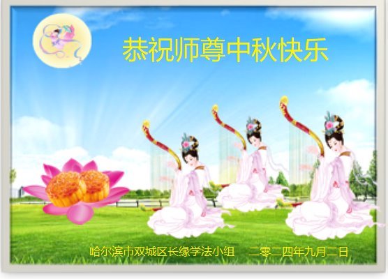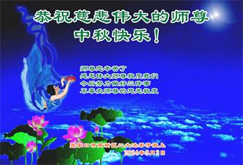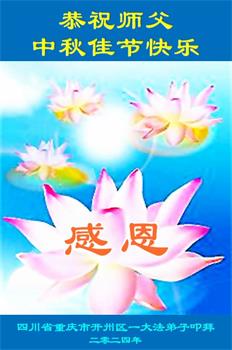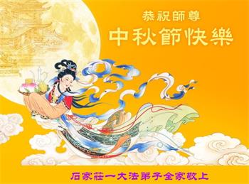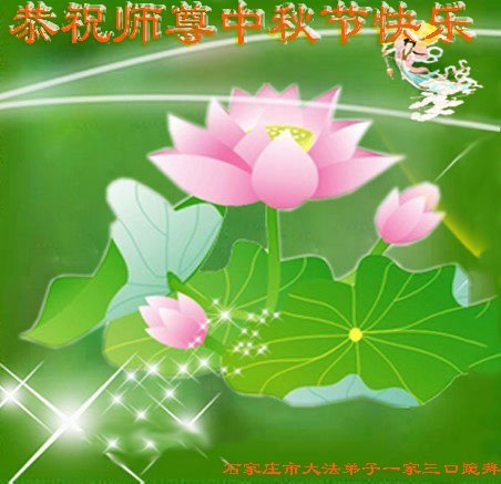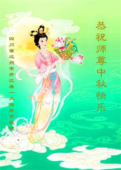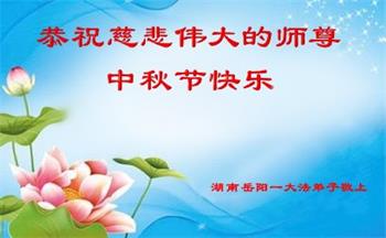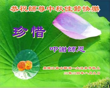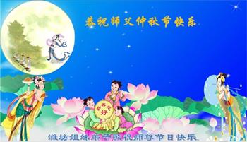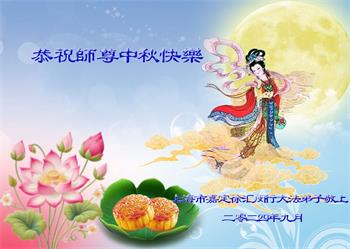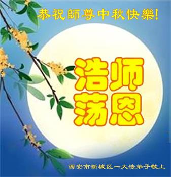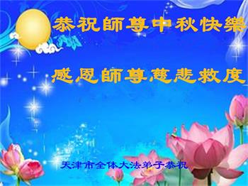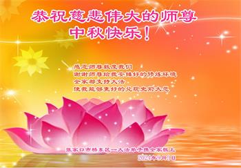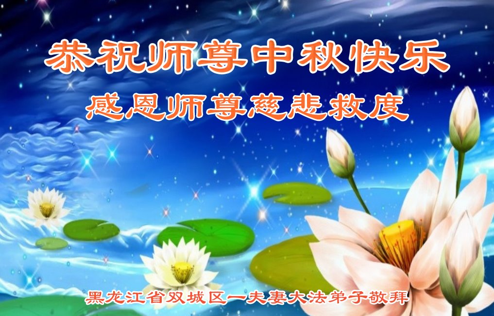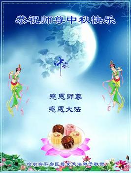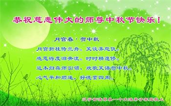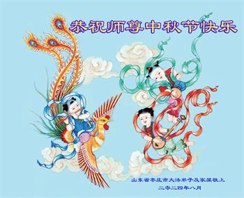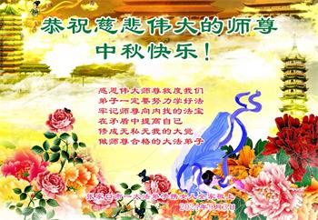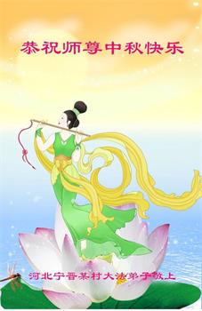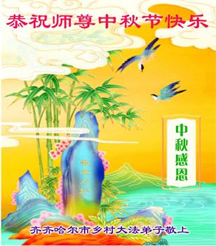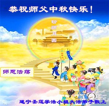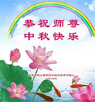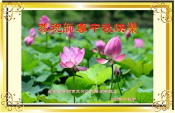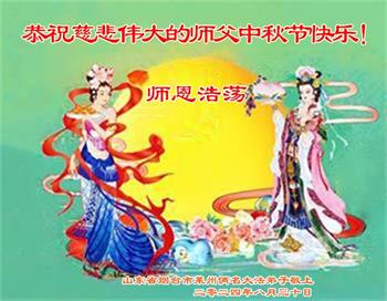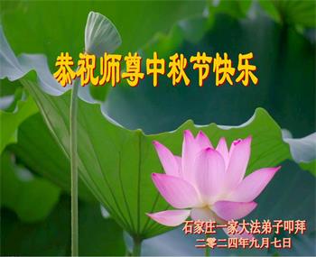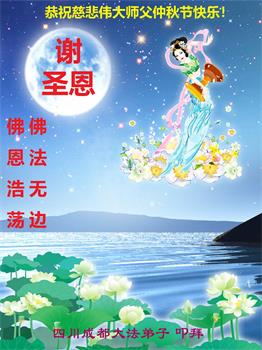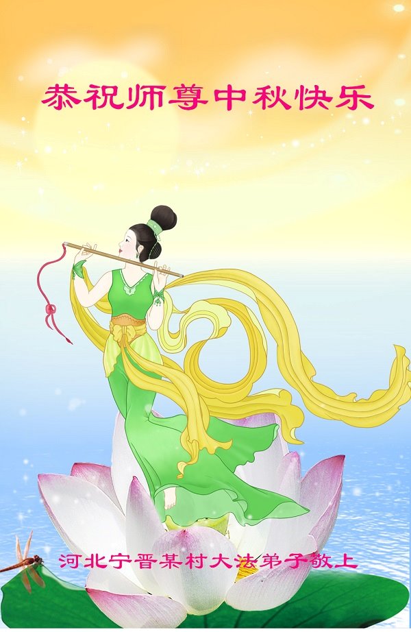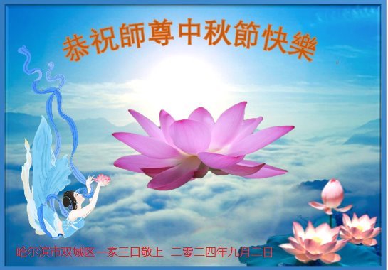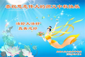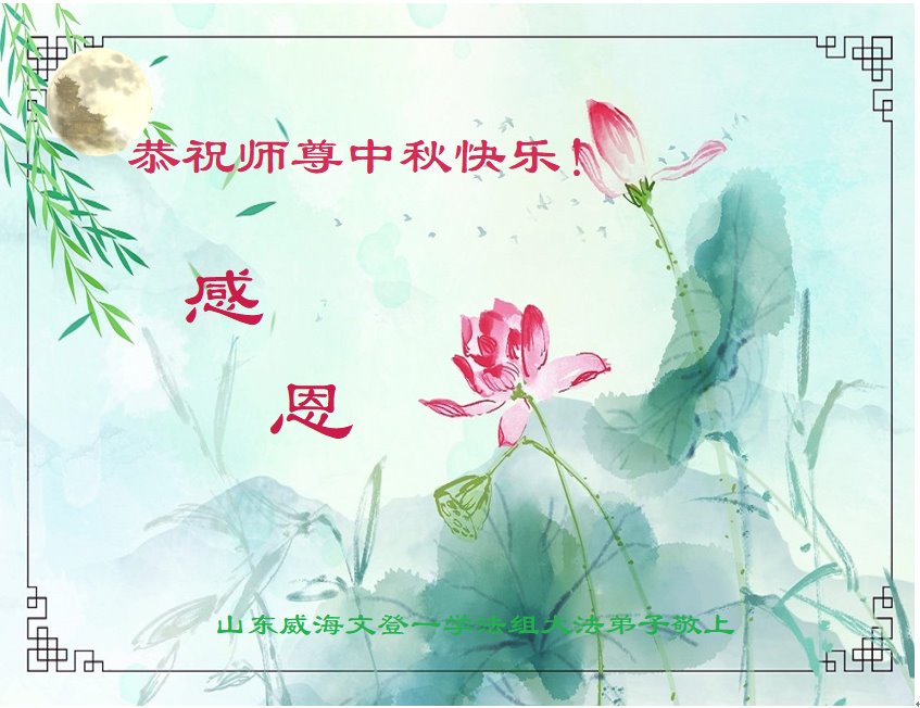 师父您好,我是新得法的学员。来到阿姨家有幸得遇大法,我的心情特别激动,我太幸运了。我跟阿姨一起学法、一起炼功、一起出去讲真相救人,大法太好了。中秋佳节到了,在此恭祝师父中秋节快乐!