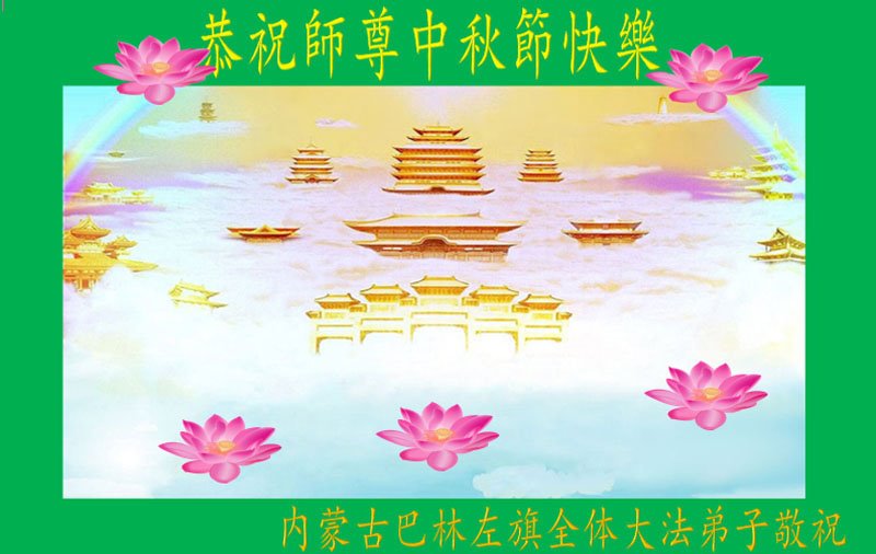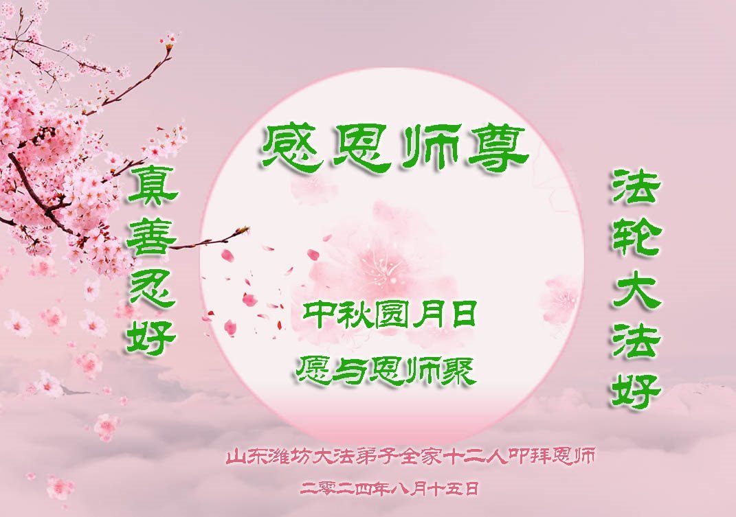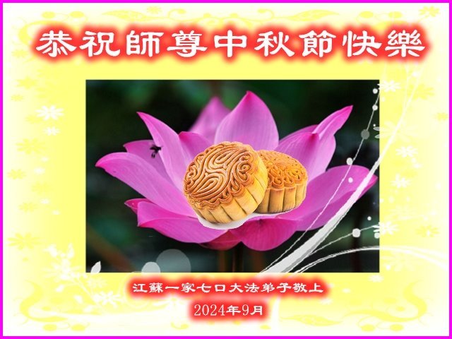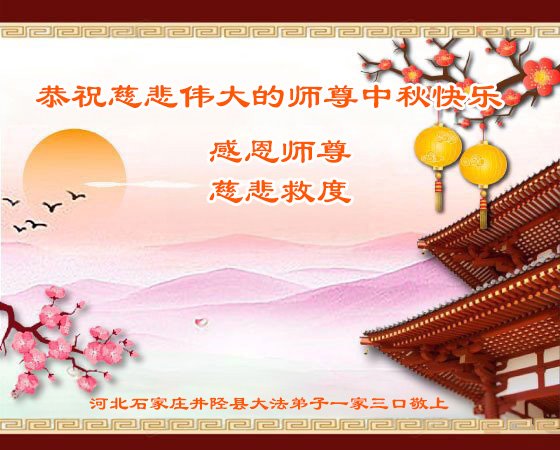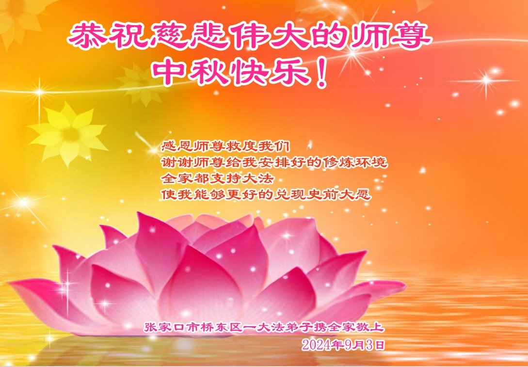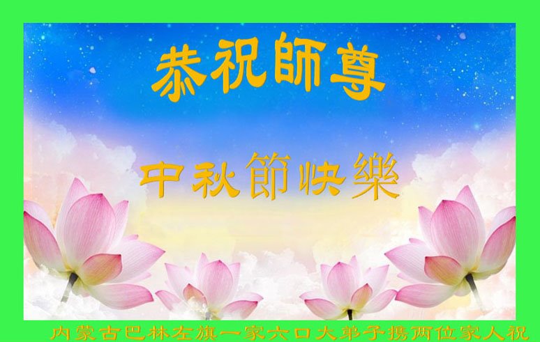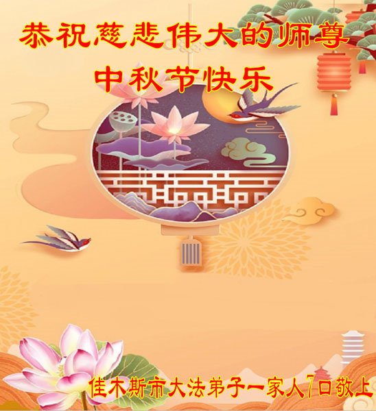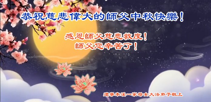 我们是大法弟子的家属,我们是亲身受益者。感谢李大师为宇宙所有生命付出了那么大的辛苦,是您的慈悲带领着众生走向未来。我们坚定的和大法弟子站在一起,走向美好的明天。谢谢李大师,祝李大师中秋节快乐!