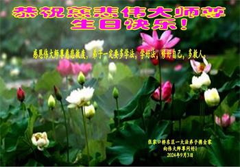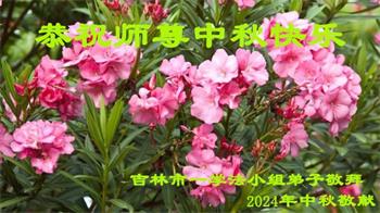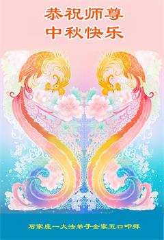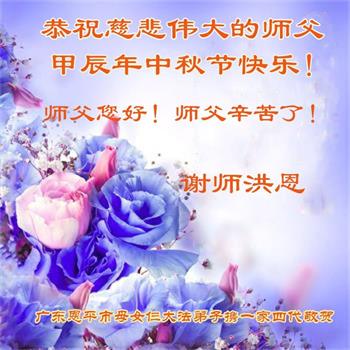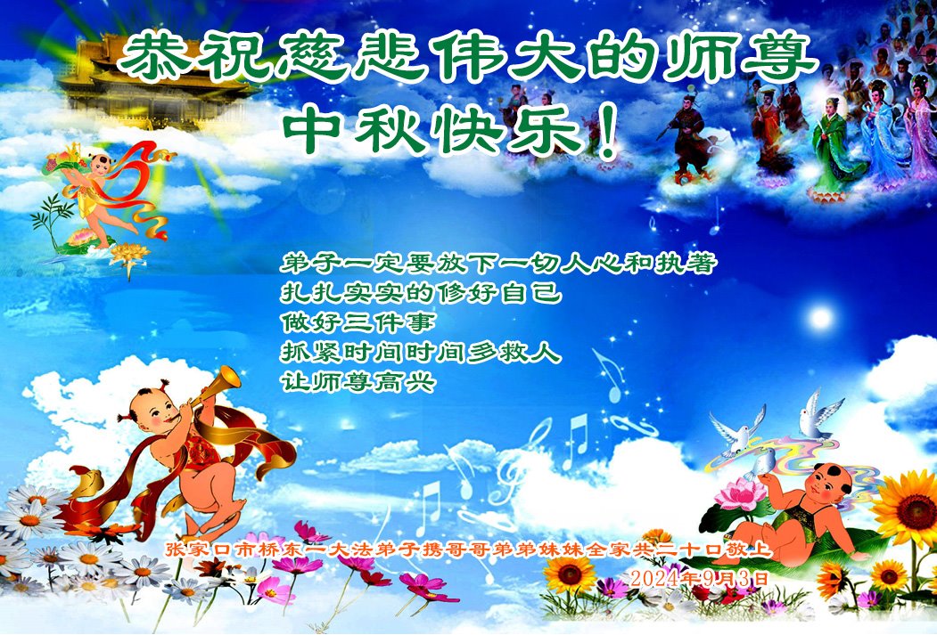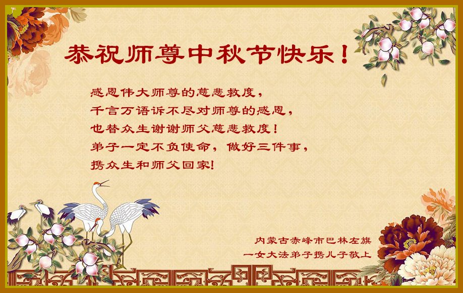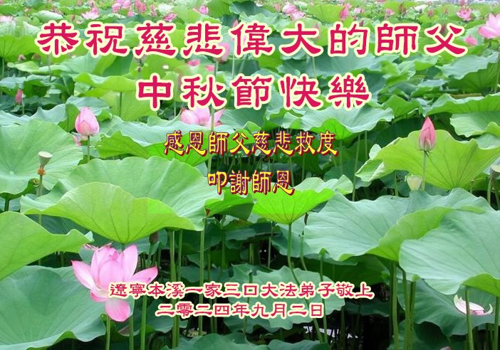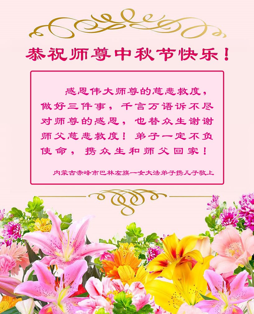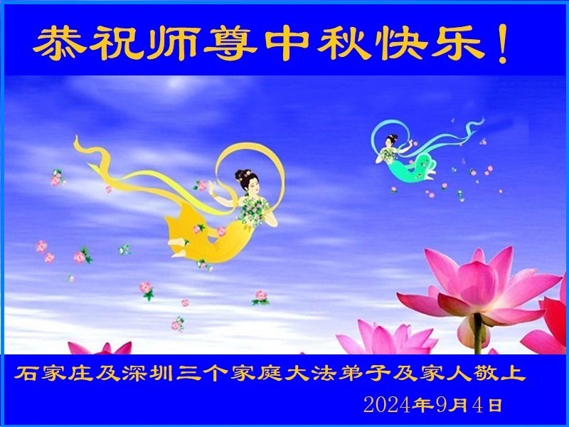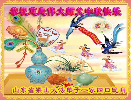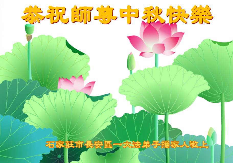 我们是大法弟子的家属,我们是亲身受益者。感谢李大师为宇宙所有生命付出了那么大的辛苦,是您的慈悲带领着众生走向未来。我们坚定的和大法弟子站在一起,走向美好的明天。谢谢李大师,祝李大师中秋节快乐!