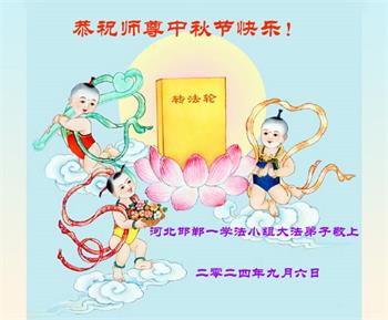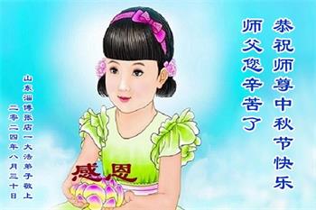 师父好!姥姥说我不会说话时就喜欢看《转法轮》上师父的照片。我经常和姥姥给师父上香、合十、磕头,还跟姥姥发真相资料、讲真相。我爱师父。我喜欢听大法歌曲。我很顽皮,是师父多次保护着我,谢谢师父!恭祝师父中秋节快乐!