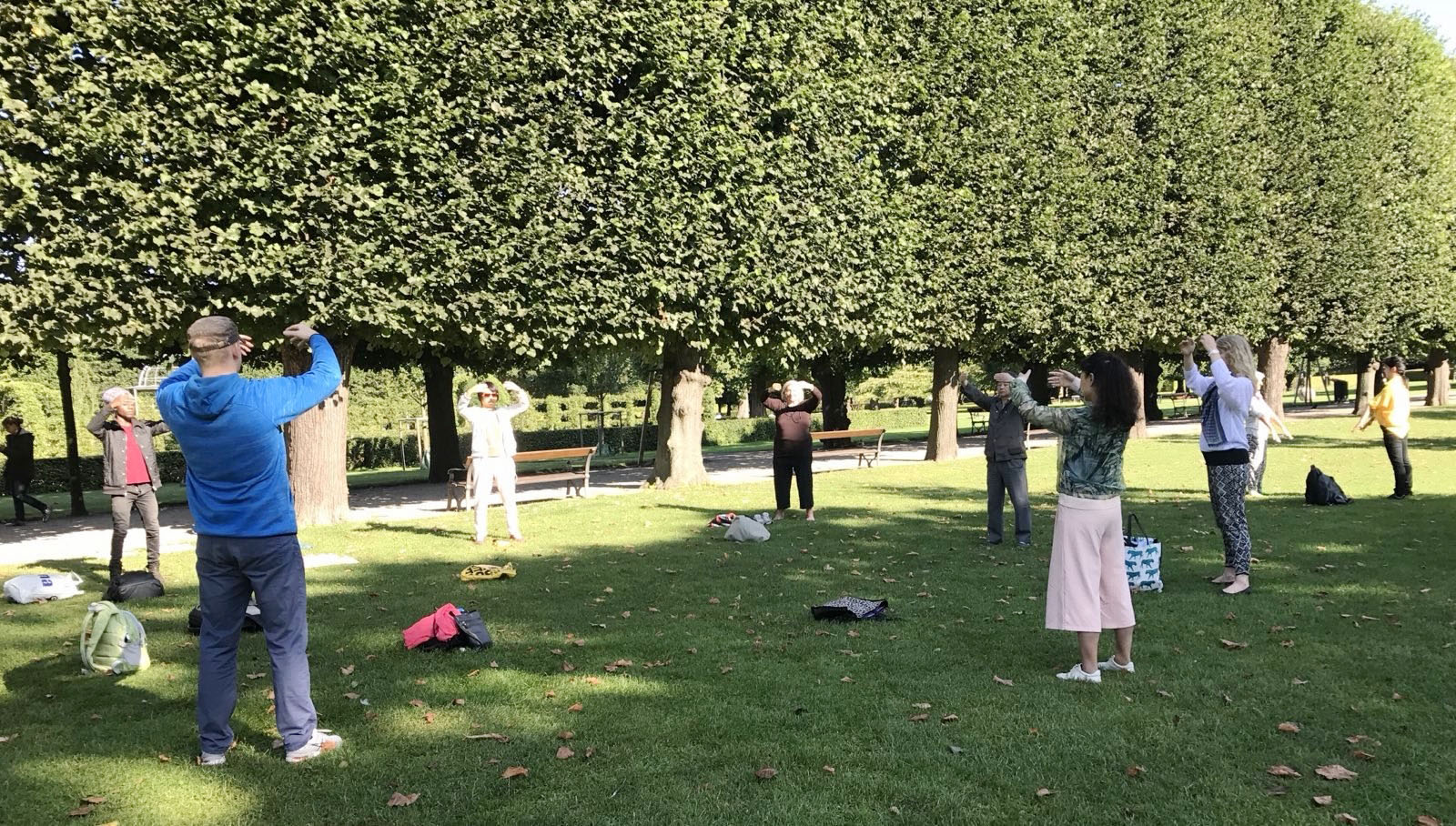 图12:法轮功学员在巴黎第九区区政府演示法轮功五套功法。