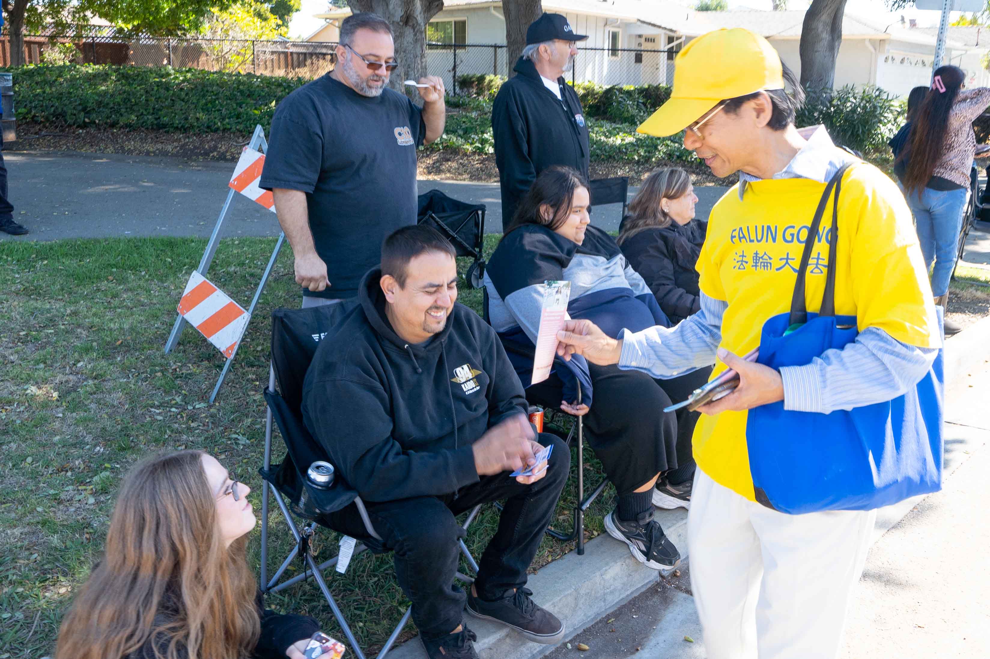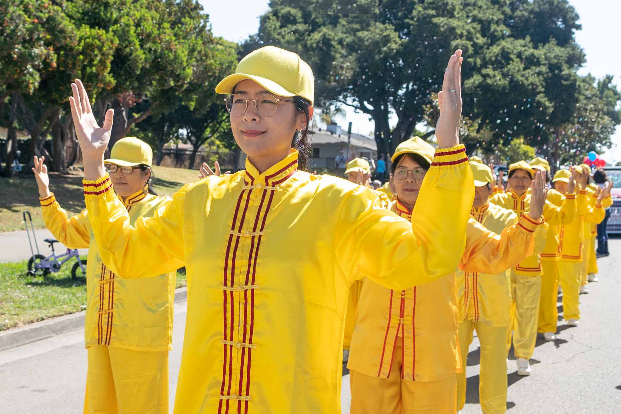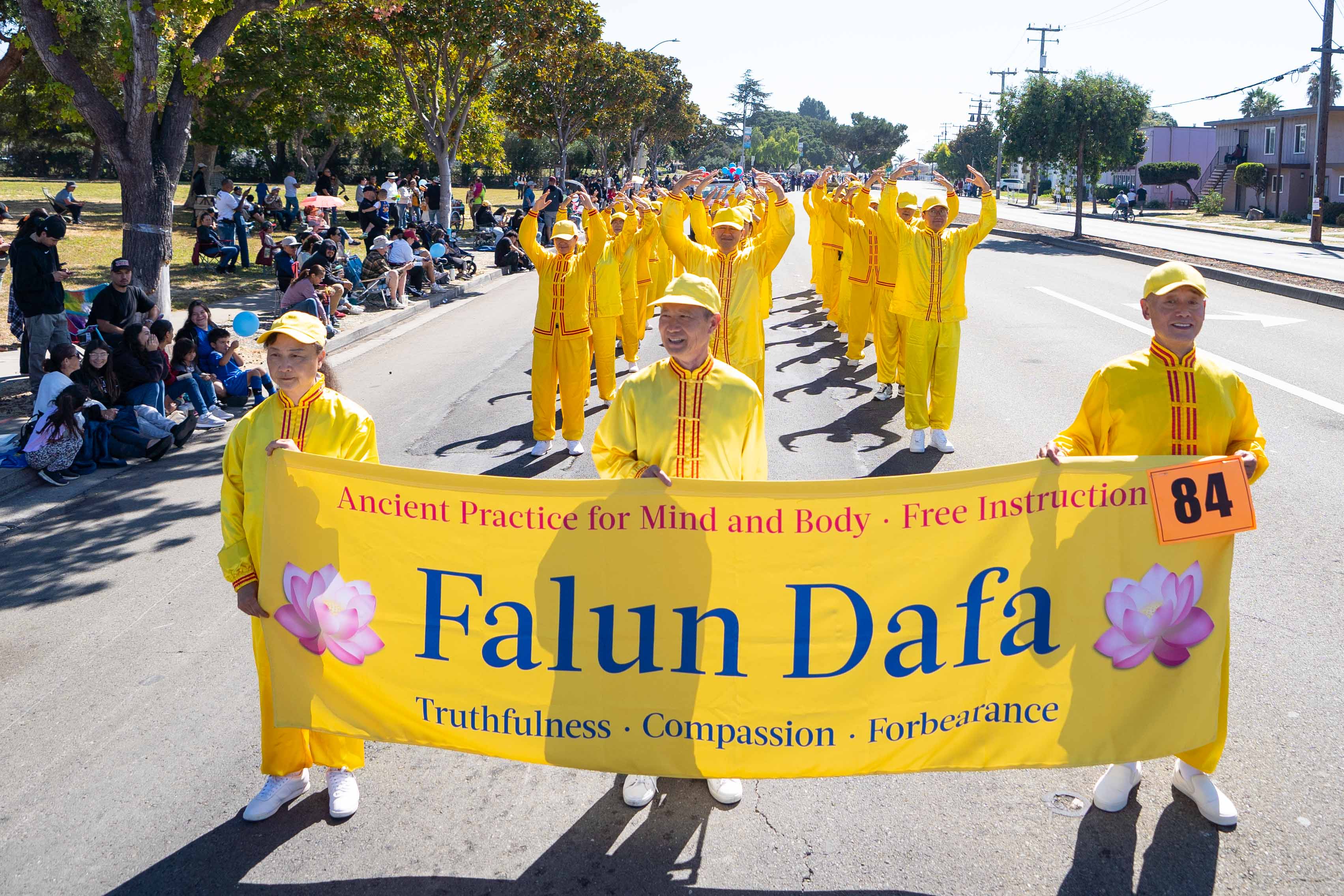 法轮功学员的队伍经过主席台时,主持人向观众介绍说:“现在来的队伍是法轮功学员的队伍,法轮功的原则是真善忍,是性命双修功法。法轮功免费教功,在湾区各地有教功班,欢迎大家参加。”