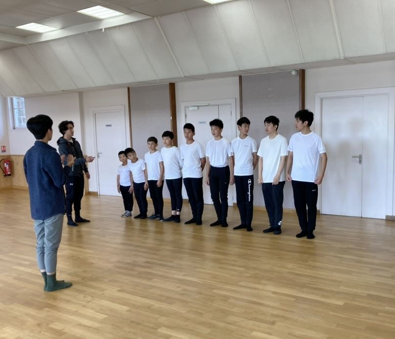 ![]() 图5:男大法小弟子在舞蹈训练中做形体训练。 |