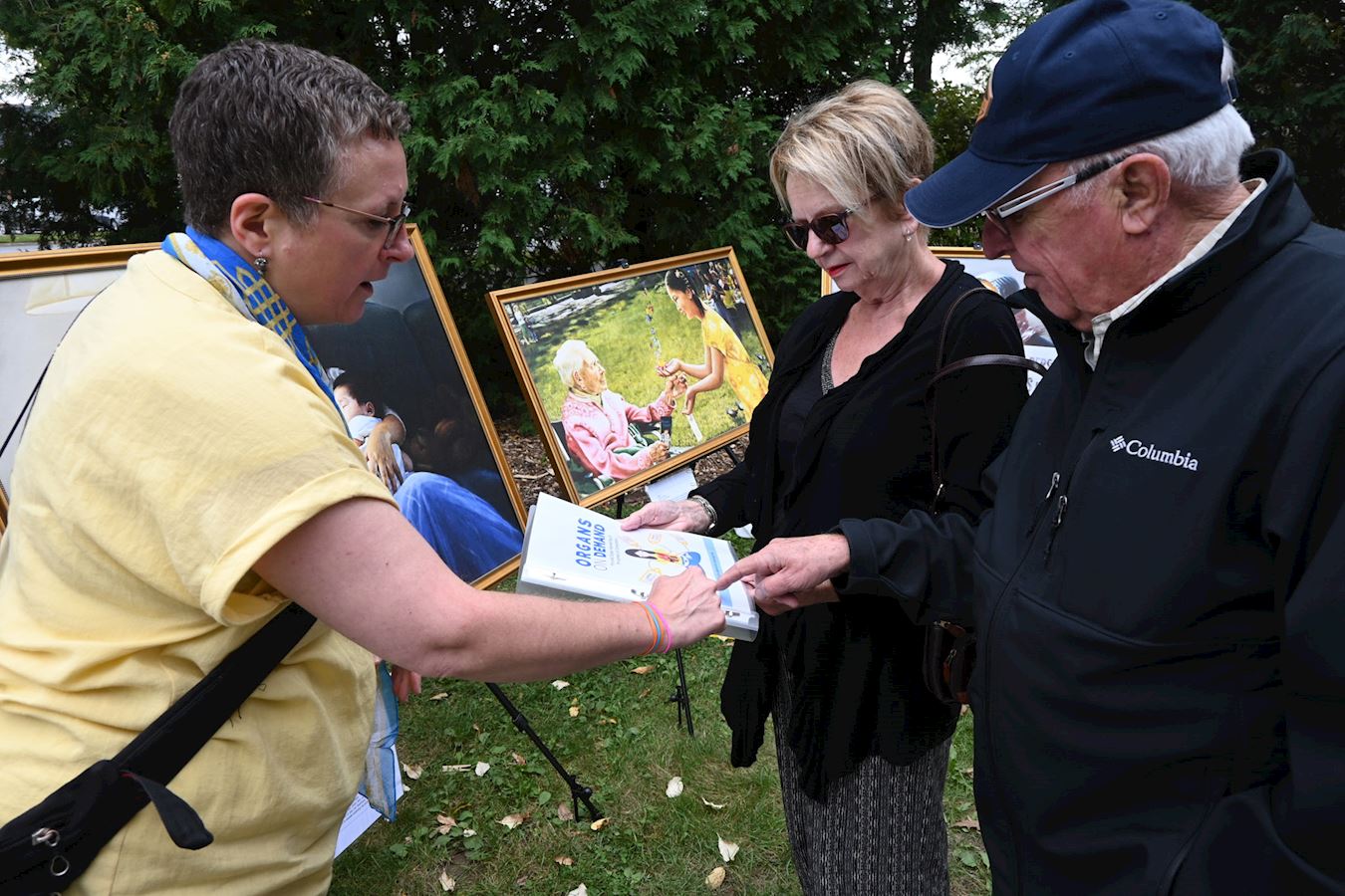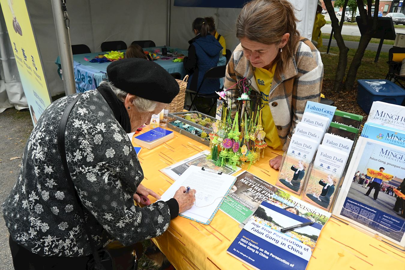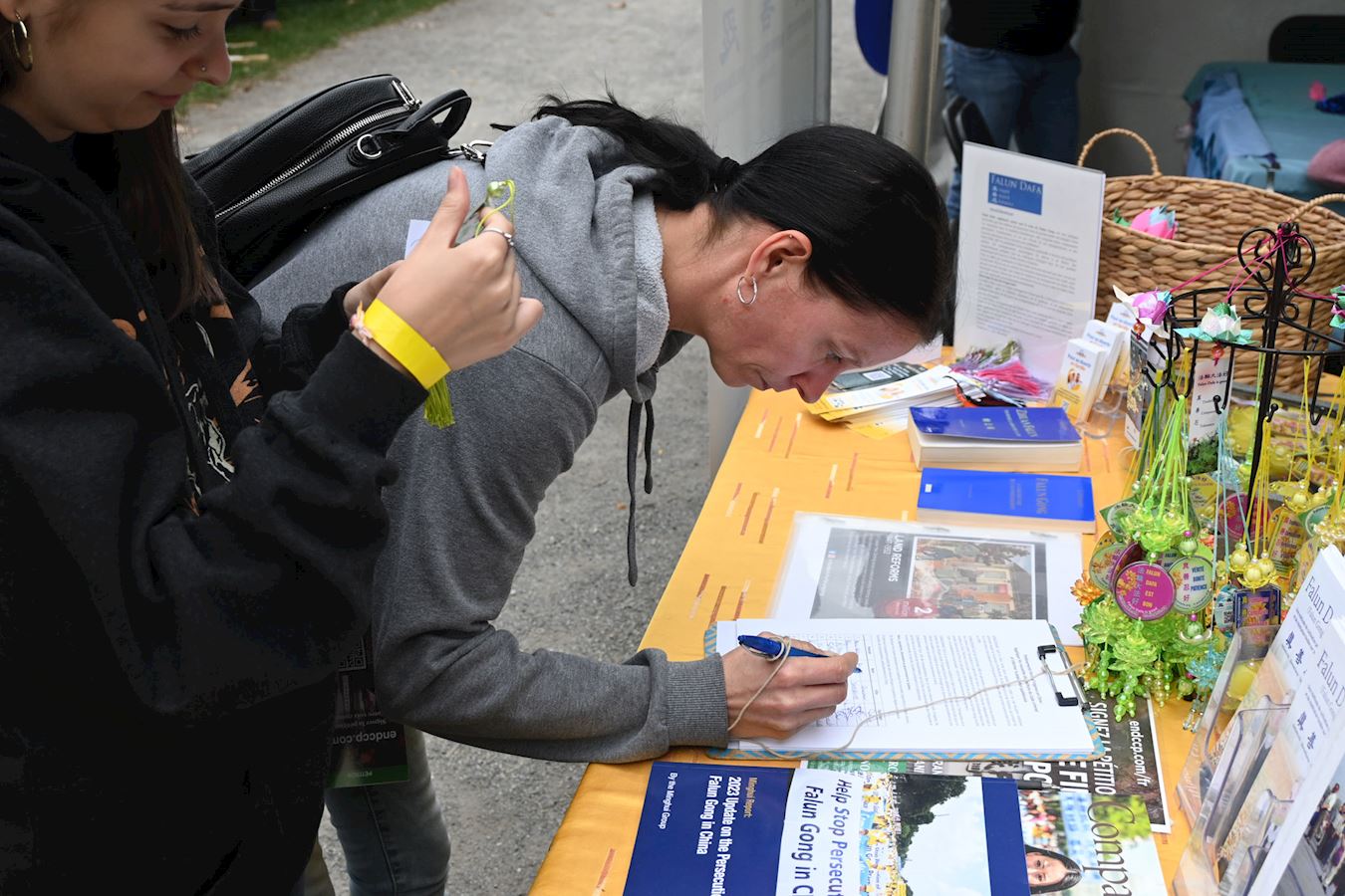 来自当地的一对夫妇对法轮大法所教导的真、善、忍普世价值产生共鸣,并有兴趣修炼法轮大法,他们还发现居住地附近就有一个炼功点。一位女士对法轮大法入门书籍《大圆满法》很感兴趣,她也在请愿书上签名。