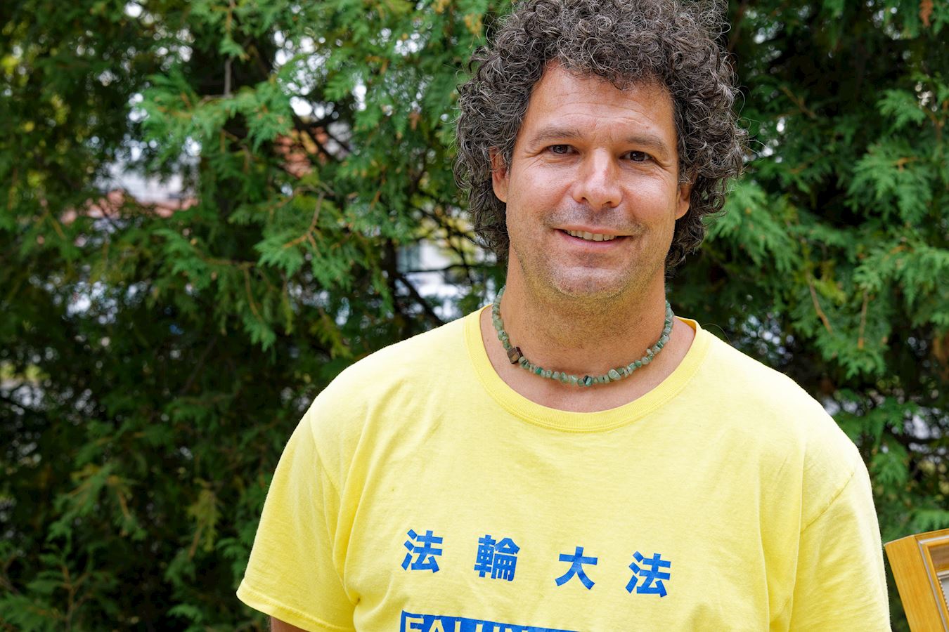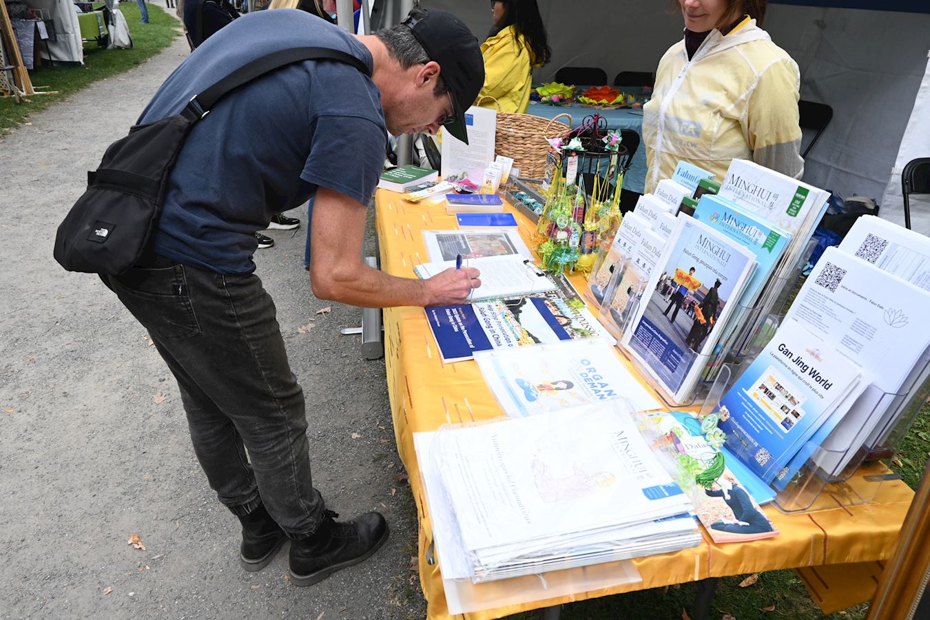 来自温莎的汤米(Tommy)修炼法轮功七年了,他希望向参加活动的民众介绍法轮功,因为他在大法修炼中受益太大了。