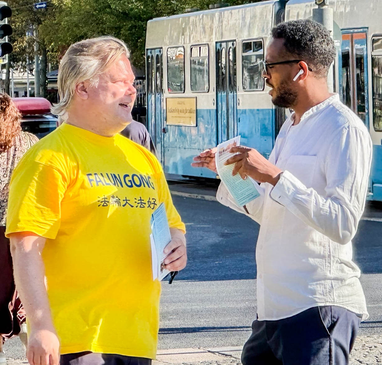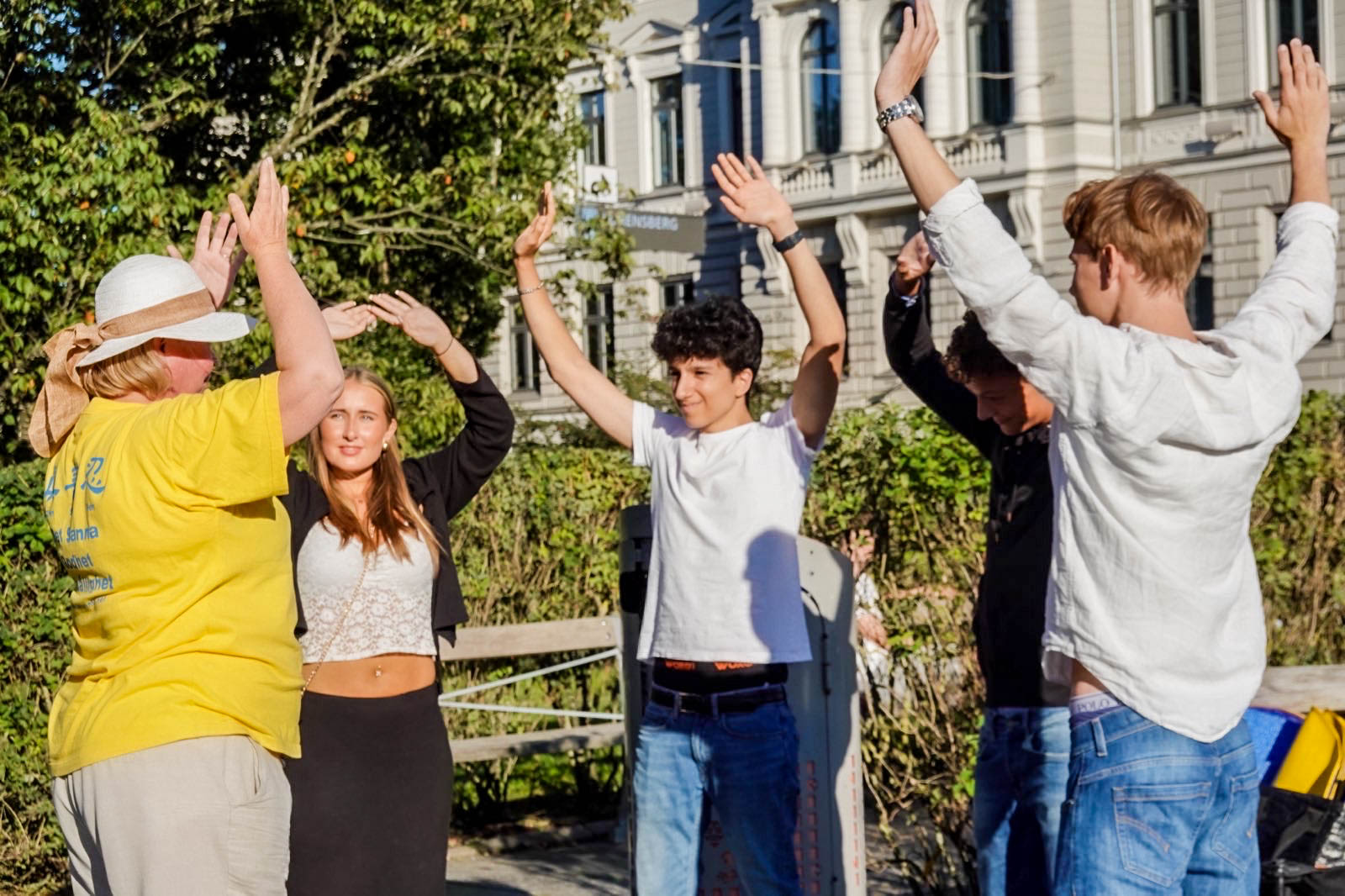 ![]() 图3~4:瑞典年轻人对法轮功很感兴趣,主动了解真相,有的人明白真相后当场学炼功动作。 |