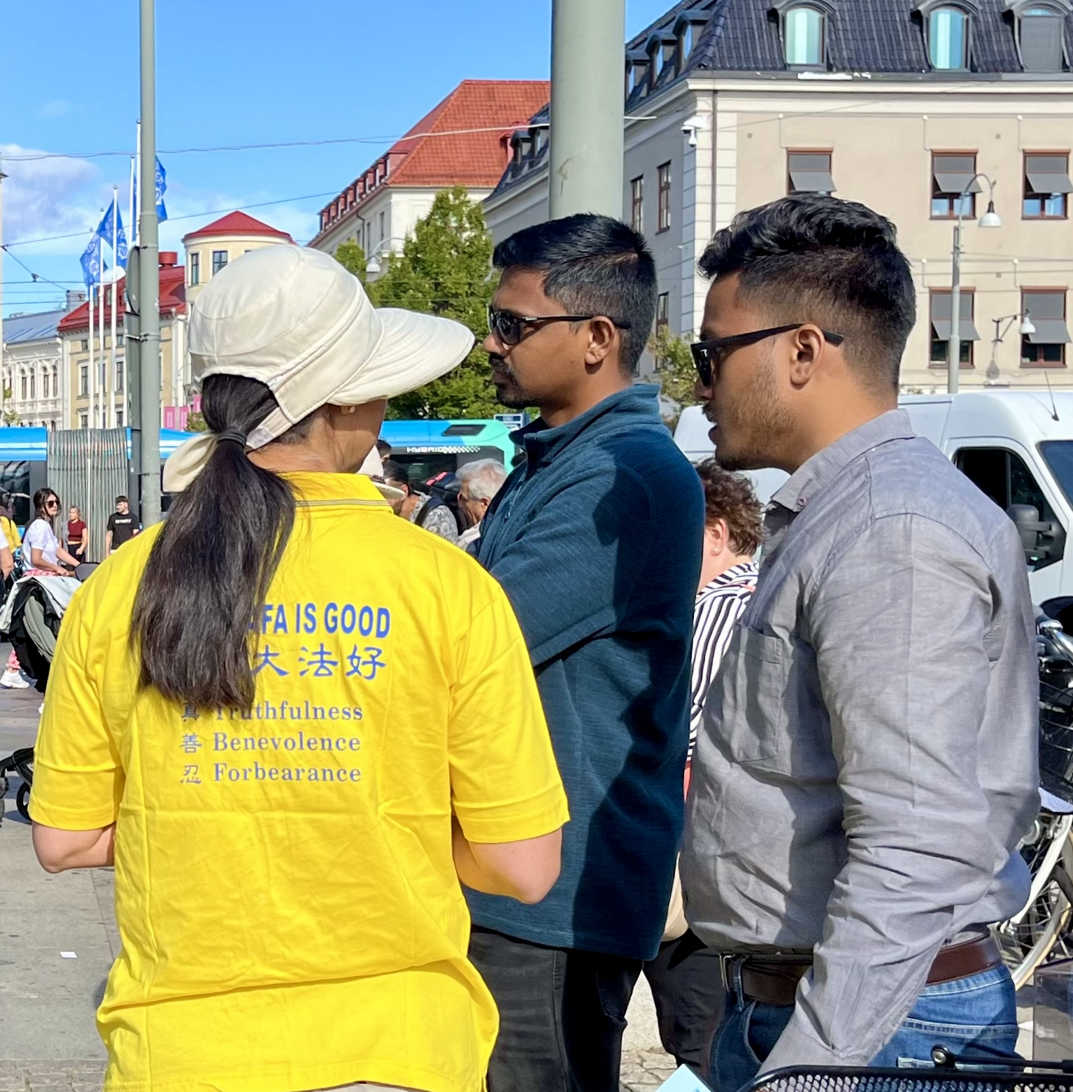 活动期间,有两位来自印度、在瑞典一家跨国公司做软件工程师的年轻人,当他们经过学员们的活动现场时,立刻被法轮功悦耳的炼功音乐、宁静祥和的炼功场面所吸引,他们驻足静静地观看着。在和学员的交谈中他们表示,在这里感受到了平静祥和的能量场,但很遗憾因有要事必须要离开。学员告诉他们过一会儿还有功法展示,欢迎再回来。