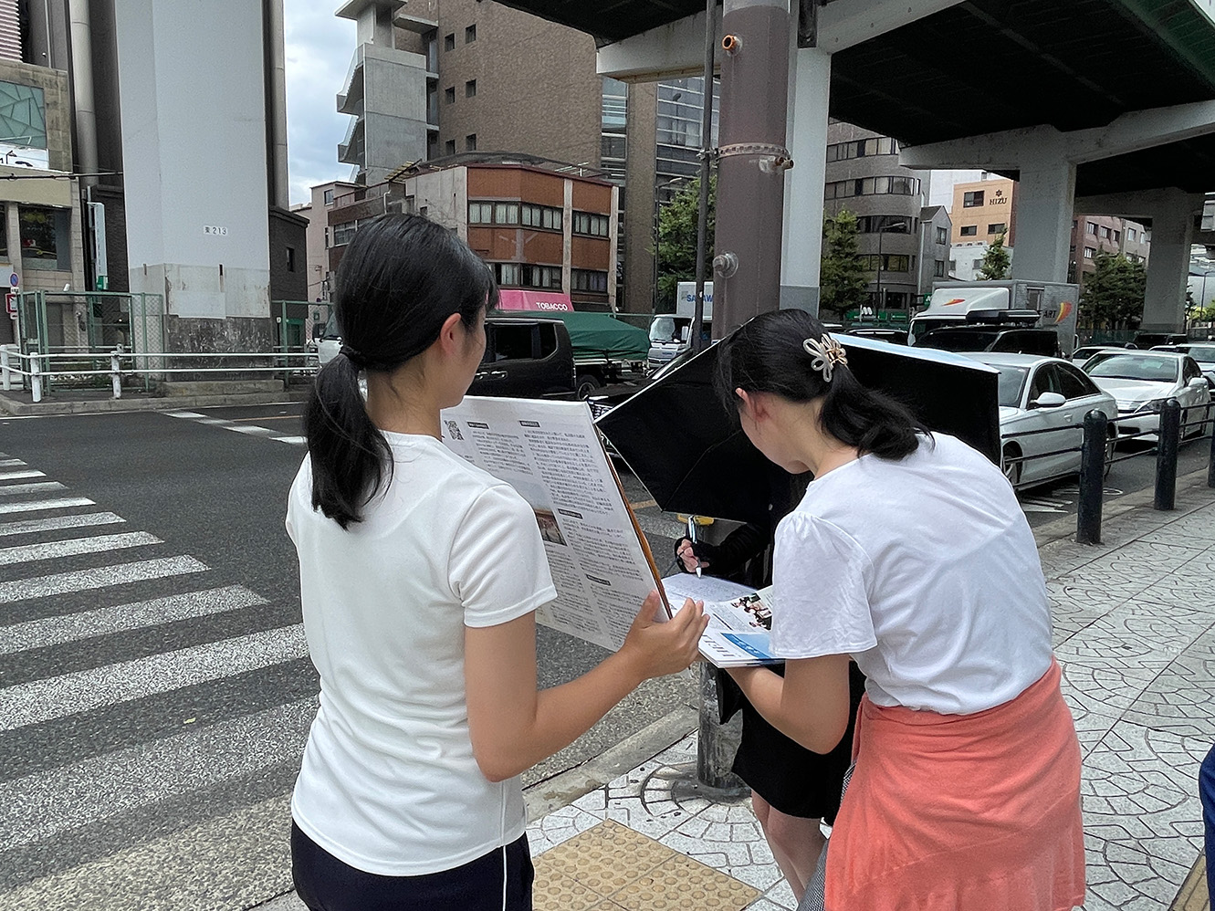 法轮功学员在炎热的酷暑下的签名活动得到了日本过路行人的关注和鼓励。很多人马上签名,并告诉法轮功学员加油,保重等。