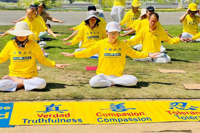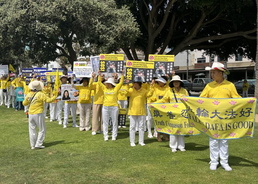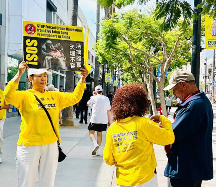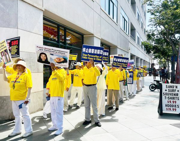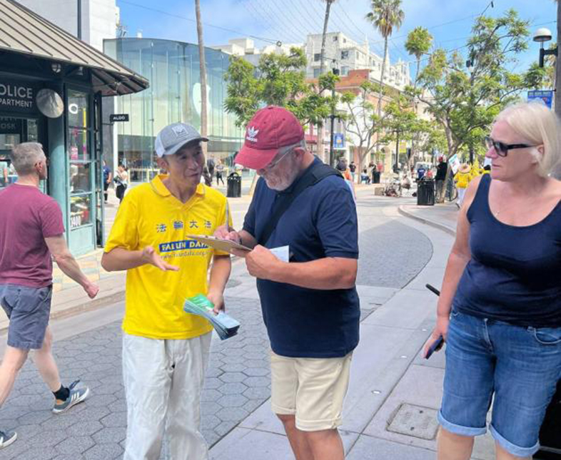 学员齐聚在圣莫妮卡(Santa Monica)码头及商业区街道举行游行,穿着金黄色衣服的学员就像一道靓丽的风景线,向来自世界各地的人讲真相,许多游客竖起大拇指,表示很震撼,也有不少游客拿出手机拍照、录像。