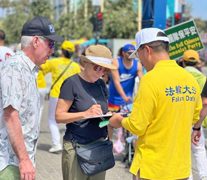 游行队伍整齐有序,队伍中高举的真相标语内容让很多游客感到震惊,每当他看到有些游客在关注游行队伍时,他就会把真相资料送到游客手中,看过真相资料后,百分之九十的人都愿意签名支持法轮功反迫害。