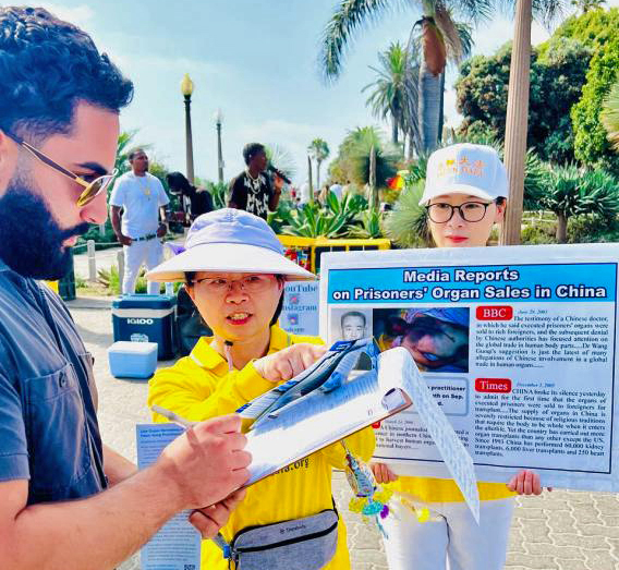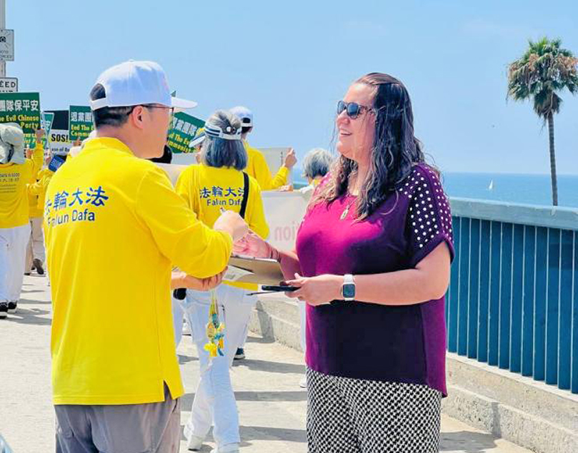 二零二零年从中国来到美国的胡女士,从开始听到法轮功就害怕,到明白真相后走入修炼,现在周末只要有时间,就会带着她的儿子来海边参加弘法和征签,她的儿子是她的小翻译。