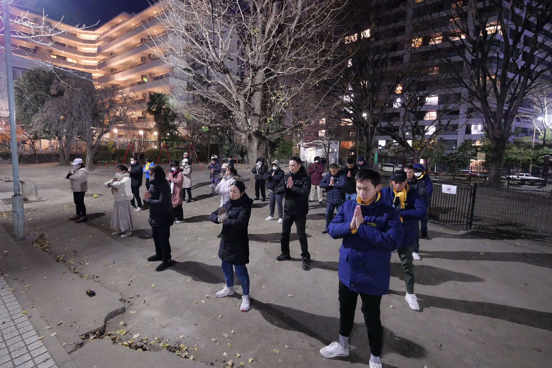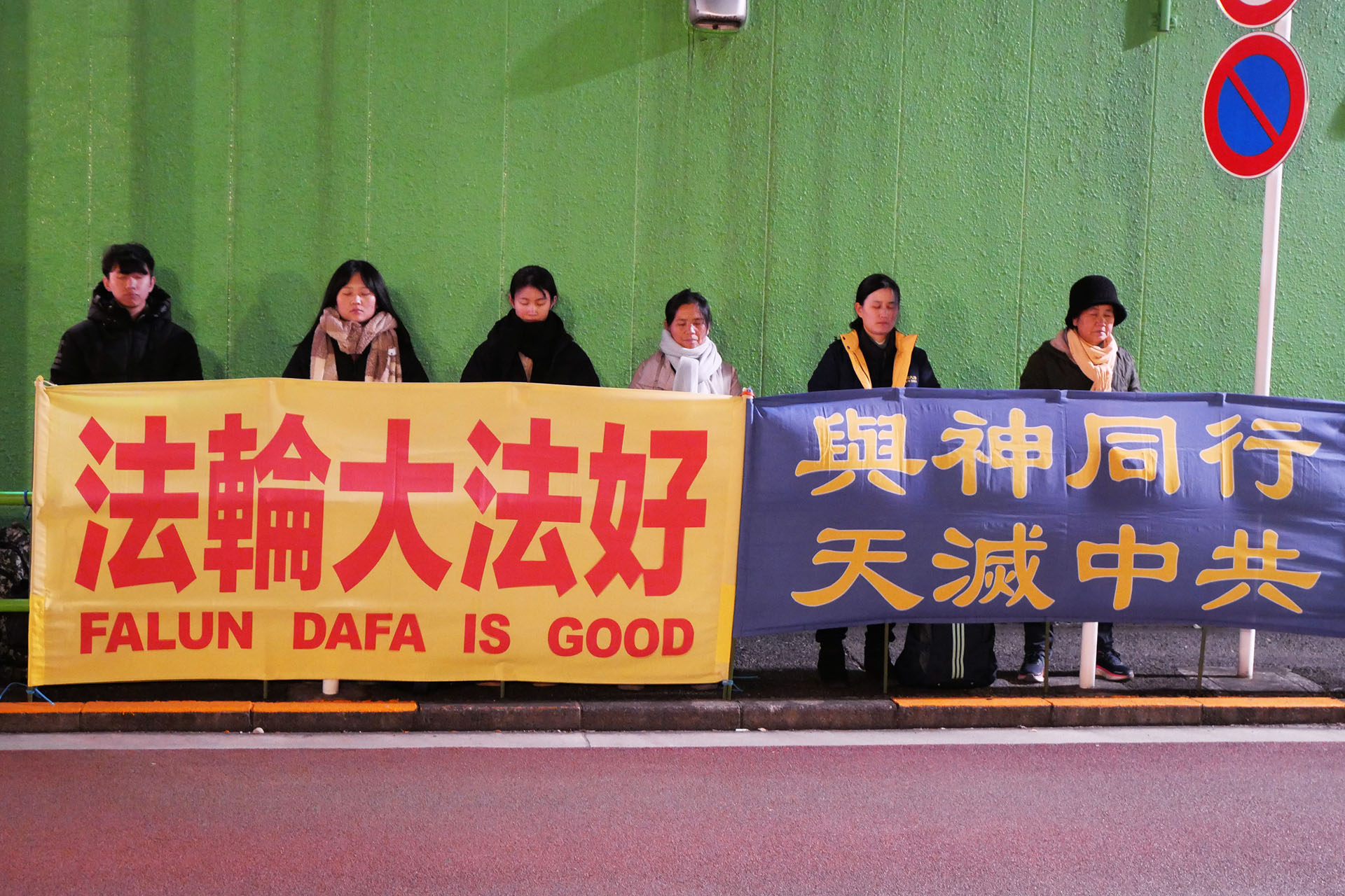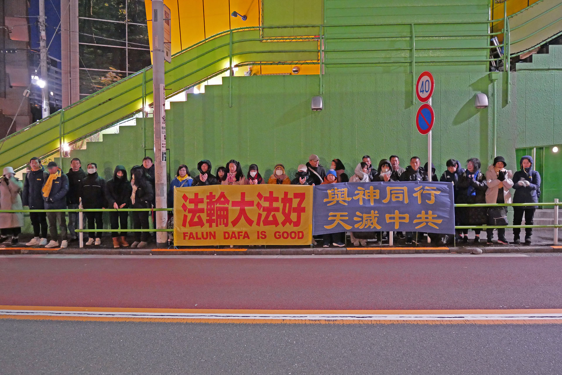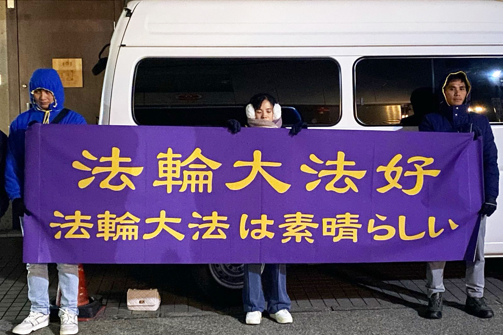 二零二四年十二月三十一日的跨年前夕,部分日本法轮功学员来到中共驻东京大使馆及各地领馆打出横幅和平抗议,要求中共立即停止对法轮功的迫害,停止活摘器官,并释放所有被非法关押的法轮功学员。