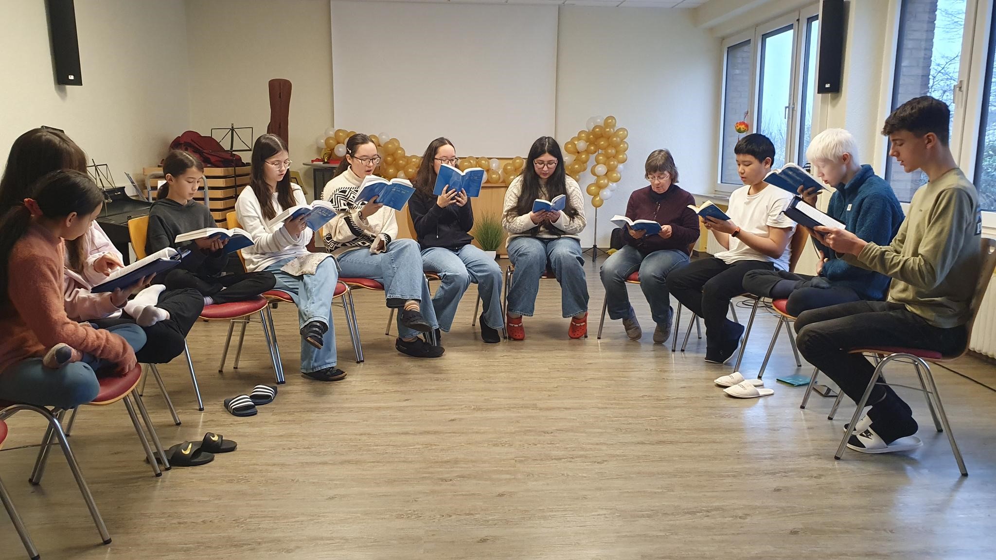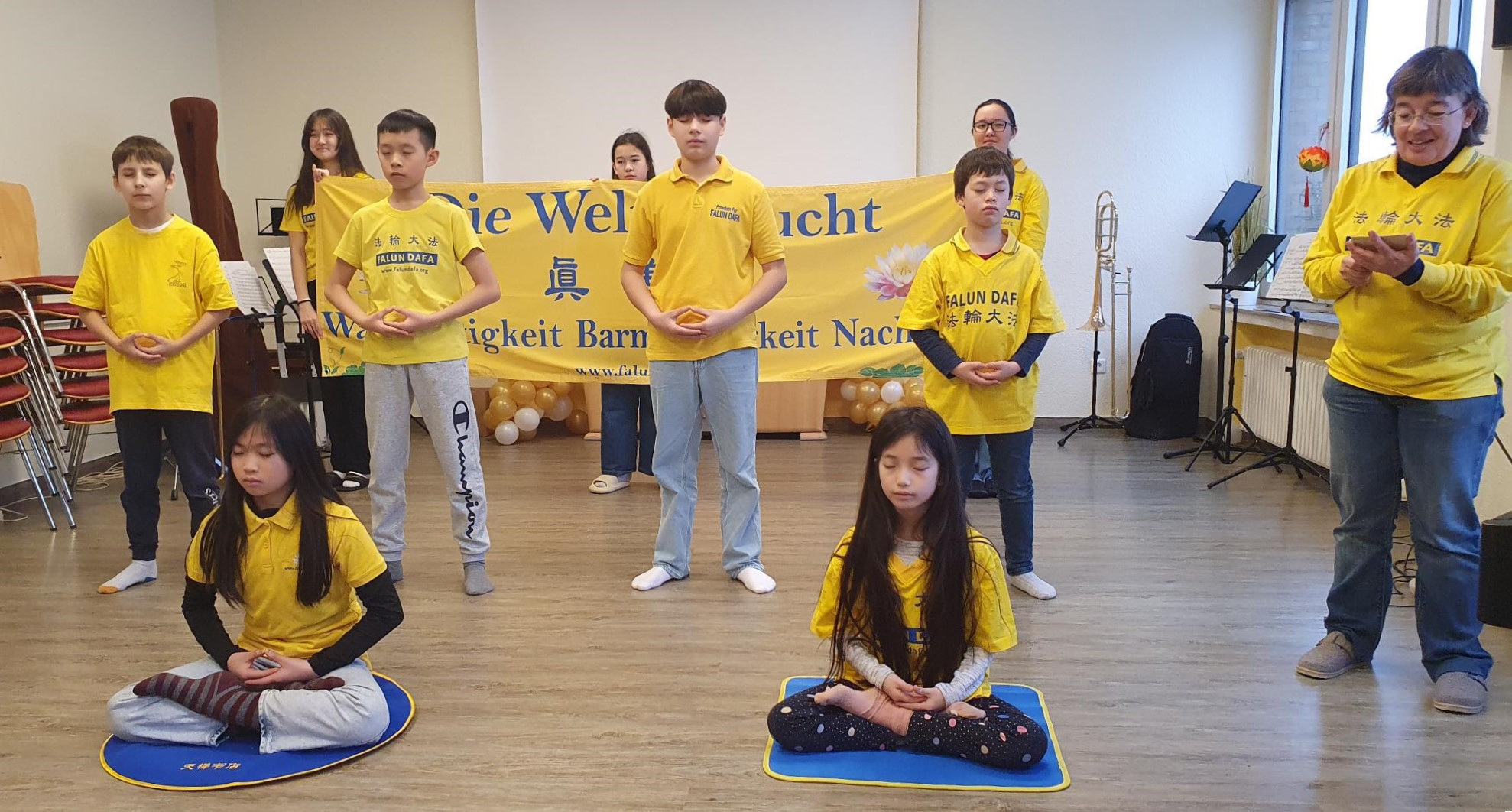 在明慧冬令营里,大人和孩子共同修炼是第一位的。每天上午,大家一起学法。为了达到更好的效果,根据年龄和语言分成不同的小组,包括成人组和儿童组,语言涵盖德语、英语、法语、俄语、越南语和中文。学法后,孩子们还会一起炼功,有部份家长帮助纠正动作。