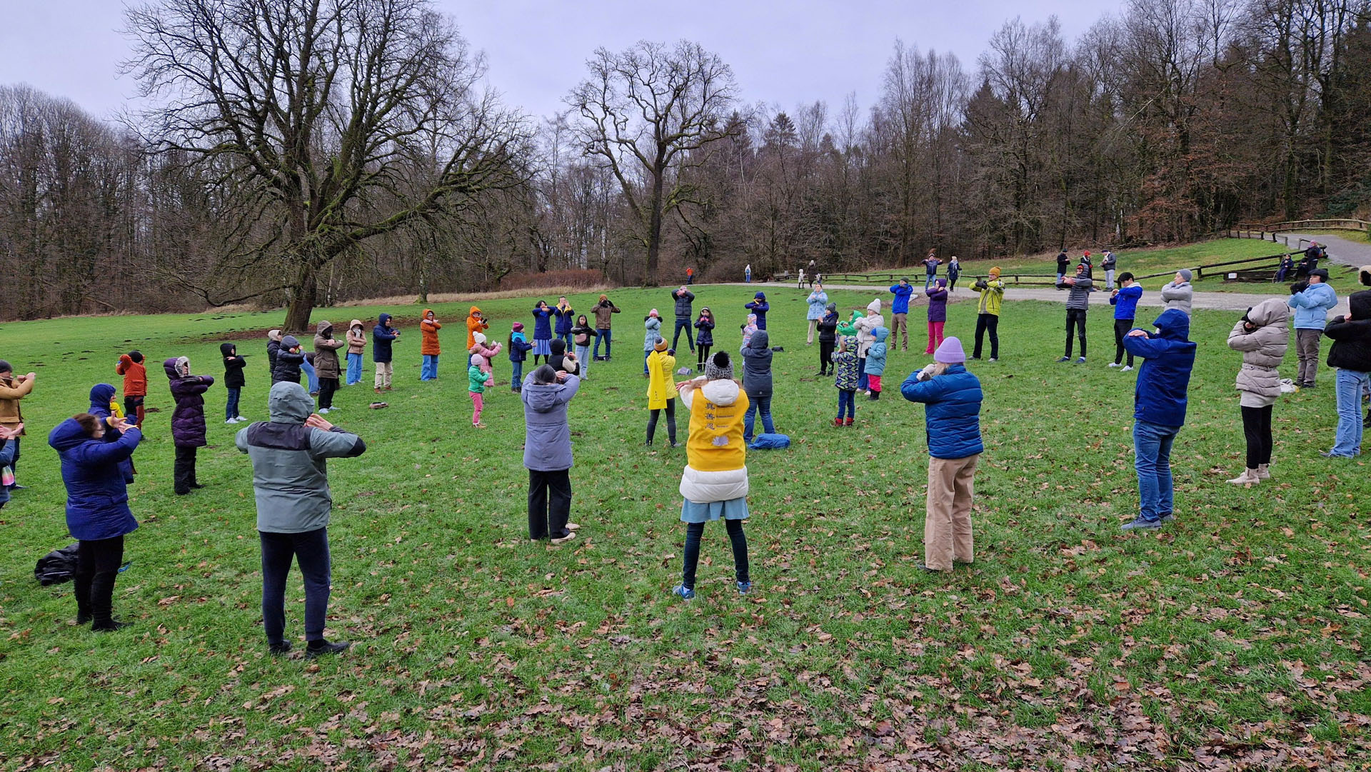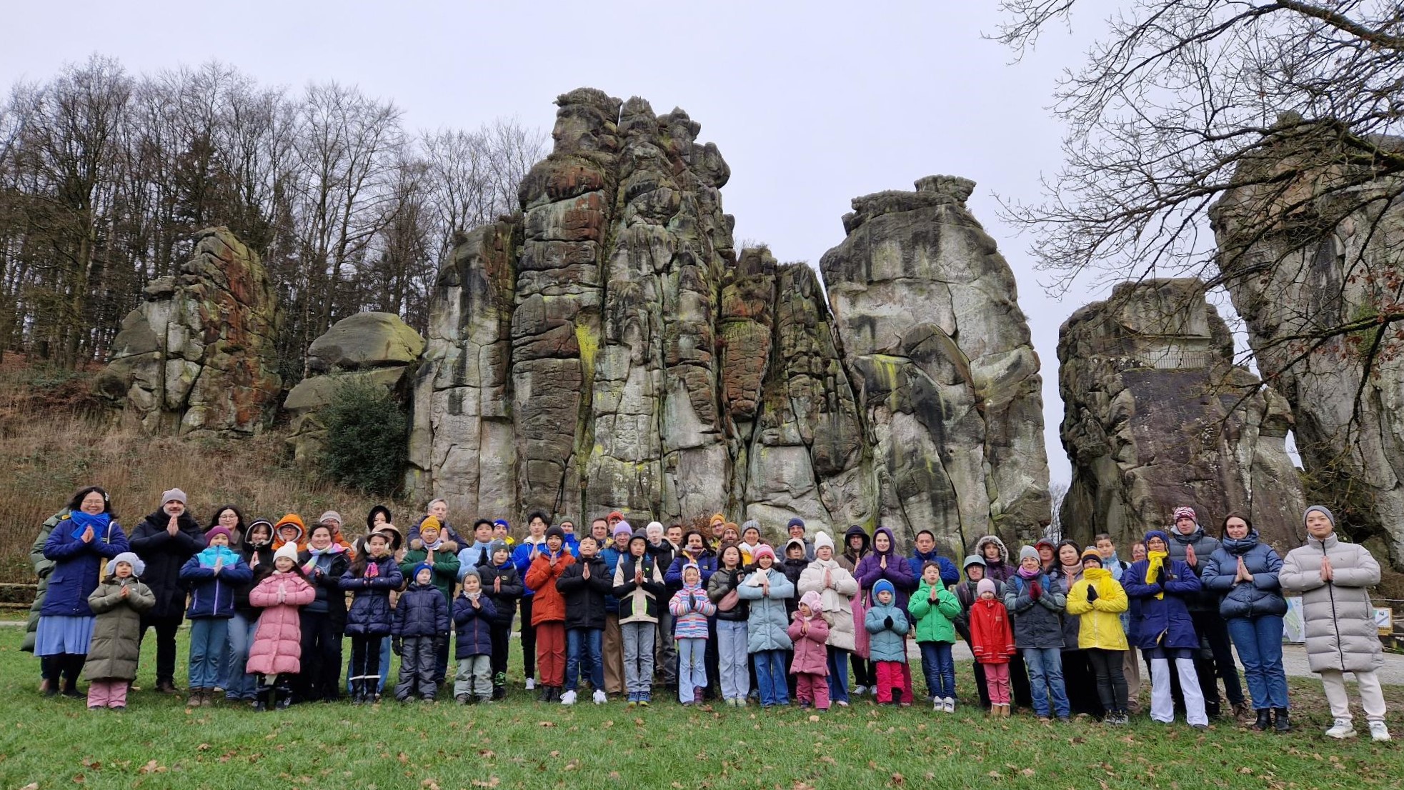 新年第一天,大家前往德国著名的巨石阵(Externsteine)郊游。在那里给游客们展示法轮功功法,发真相传单和小莲花。孩子们还表演了武术。在巨石阵前,大家高兴地站在一起,拍摄了合影和视频,向师父送上新年问候。天气很冷,大家喝着热茶取暖,孩子们玩着寻宝游戏,很开心。
