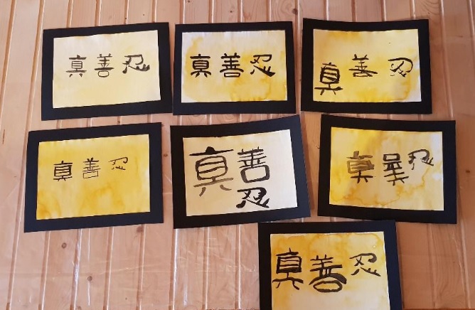 在书法课上,孩子们学习了如何用毛笔和墨水书写中文的“真、善、忍”三个字。