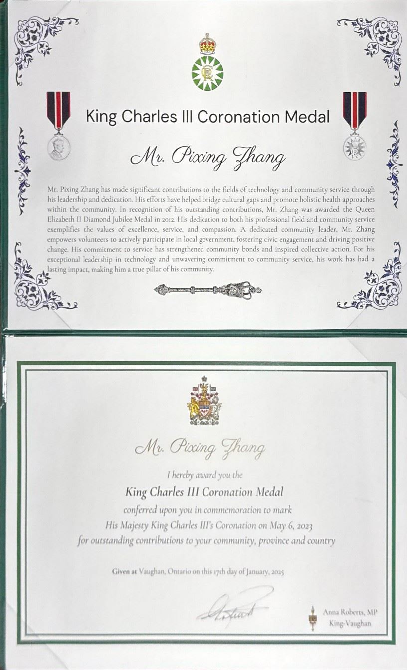 ![]() 图1:二零二五年一月十七日,加拿大法轮功学员张丕兴获加拿大加冕奖章。图为褒奖令。 |