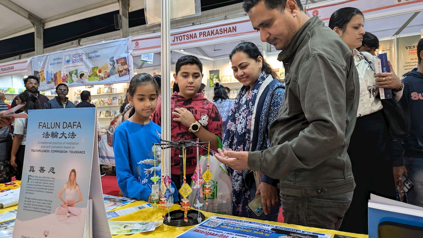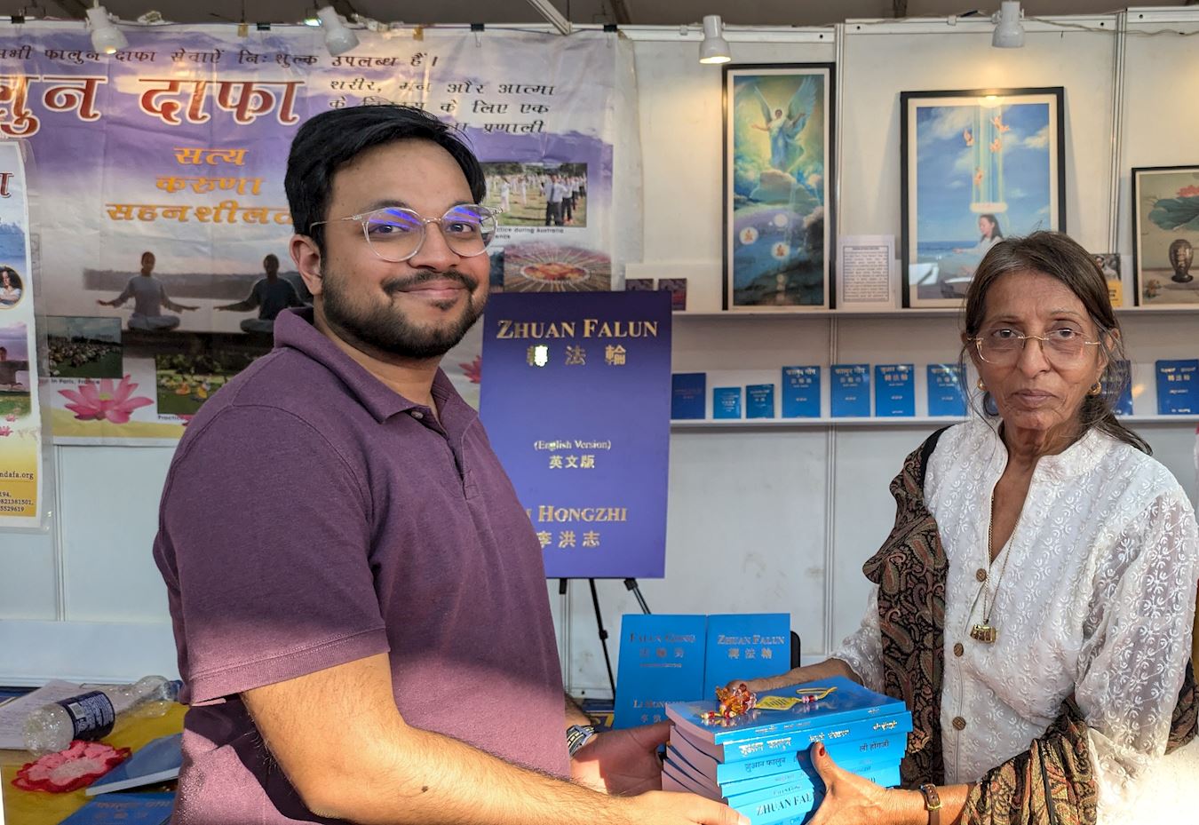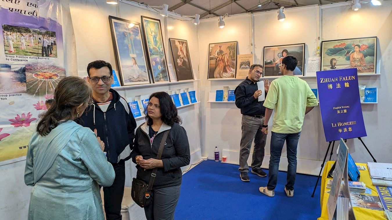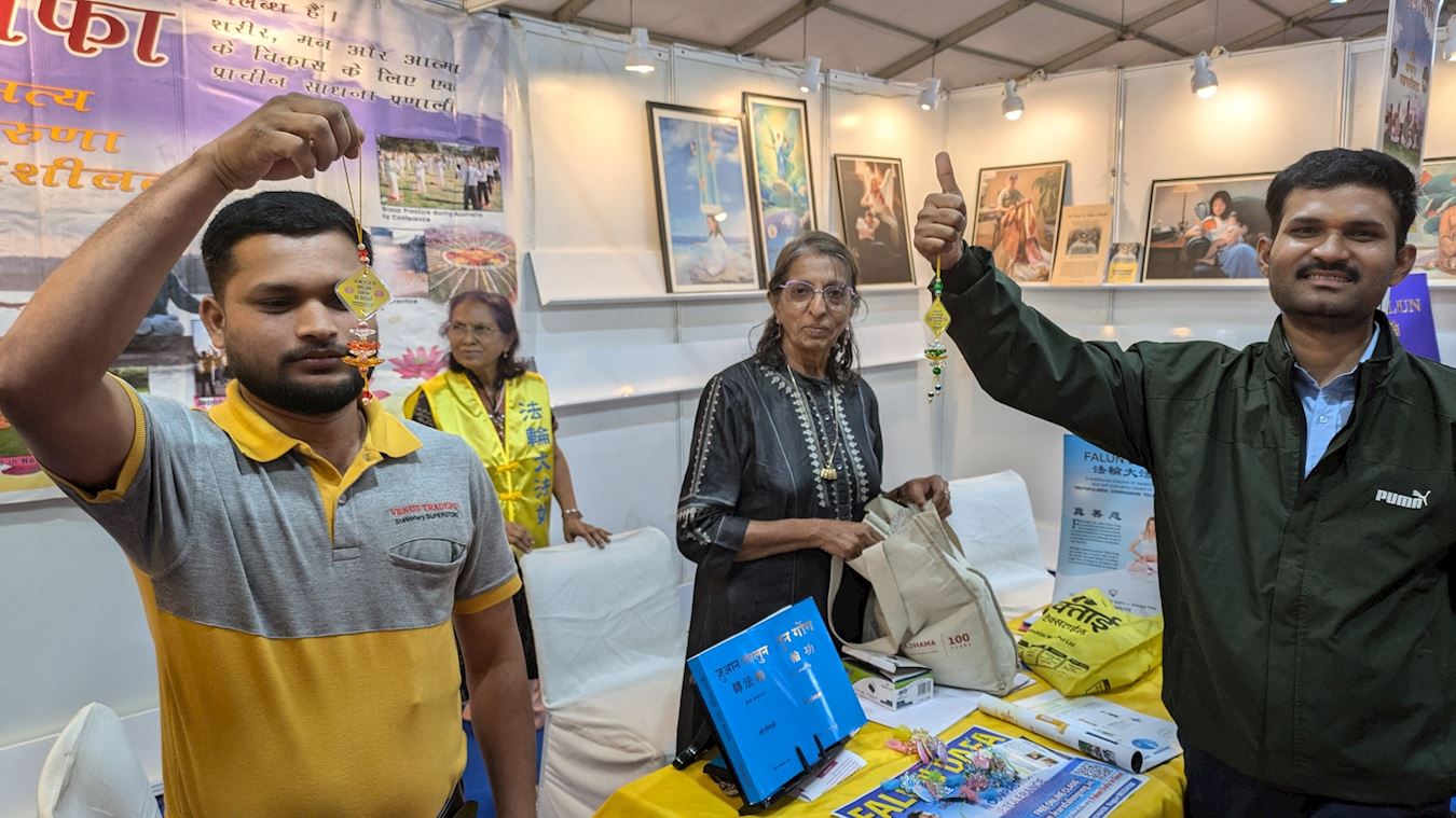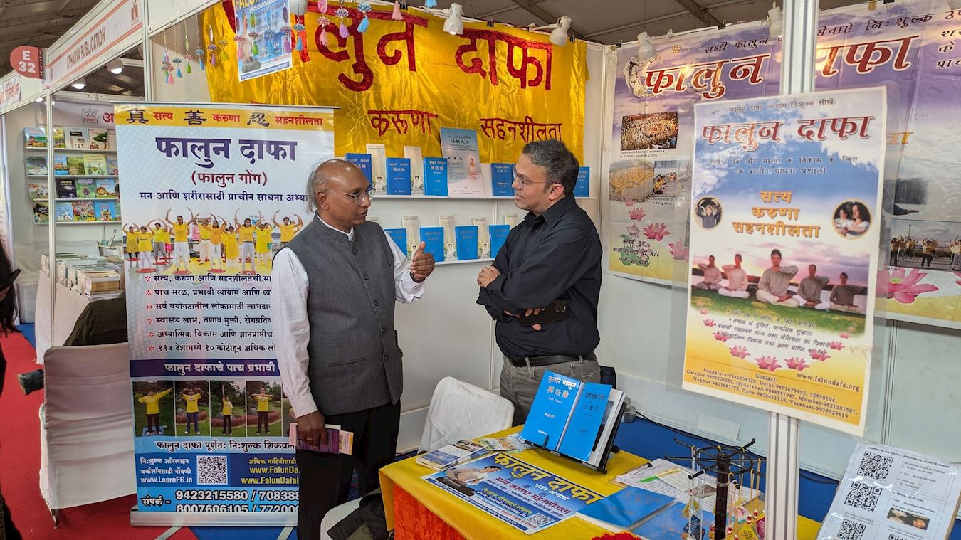 当地的一位出版商和他的工作人员在法轮大法展位的对面摆设展位,他们每天与学员交谈互动,并赞扬法轮功学员们付出的努力。他们的经理赫曼特·贾达夫 (Hemant Jadhav) 说,他“总能在法轮大法展位找到平和与宁静的环境”。