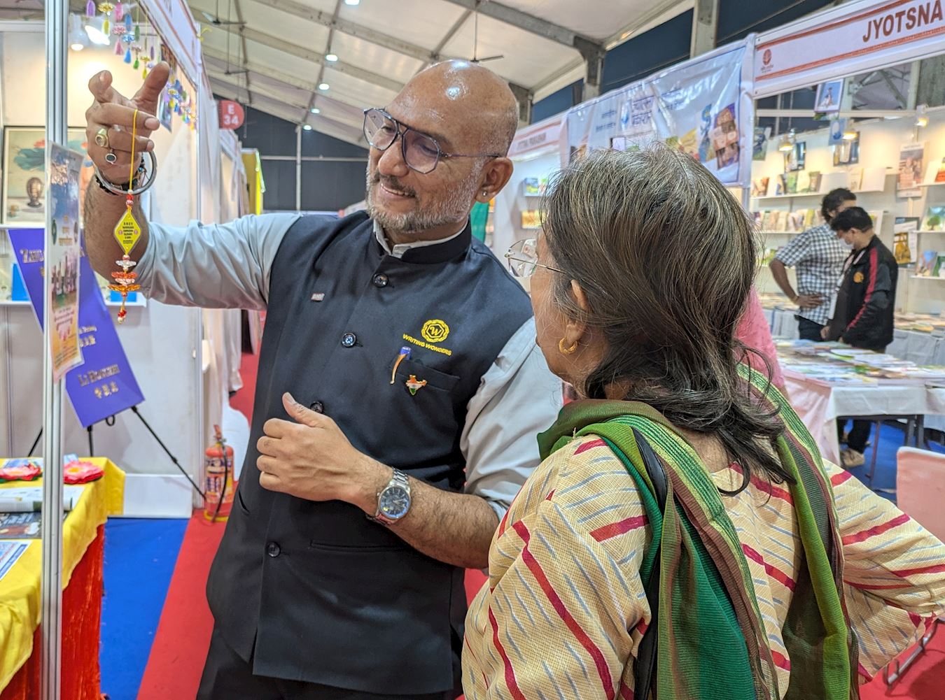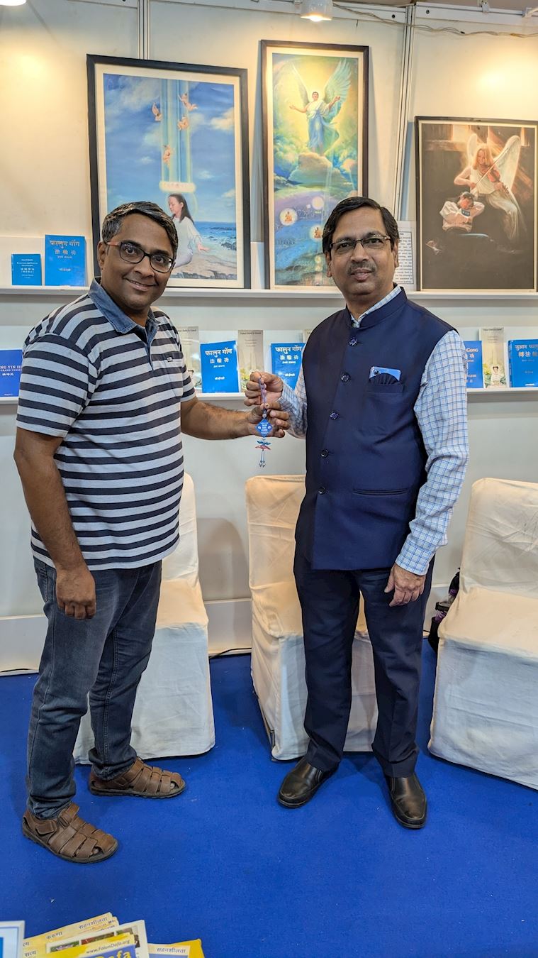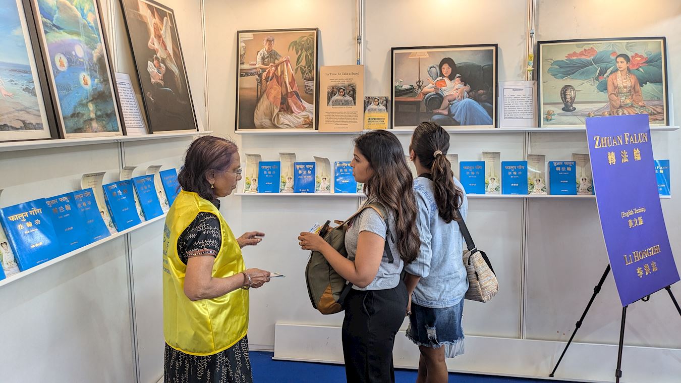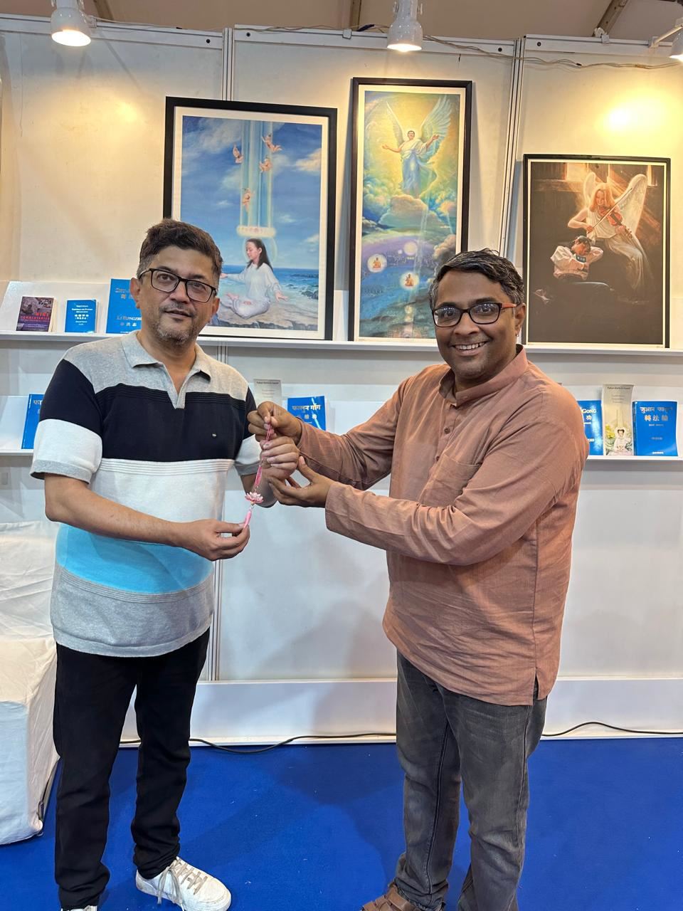 当地的一位出版商和他的工作人员在法轮大法展位的对面摆设展位,他们每天与学员交谈互动,并赞扬法轮功学员们付出的努力。他们的经理赫曼特·贾达夫 (Hemant Jadhav) 说,他“总能在法轮大法展位找到平和与宁静的环境”。