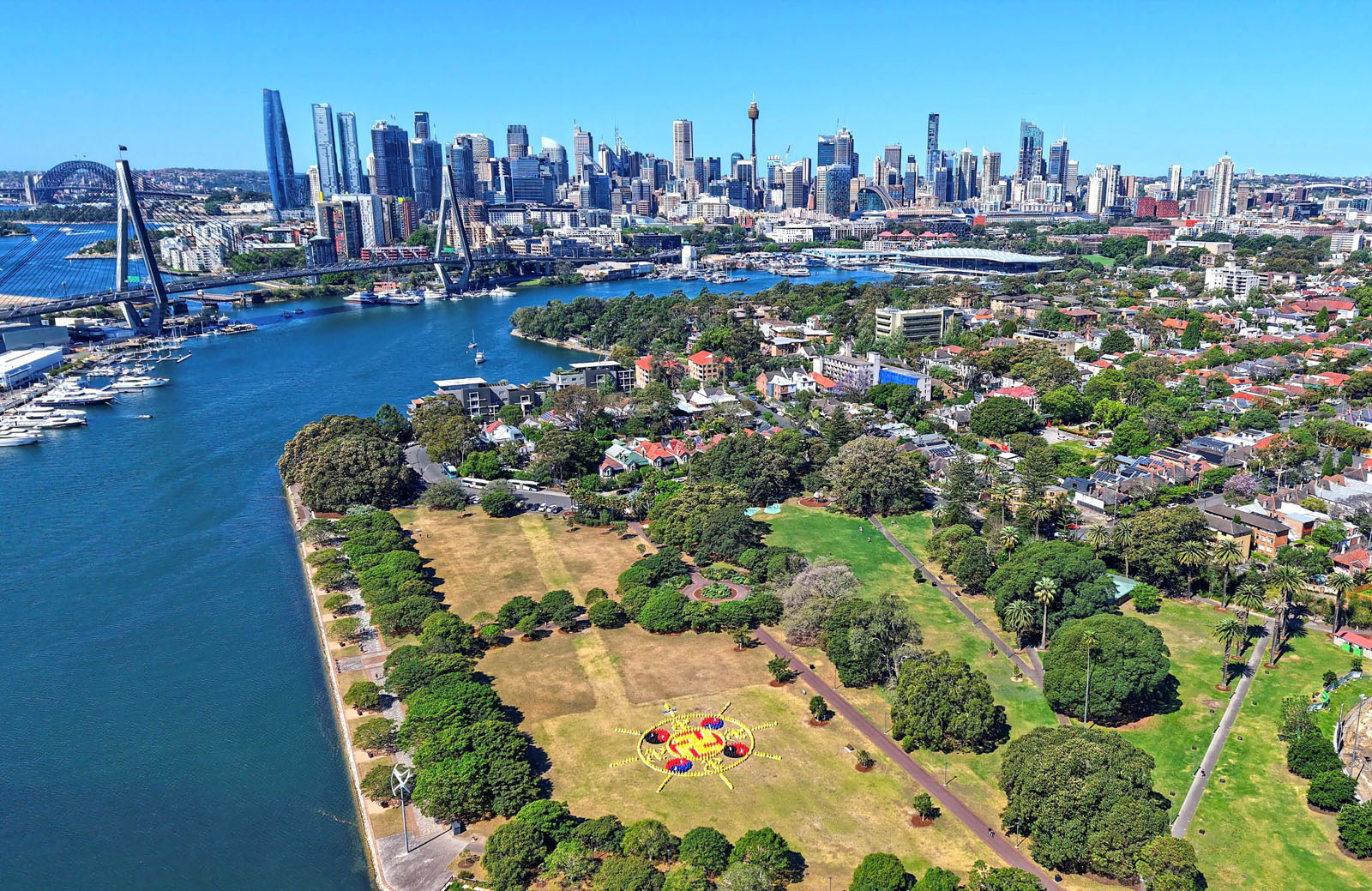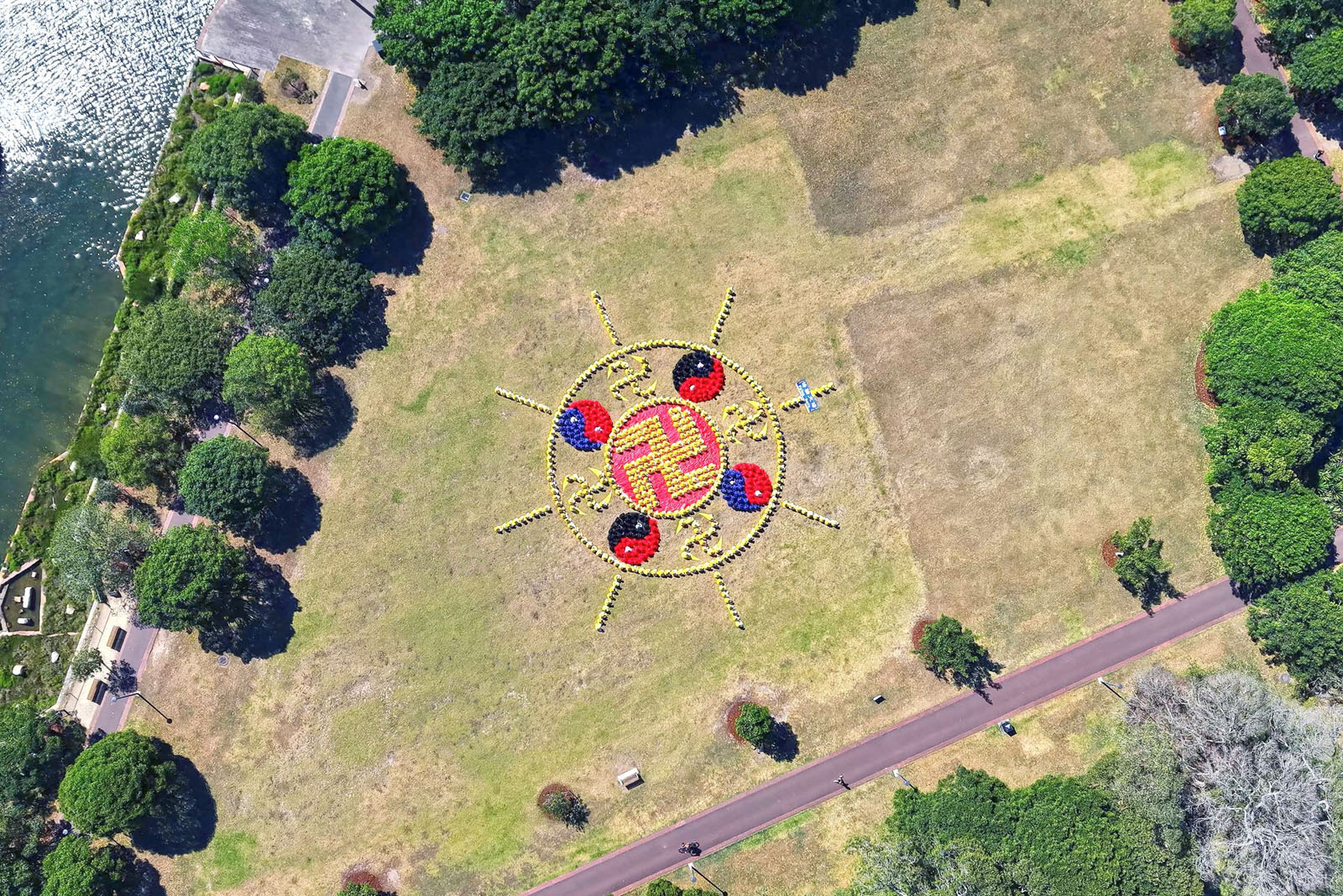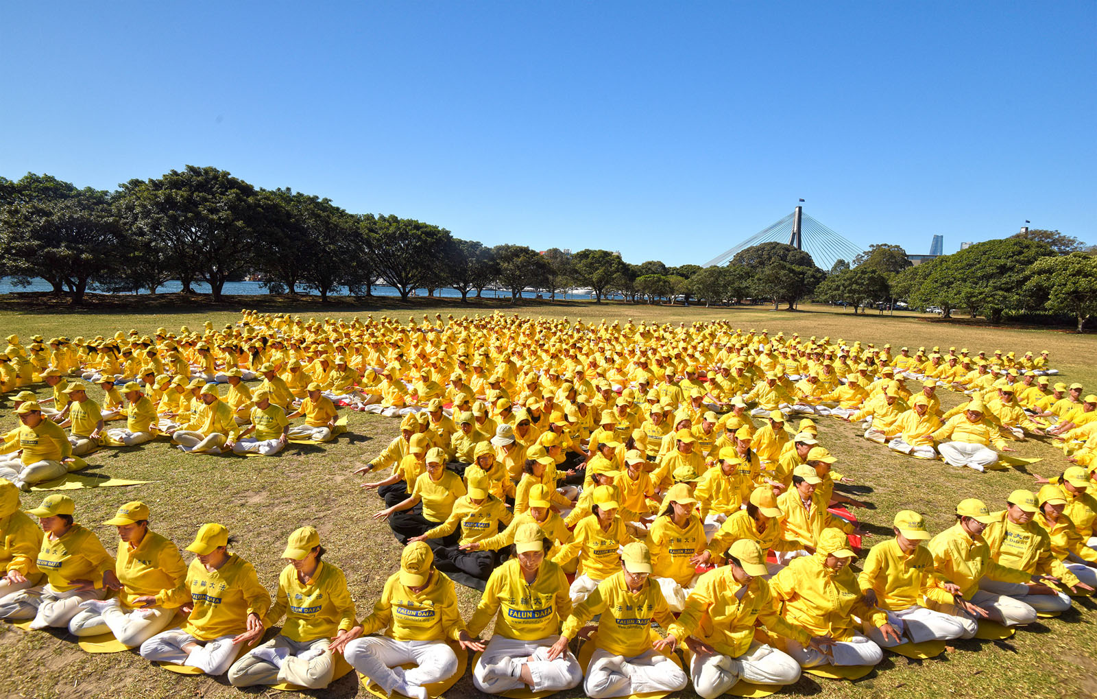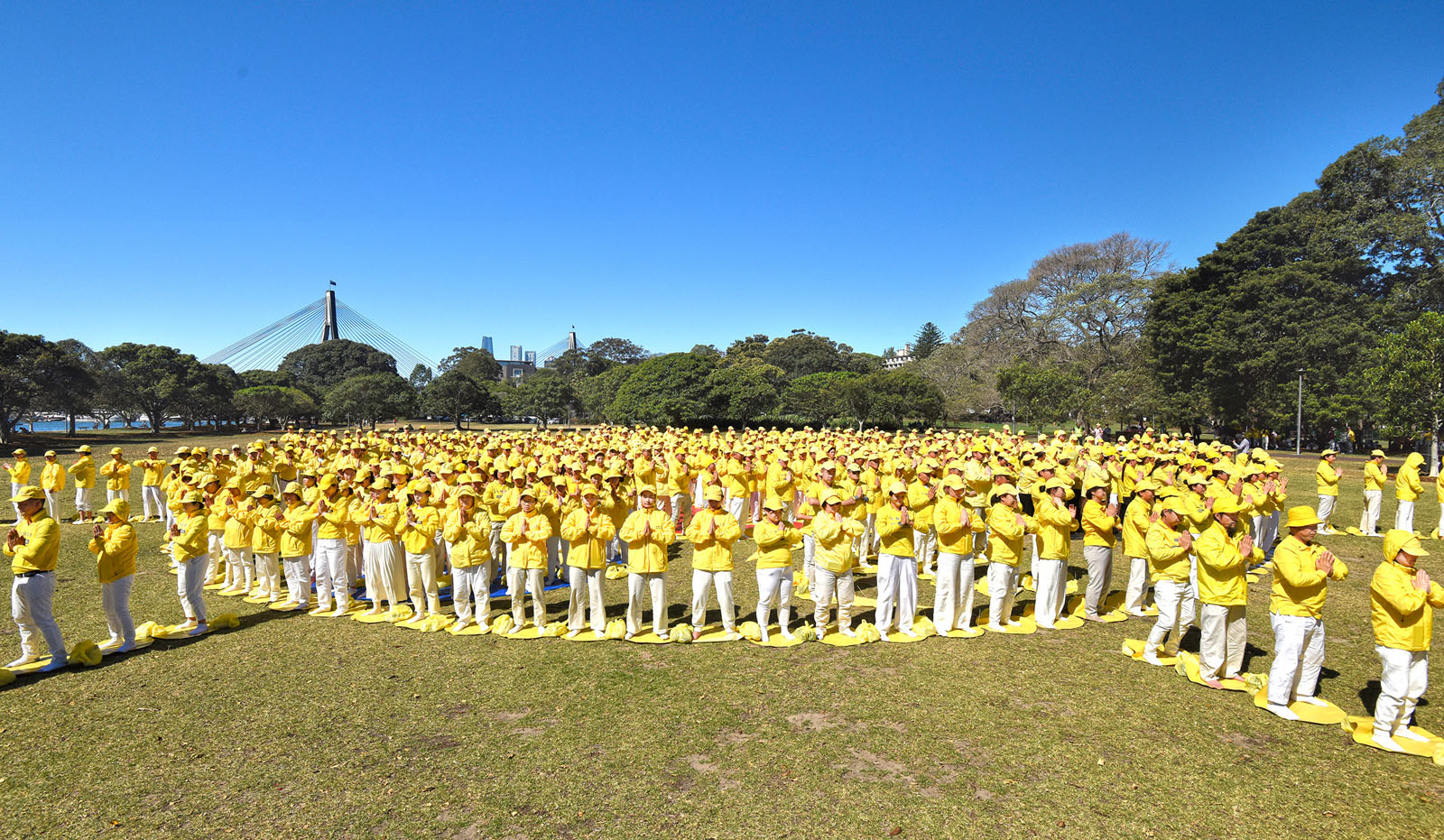 来自澳洲各地的法轮功学员,身穿不同颜色服装,整齐有序地走进场地,排出内径24米的巨大法轮图形,加上金光四射的外围,直径达37米。大法轮由两个上红下黑、两个上红下蓝的太极图和金色的卍字符组成。作为法轮大法的标记,法轮图形也是十方世界宇宙的缩影。从公园上空俯瞰,金色法轮图形在天地间熠熠生辉,十分壮观。