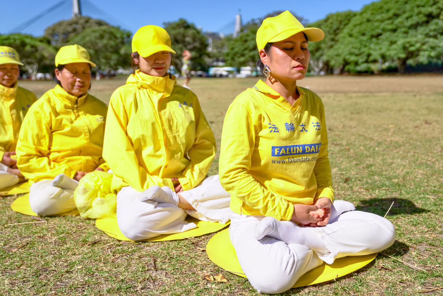 伴随着悠扬的炼功音乐,现场参加排图的法轮功学员展示了法轮大法的五套功法。虽然天气炎热,学员们仍然平静有序地排字、炼功,祥和慈悲的能量场使路过的居民与游客十分感叹。