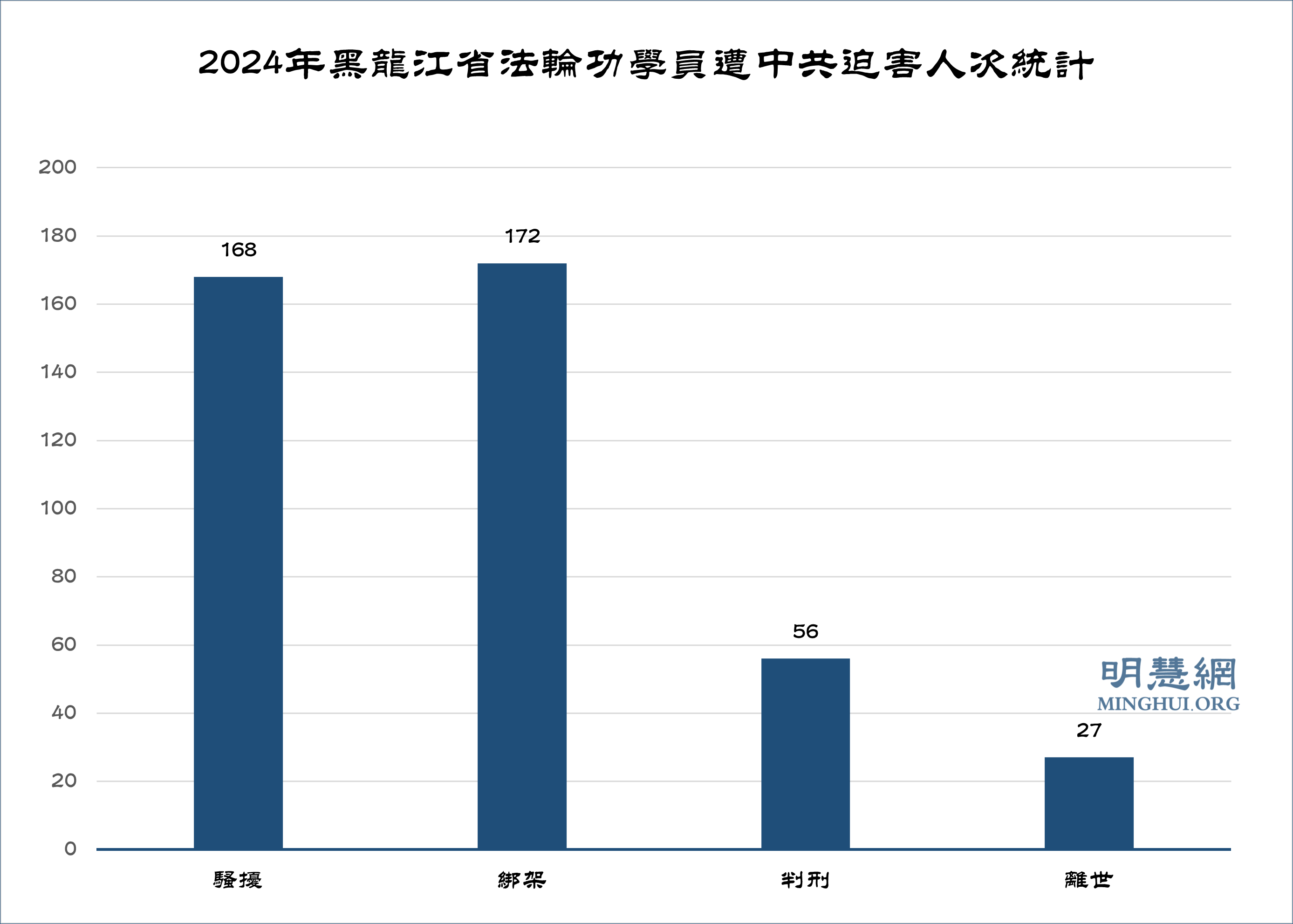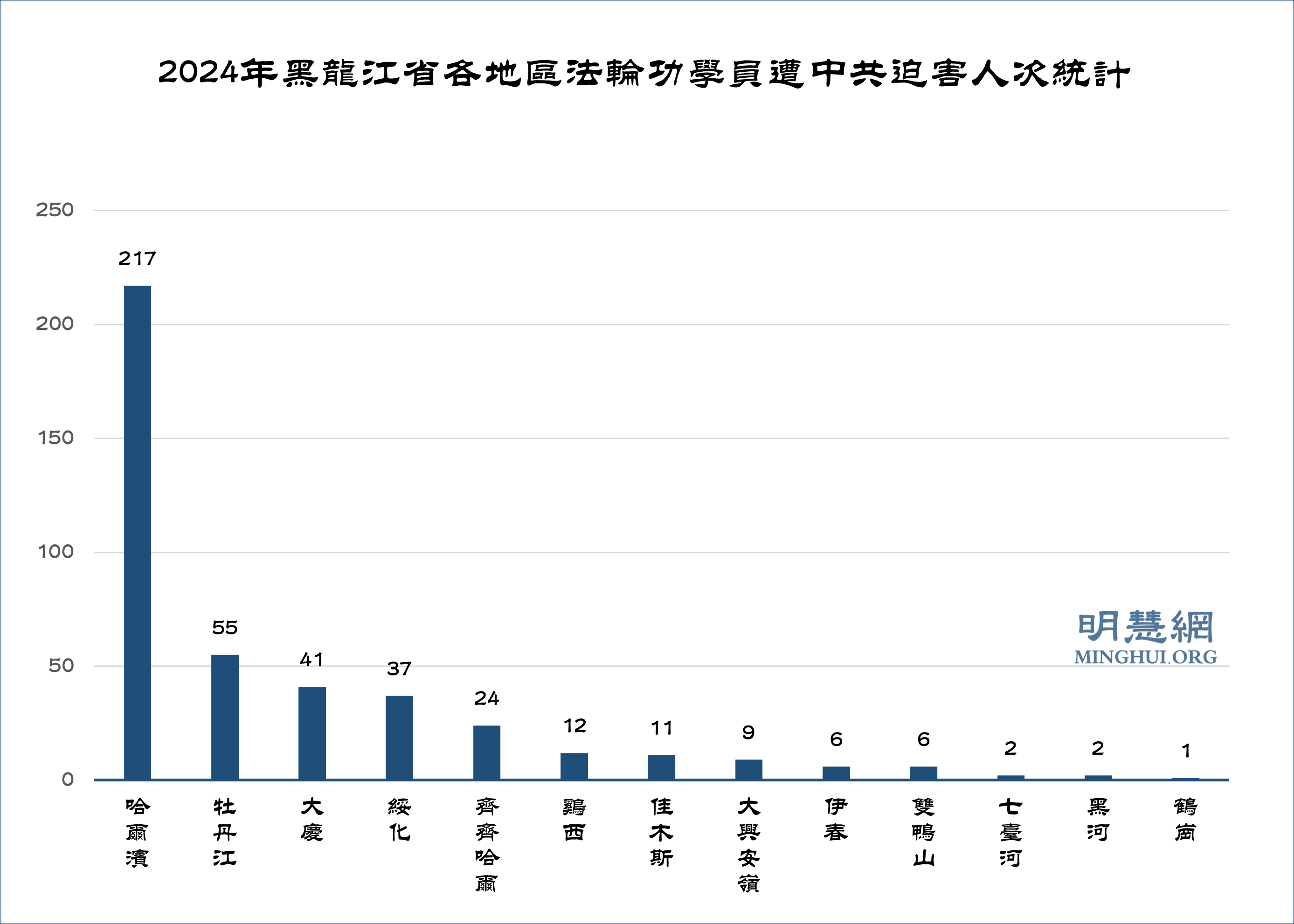 ![]() 图1:2024年黑龙江省法轮功学员遭中共迫害人次统计 |