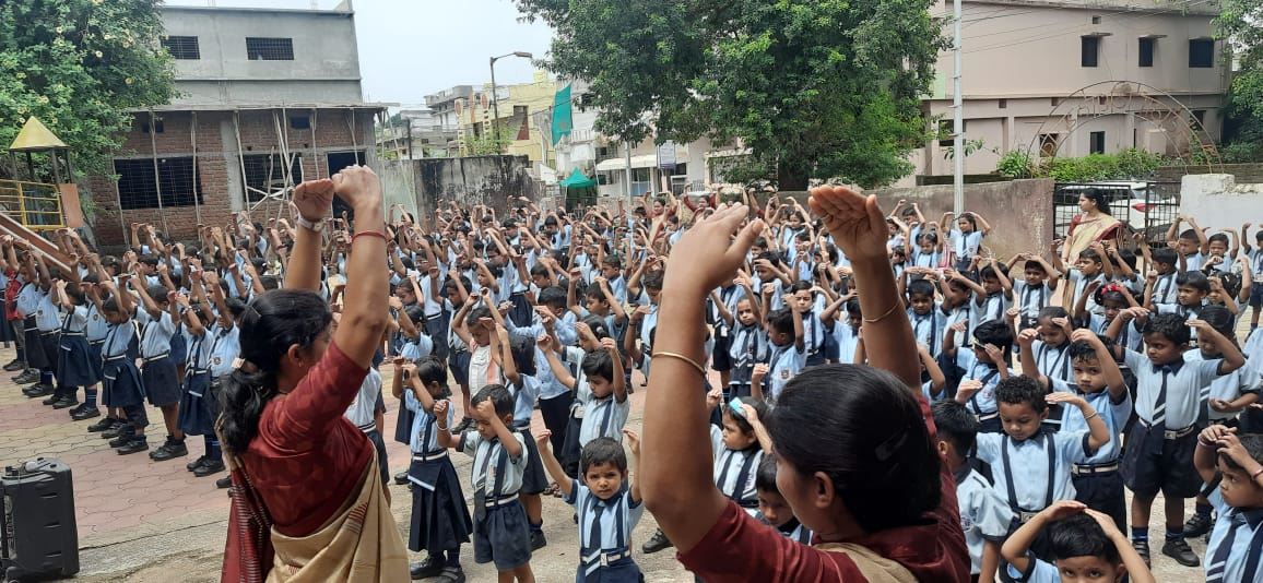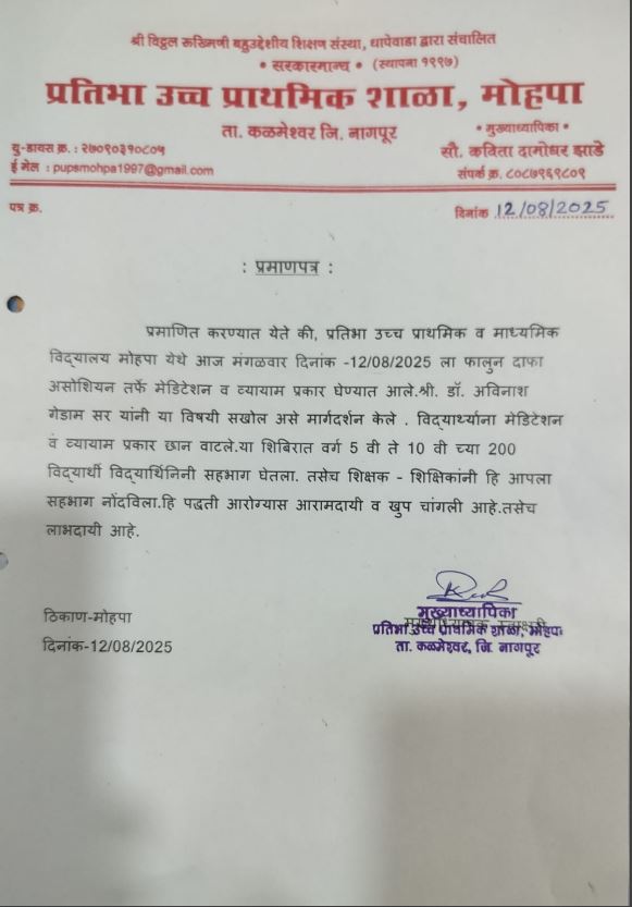 “兹证明,二零二五年八月十二日,星期二,阿维纳什·格达姆博士(Dr. Avinash Gedam)和法轮大法学员在莫赫帕的普拉蒂巴高级小学与中学教法轮大法功法。