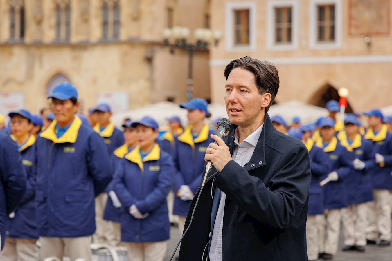 ![]() 图13:捷克法轮大法学会发言人雷奥什·斯特尔纳德在旧城广场发言。 |