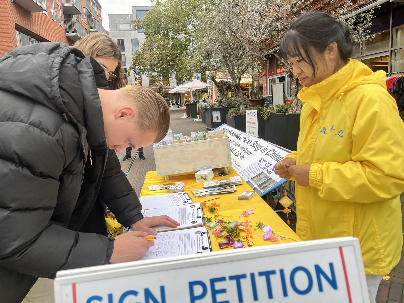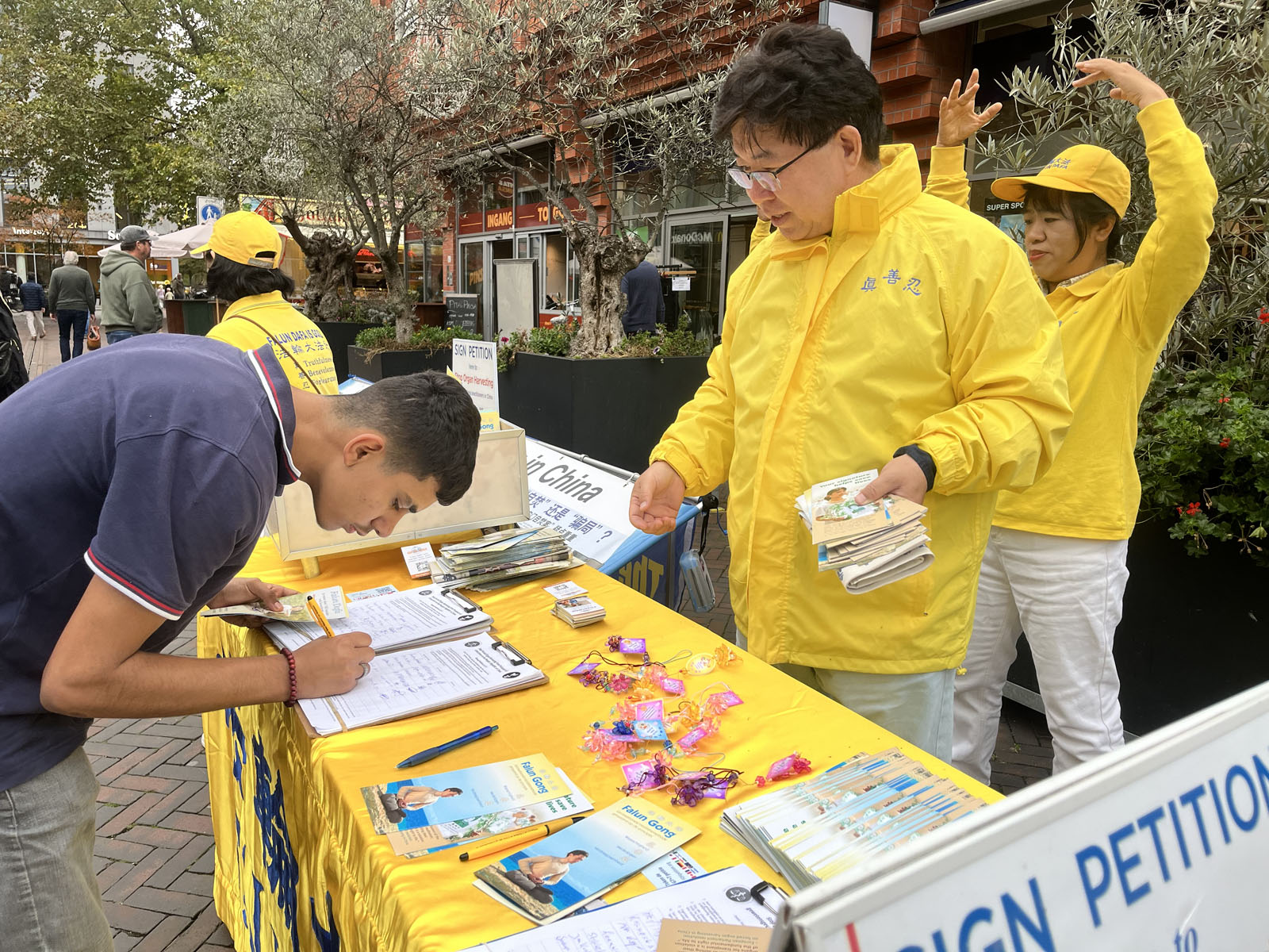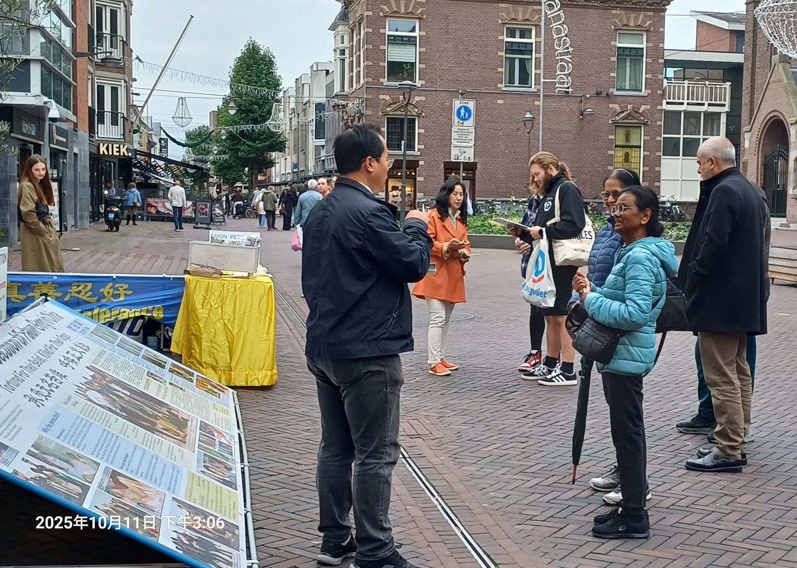 莱茵河畔阿尔芬(Alphen aan den rijn)是南荷兰省(Zuid Holland)的一个市镇。拥有约十二万居民,总面积为一百三十二平方公里。中午时分,学员们在尤利娅娜街(Julianastraat)布置真相展板,展示法轮功五套功法,与民众讲述真相,向民众征集反对迫害的签名。人们认真跟着学炼功动作,向学员了解大法真相。