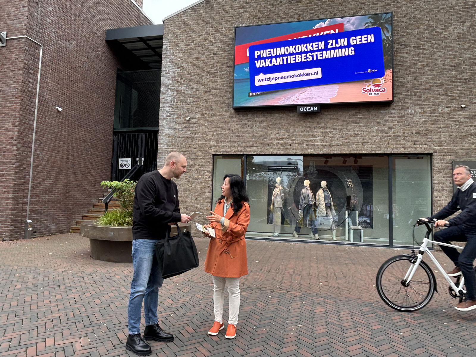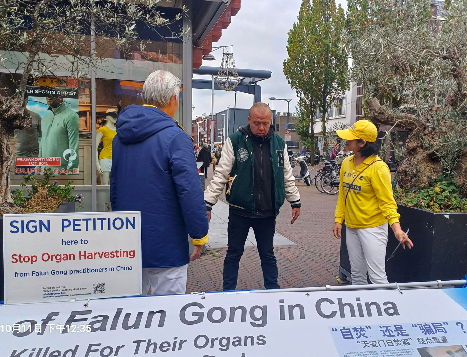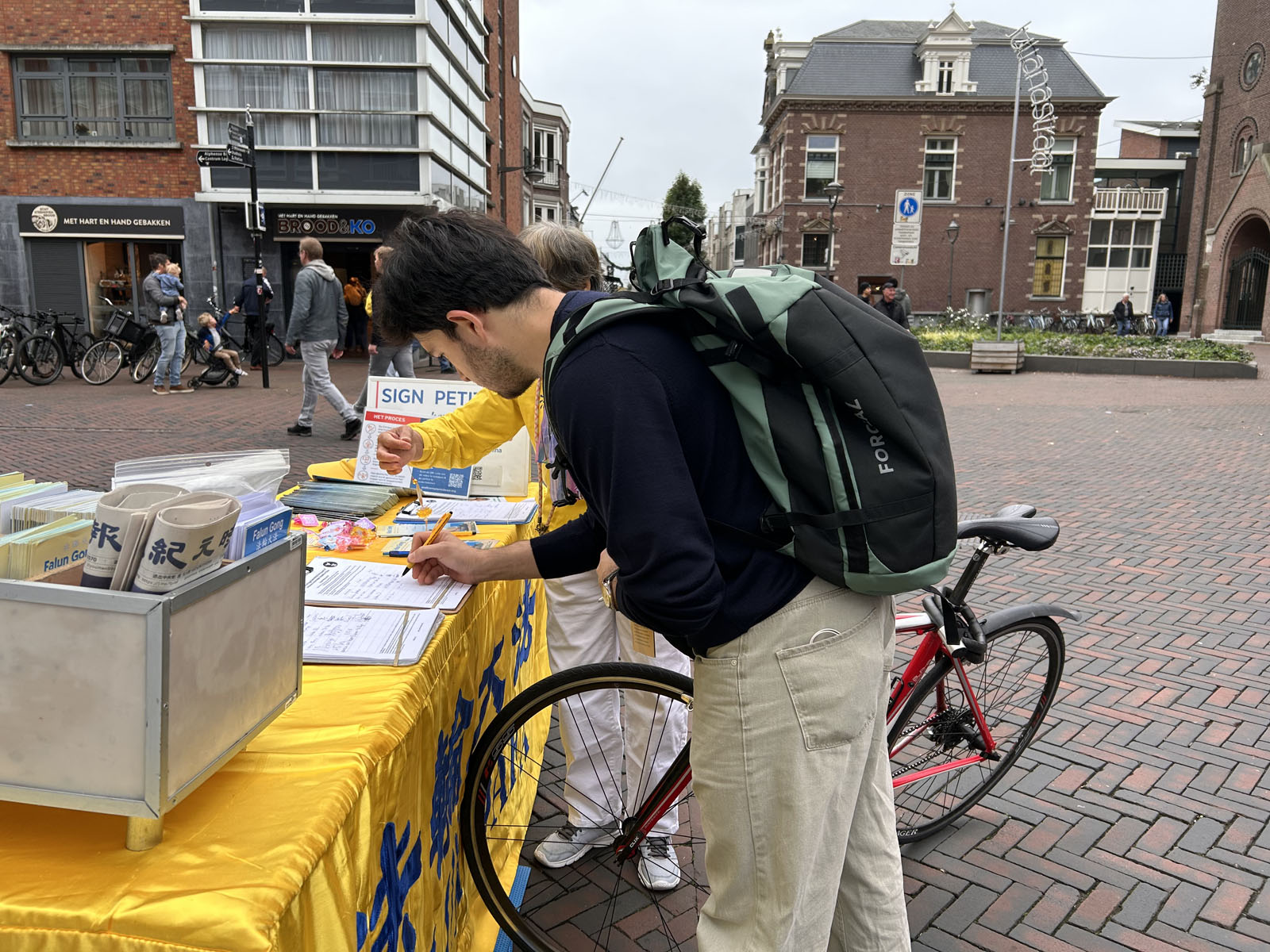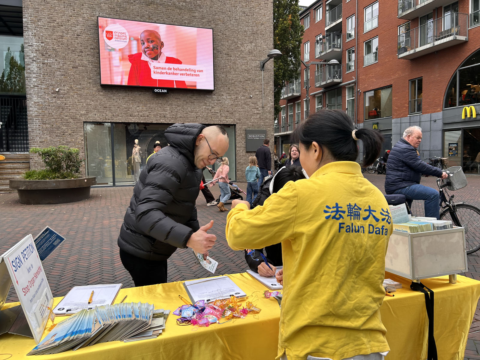 莱茵河畔阿尔芬(Alphen aan den rijn)是南荷兰省(Zuid Holland)的一个市镇。拥有约十二万居民,总面积为一百三十二平方公里。中午时分,学员们在尤利娅娜街(Julianastraat)布置真相展板,展示法轮功五套功法,与民众讲述真相,向民众征集反对迫害的签名。人们认真跟着学炼功动作,向学员了解大法真相。