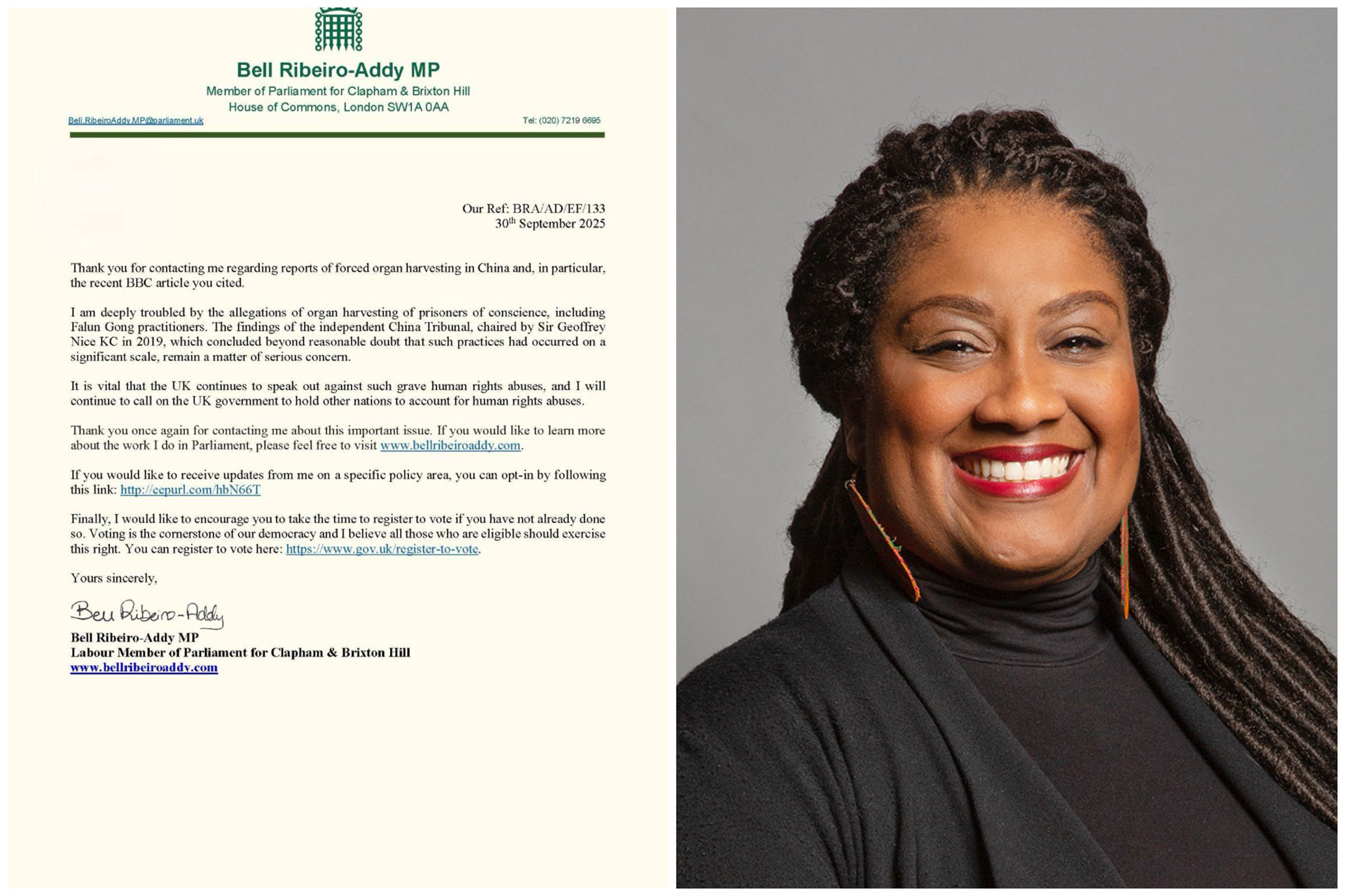 国会议员贝尔·里贝罗-阿迪(Bell Ribeiro-Addy)在信中表示:“关于针对良心犯(包括法轮功学员)遭受器官摘取的指控,我感到极为不安。由杰弗里·奈斯爵士 KC 在2019年主持的独立‘中国法庭’的调查结果认定——在毫无合理怀疑的情况下——这种行为确实在大规模发生。这一结论至今仍令人严重关切。”