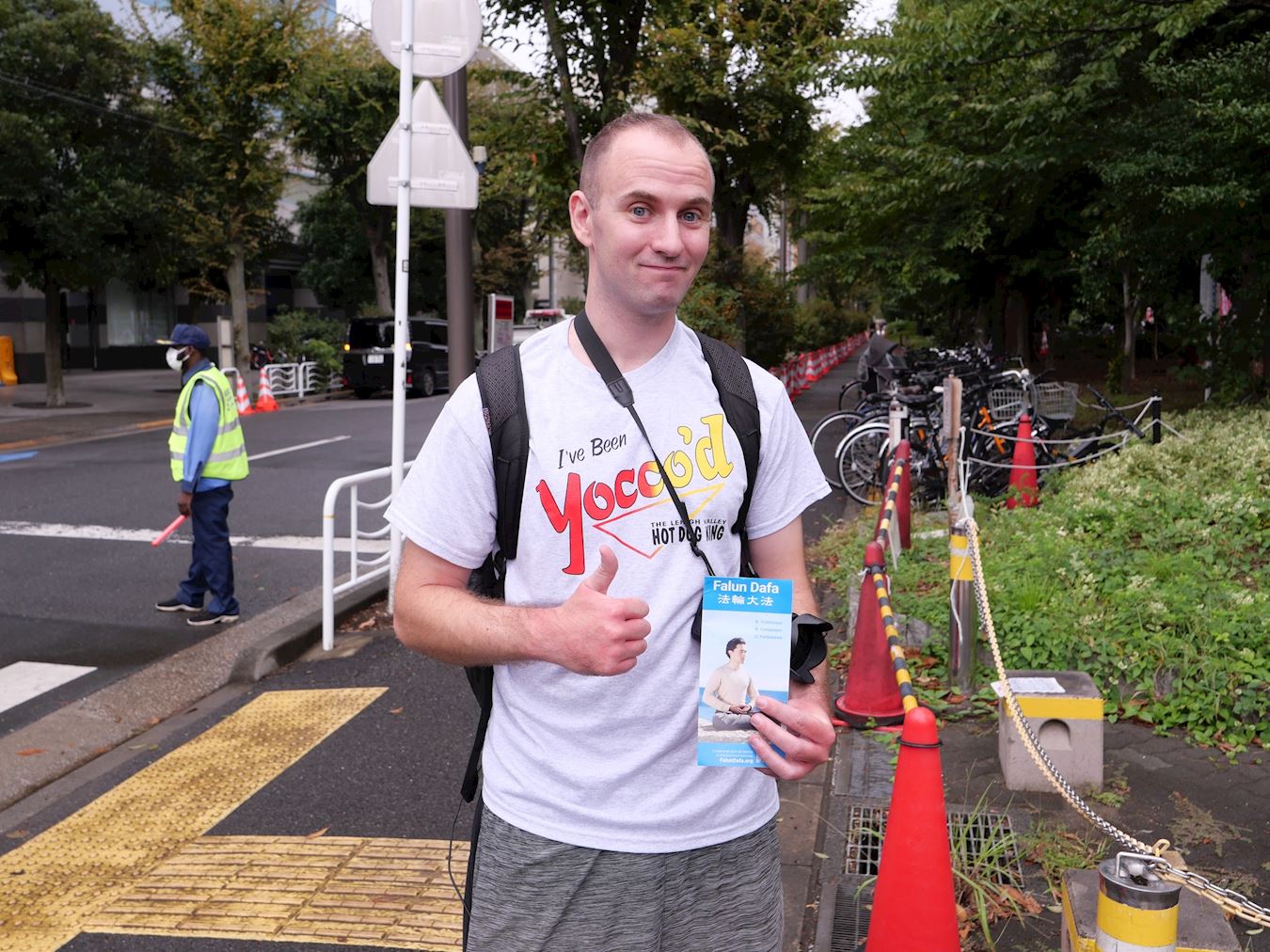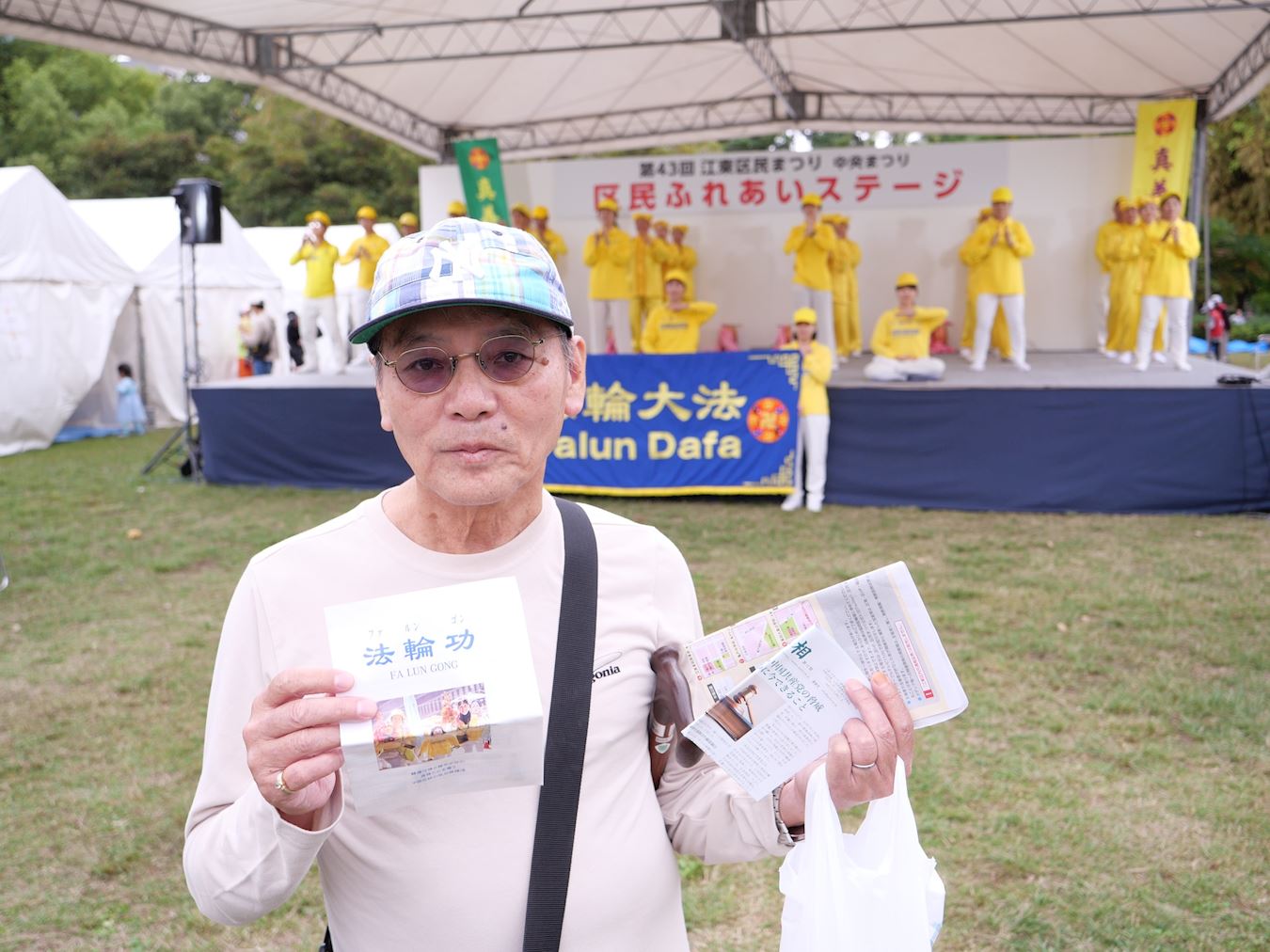 观看完学员们的舞台表演后,山下部先生说:“我家附近有个公园,每天早上都有法轮功学员在打坐。我认为,法轮功受到中共的迫害是个大问题。昨天我也来参加了活动,并拿到了法轮功的资料阅读。学员们经常在主要车站派发资料,所以我也因此了解了关于活摘的真相。”