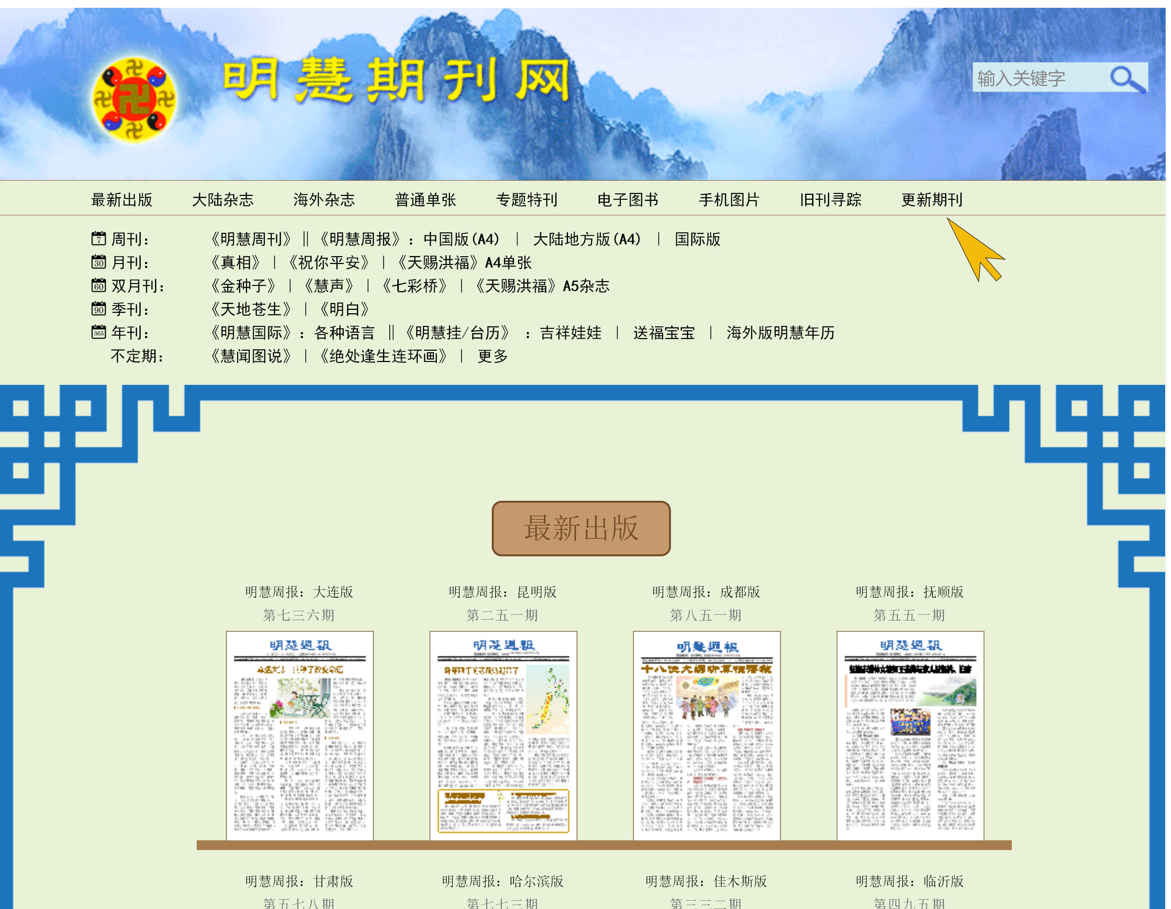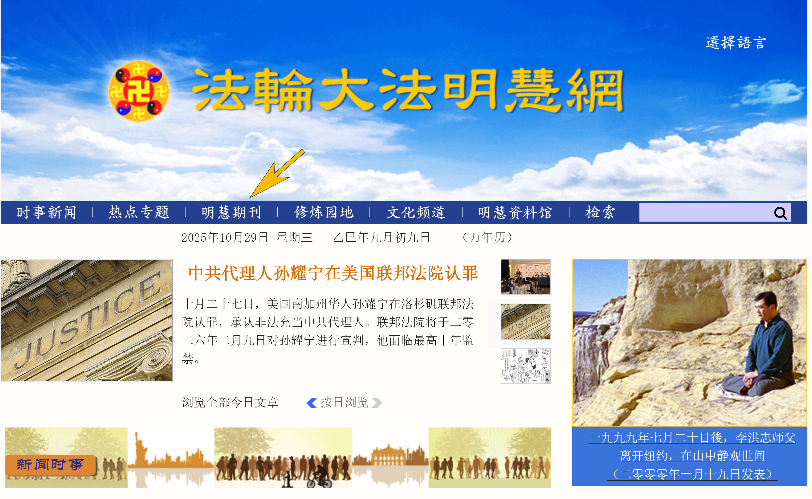 打开明慧网主页后,在最上一行,左数第三项“明慧期刊”,如下图: