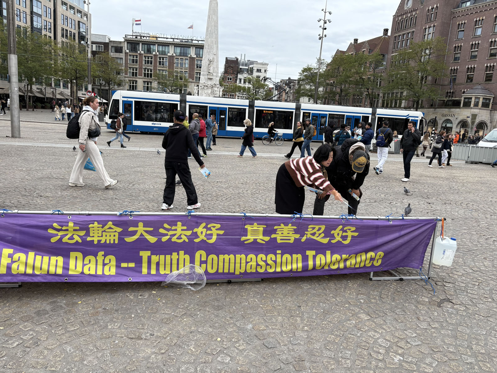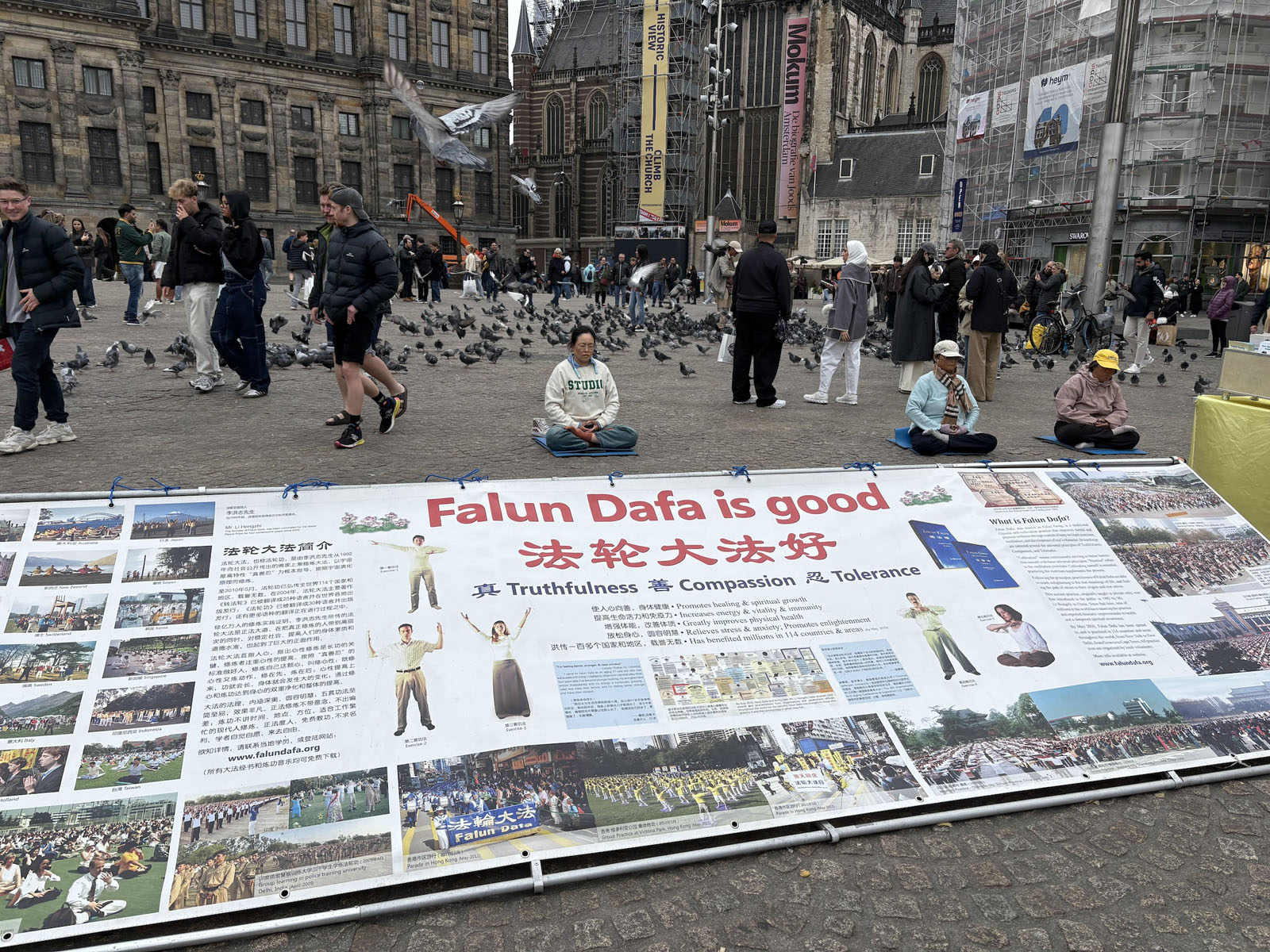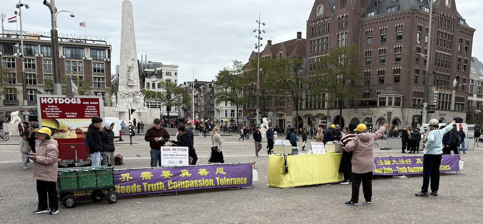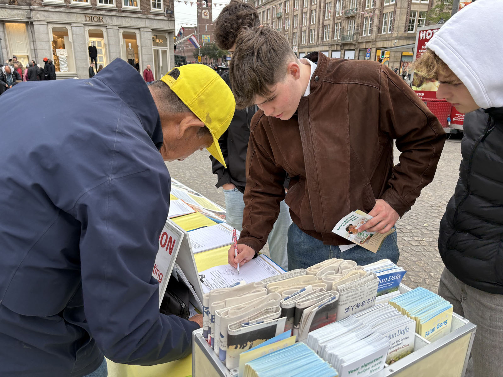 阿姆斯特丹不仅是荷兰的首都,它还拥有悠久的包容、言论自由和人权历史。十月三日,法轮功学员在市中心的水坝广场设立了信息亭,这里是荷兰人和外国游客的观光胜地。许多当地人和游客驻足了解真相。一些人显然被中共迫害的规模和残酷程度所震惊。还有一些人则对法轮功学员的和平抗暴以及法轮大法真、善、忍价值观表示支持。